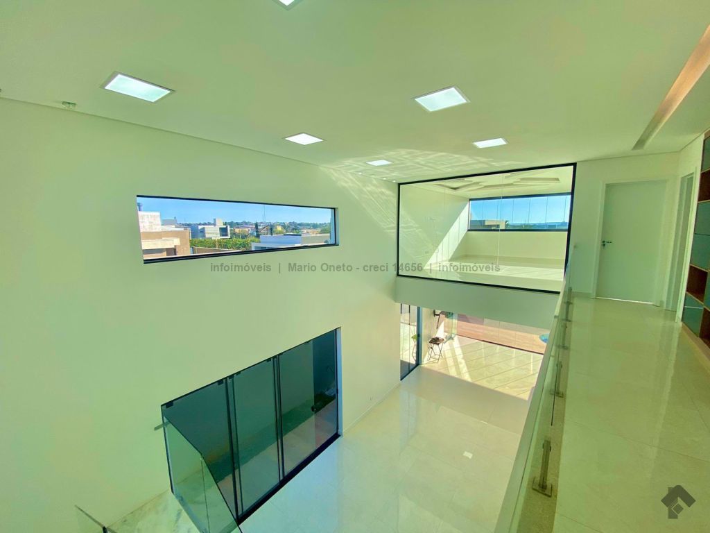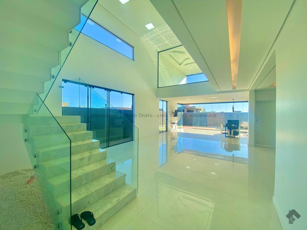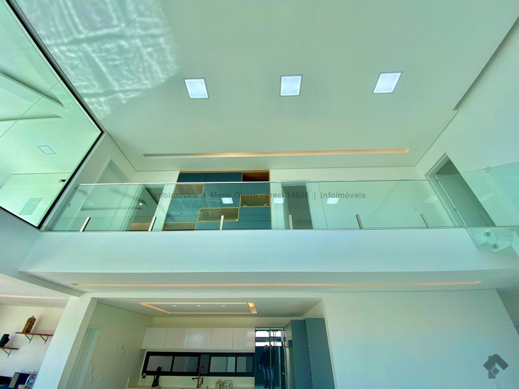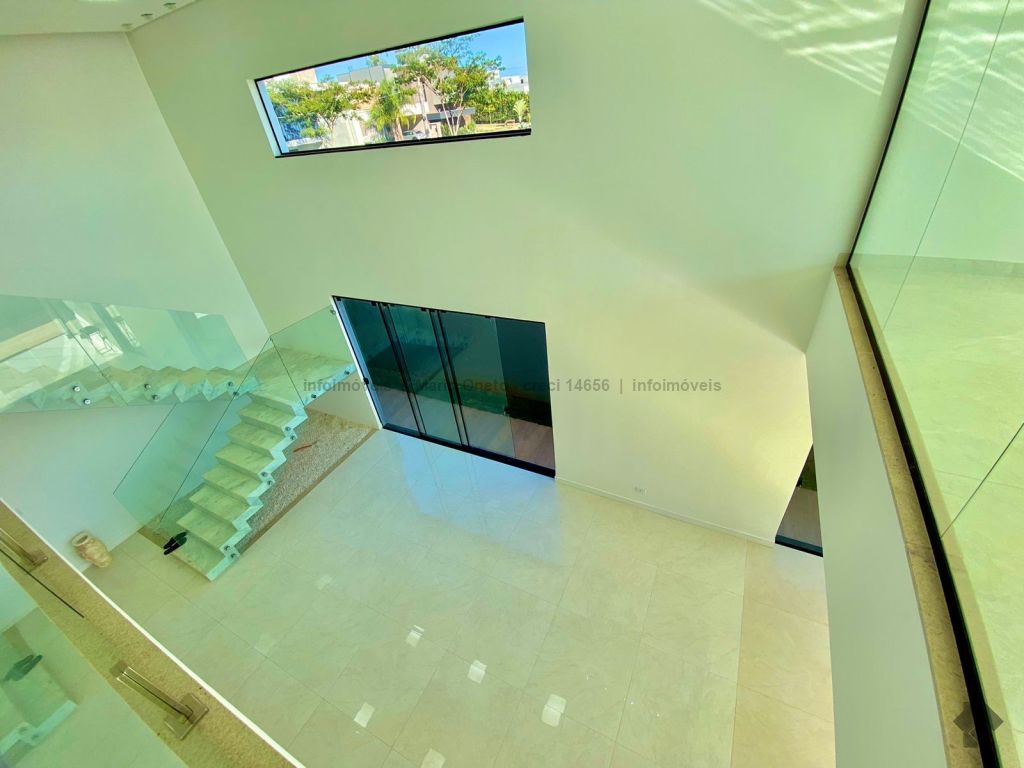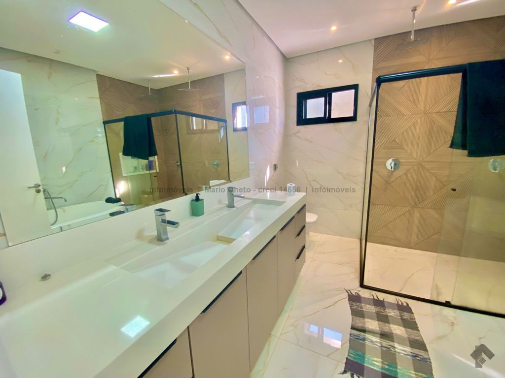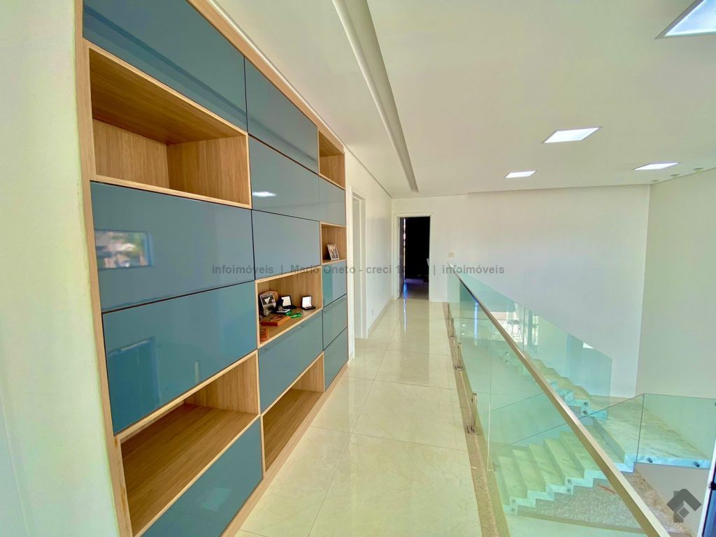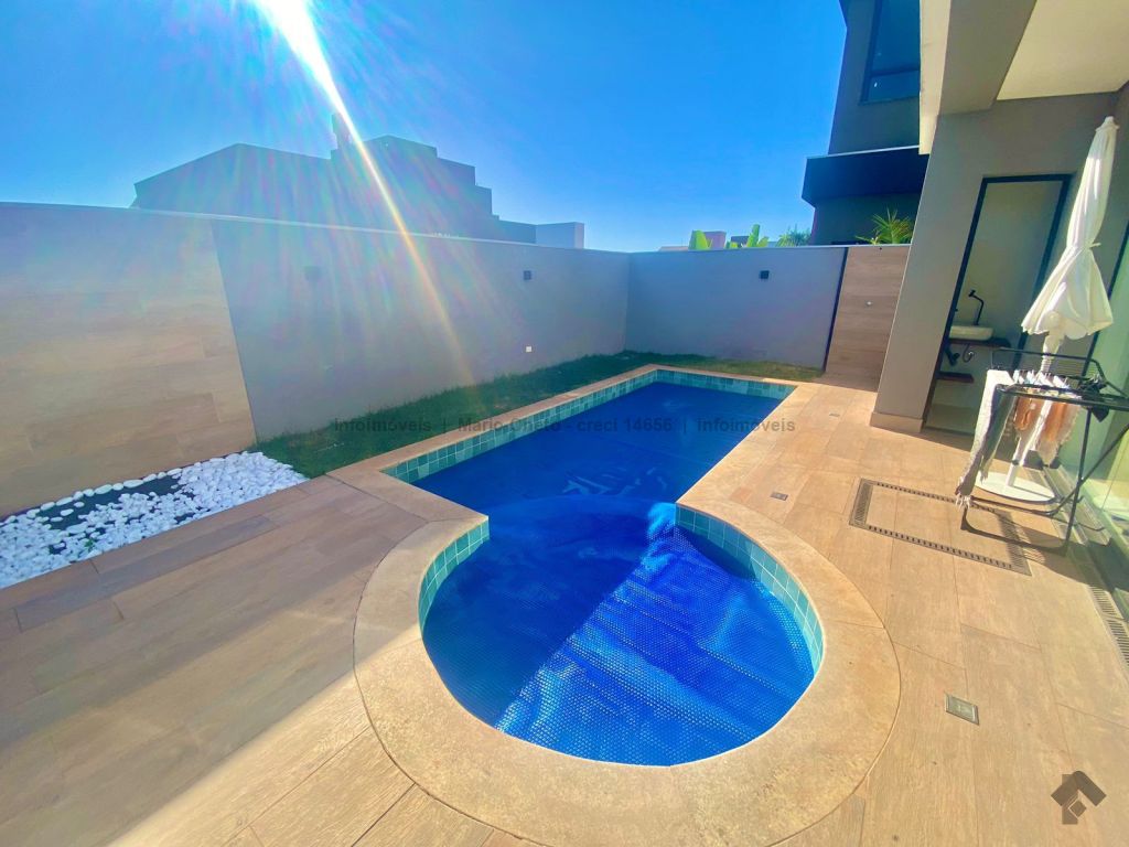 Piso térreo: sala 2 ambientes com pé direito duplo, cozinha americana com armários planejados, interligada ao espaço gourmet com churrasqueira e armários planejados, quarto, banheiro social, escritório, piscina aquecida com hidromassagem, lavanderia com armários planejados, depósito, banheiro da piscina e garagem para 4 carros. Piso superior: suíte master com closet, banheiro com 2 cubas, 2 chuveiros e banheira, e sacada, 2 suítes com armários planejados e sala de TV ampla. Boiler para aquecimento de água.