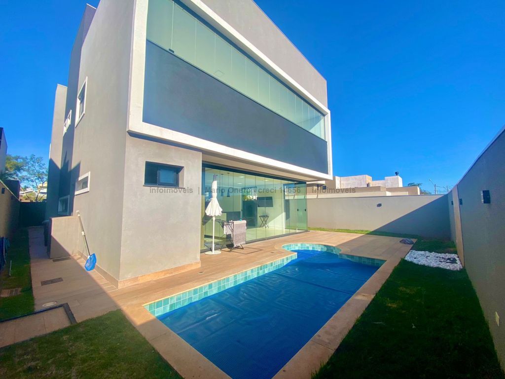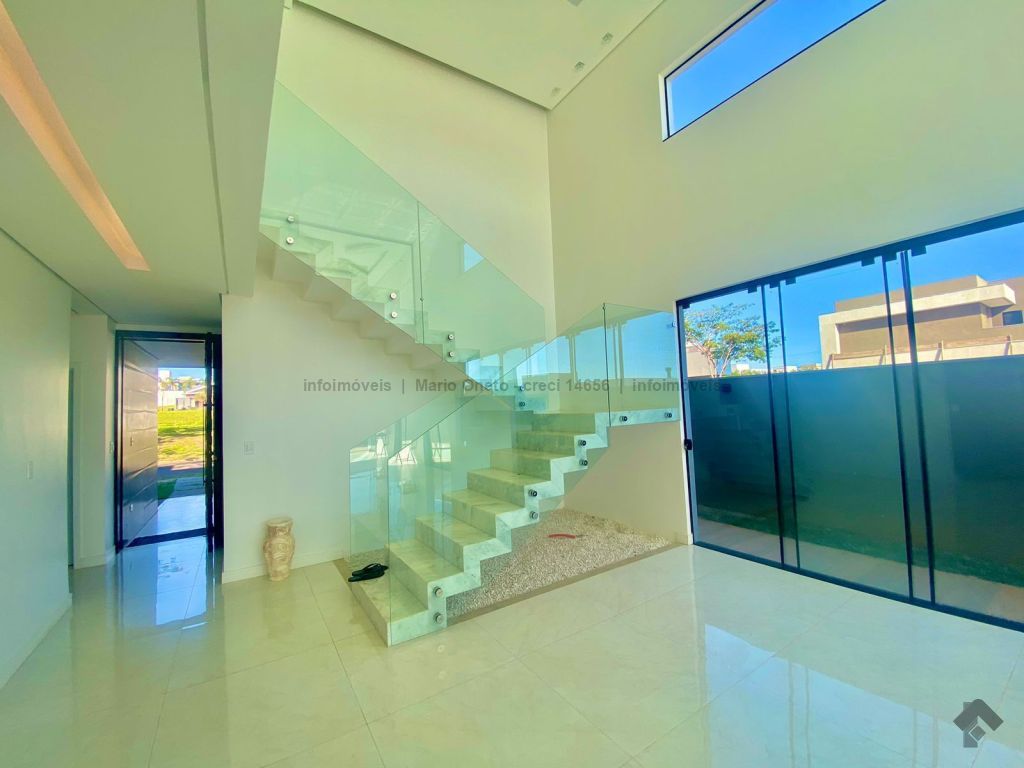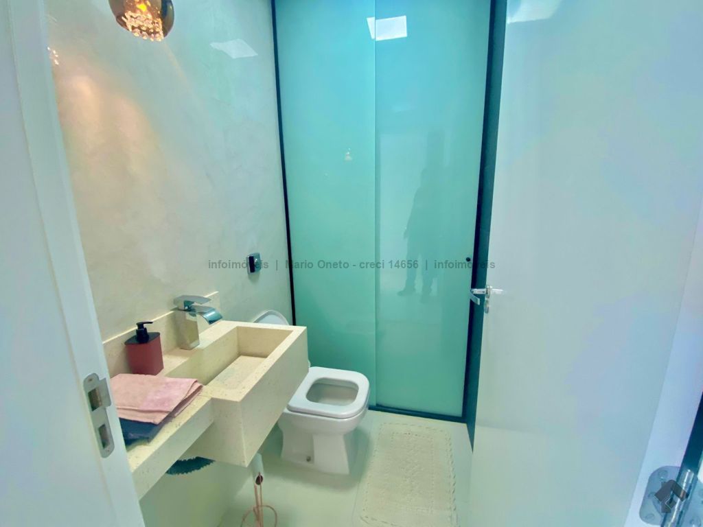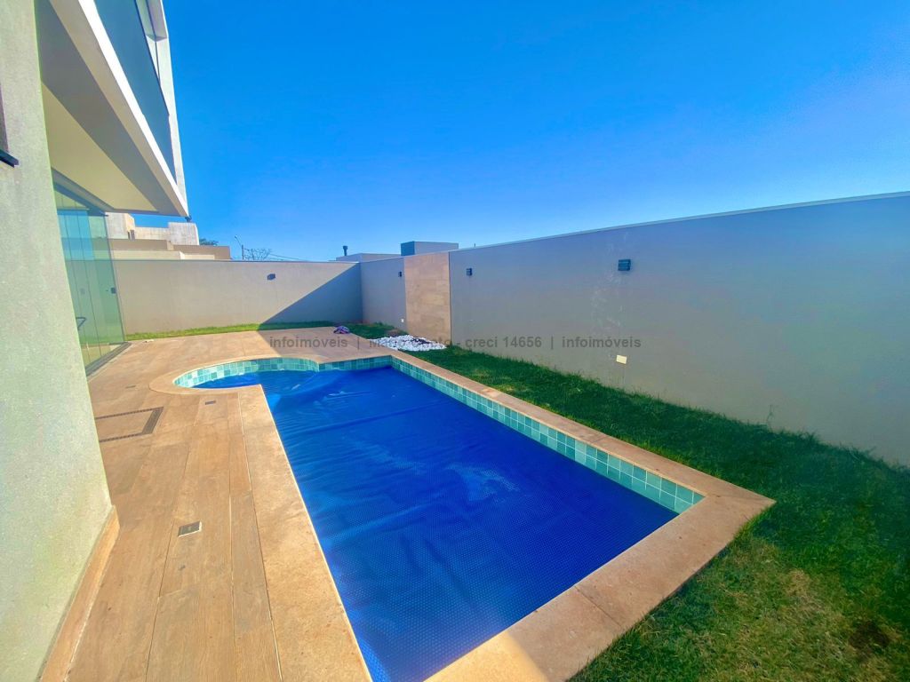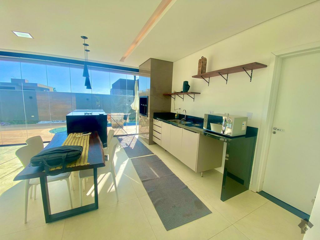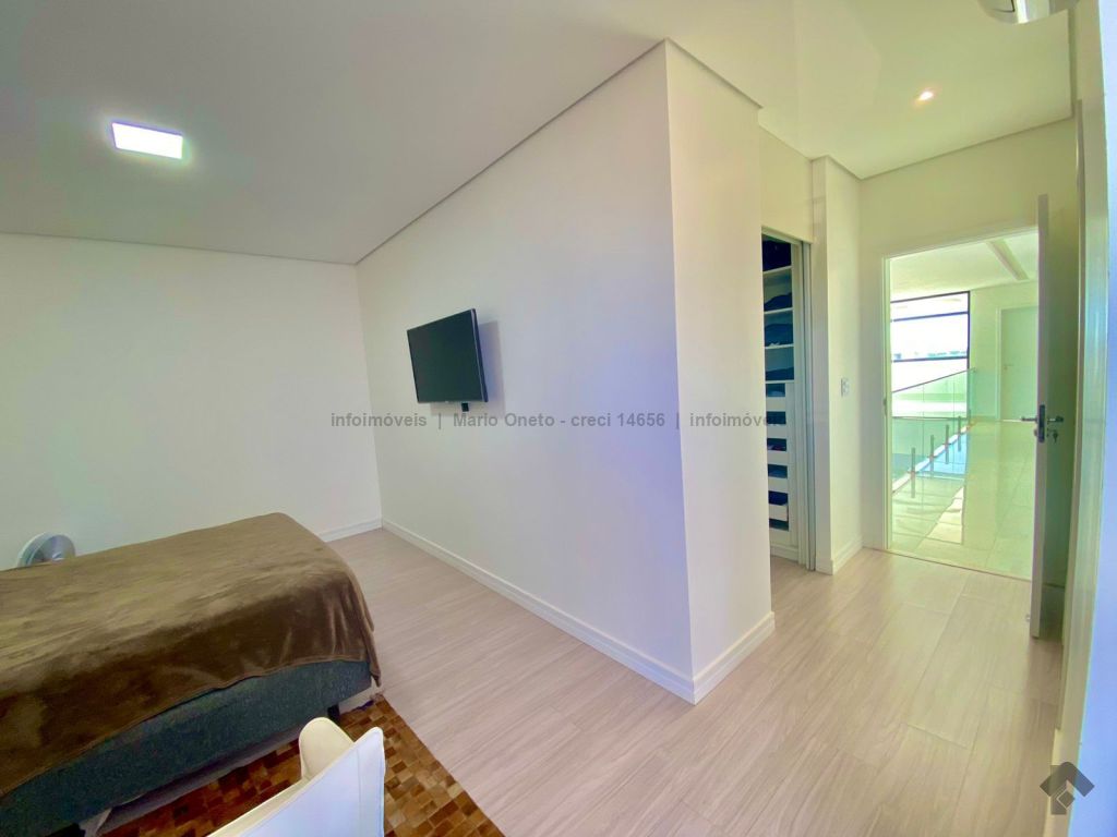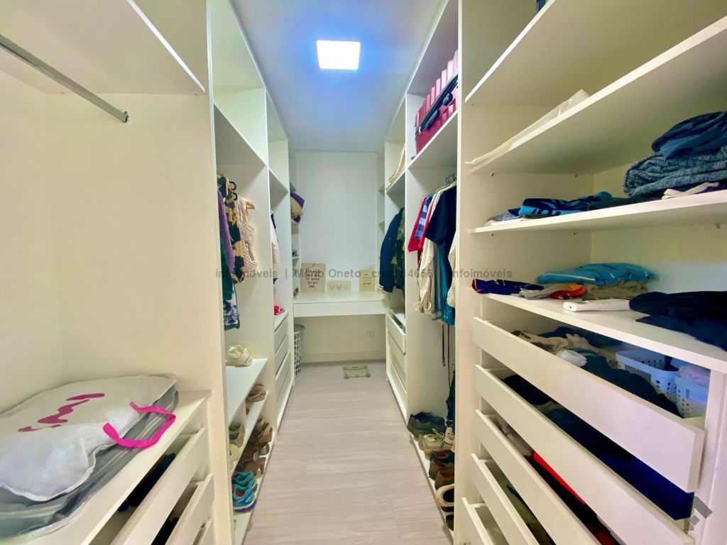 Piso térreo: sala 2 ambientes com pé direito duplo, cozinha americana com armários planejados, interligada ao espaço gourmet com churrasqueira e armários planejados, quarto, banheiro social, escritório, piscina aquecida com hidromassagem, lavanderia com armários planejados, depósito, banheiro da piscina e garagem para 4 carros. Piso superior: suíte master com closet, banheiro com 2 cubas, 2 chuveiros e banheira, e sacada, 2 suítes com armários planejados e sala de TV ampla. Boiler para aquecimento de água.