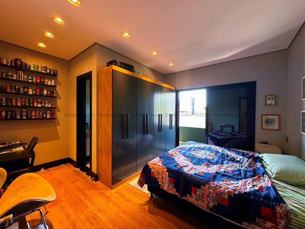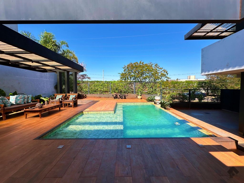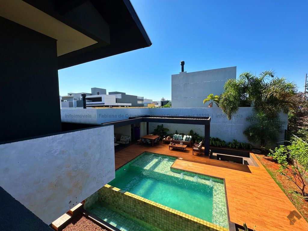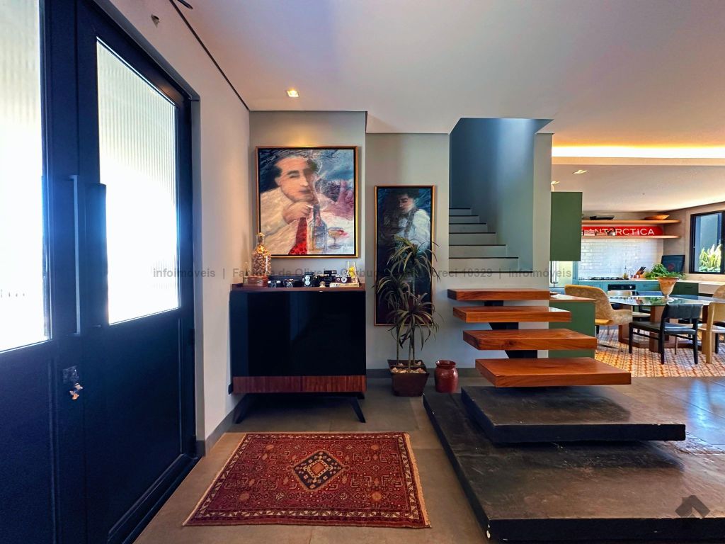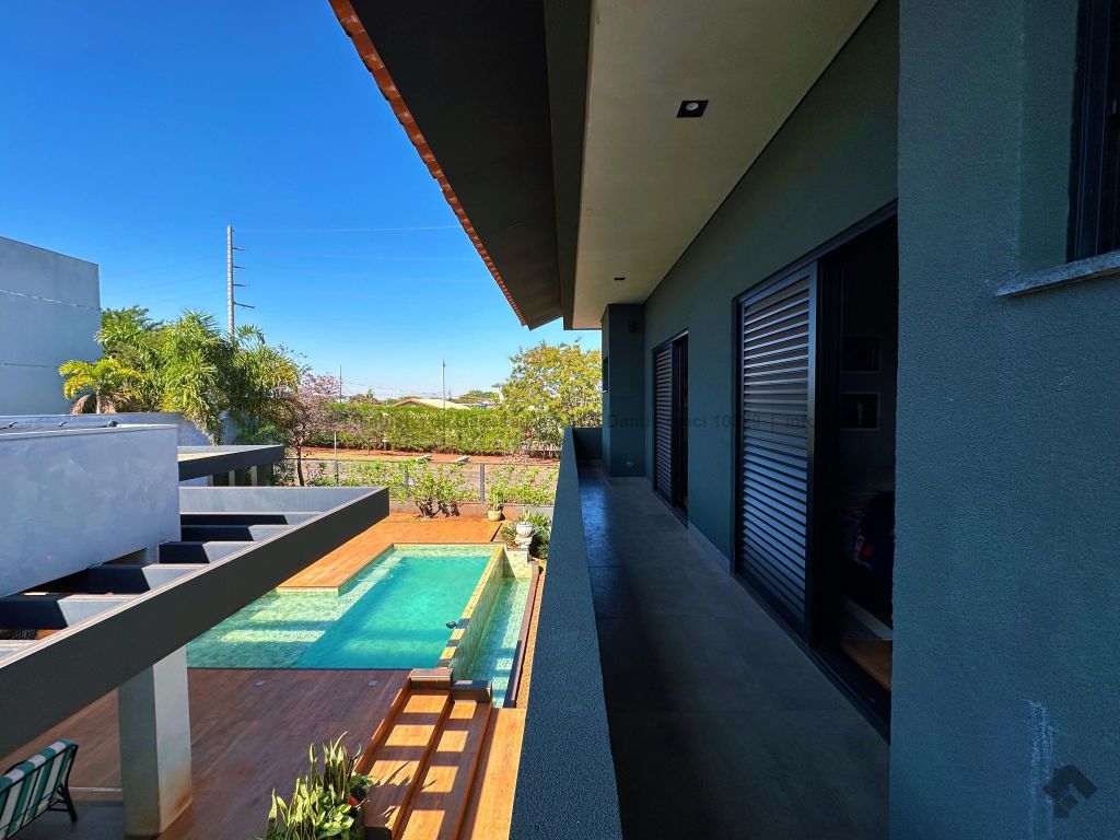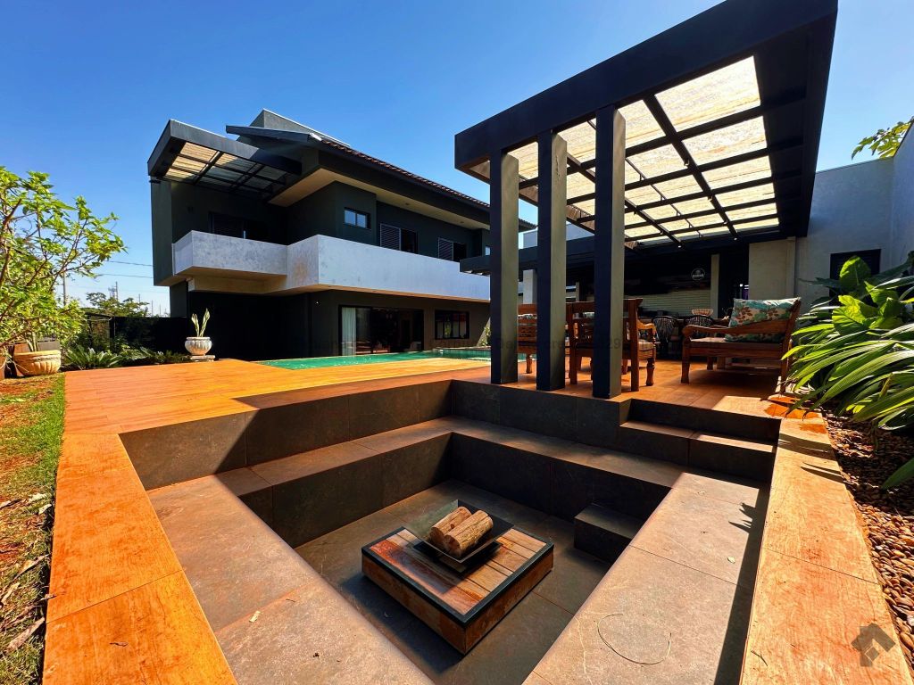 No térreo conta com 1 quarto ou escritório, 1 banheiro completo, sala integrada à cozinha em conceito aberto, cozinha planejada, despensa, lavanderia, hall de entrada de serviço e 1 banheiro de serviço. No piso superior são 2 apartamentos, 1 suíte com closet, varandas em todos os quartos, além de escritório/rouparia e sala íntima. A área de lazer oferece churrasqueira gourmet, piscina com borda infinita e aquecida, lareira externa, casa de piscina com depósito, banheiro completo e espaço para academia externa. Diferenciais: aquecimento solar em chuveiros e torneiras, aquecimento solar para piscina, energia solar fotovoltaica e garagem coberta para 3 carros.