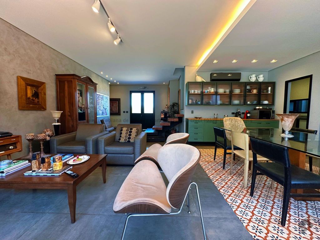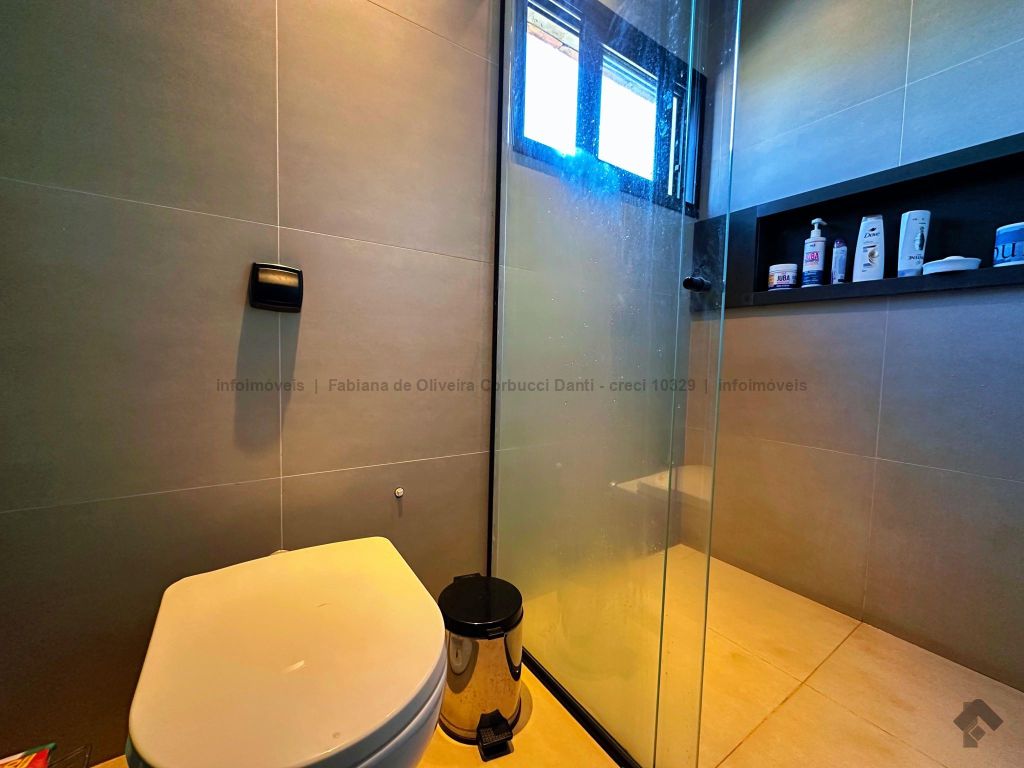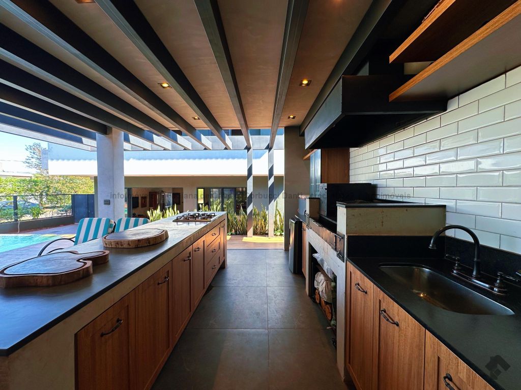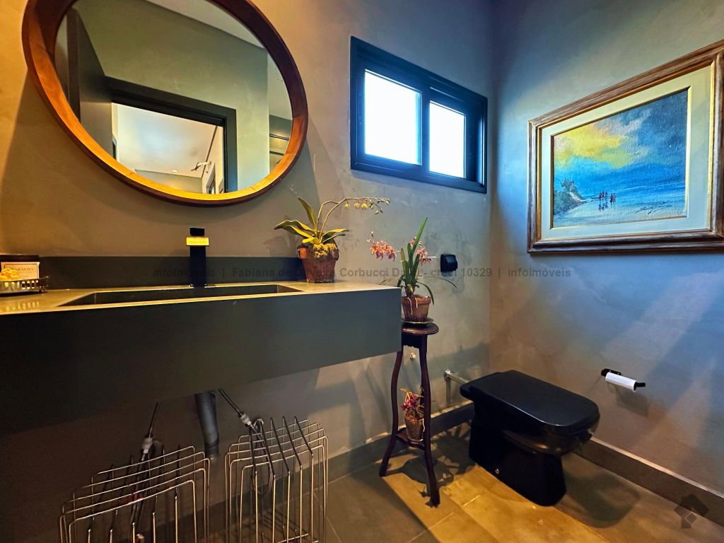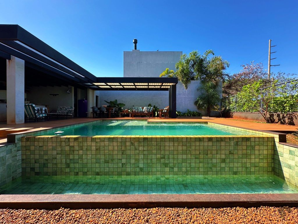 No térreo conta com 1 quarto ou escritório, 1 banheiro completo, sala integrada à cozinha em conceito aberto, cozinha planejada, despensa, lavanderia, hall de entrada de serviço e 1 banheiro de serviço. No piso superior são 2 apartamentos, 1 suíte com closet, varandas em todos os quartos, além de escritório/rouparia e sala íntima. A área de lazer oferece churrasqueira gourmet, piscina com borda infinita e aquecida, lareira externa, casa de piscina com depósito, banheiro completo e espaço para academia externa. Diferenciais: aquecimento solar em chuveiros e torneiras, aquecimento solar para piscina, energia solar fotovoltaica e garagem coberta para 3 carros.