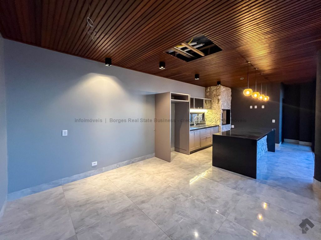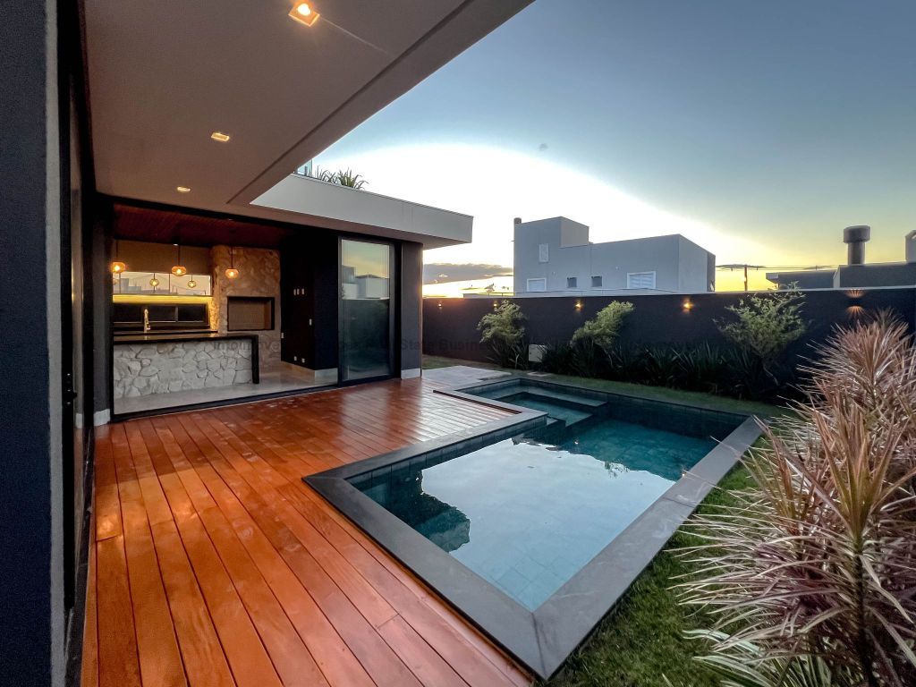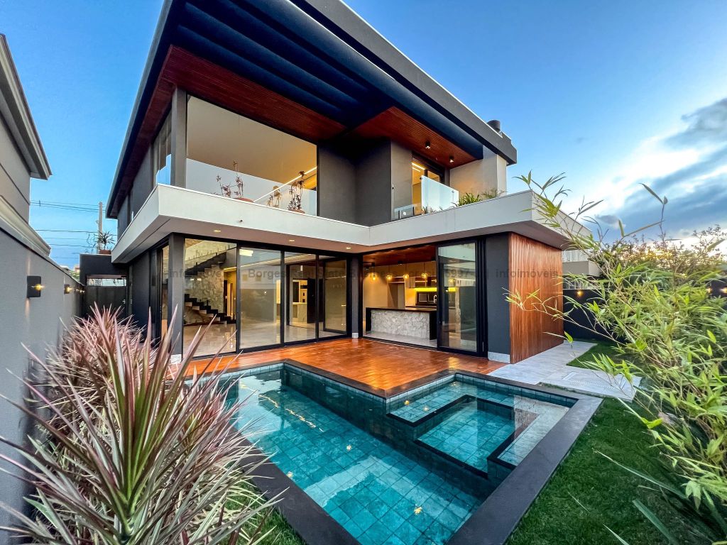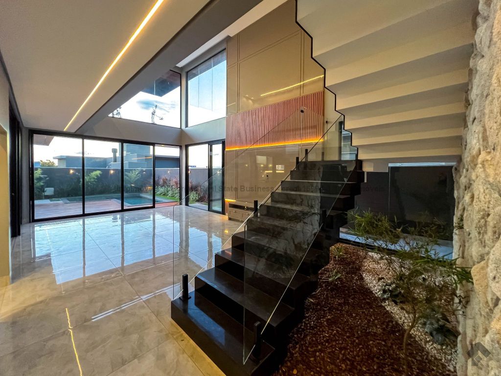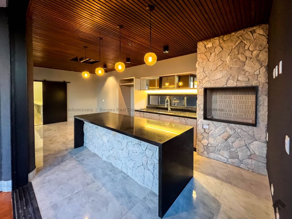 Piso superior: 01 suíte com closet, 02 suítes com armários. Piso inferior: um escritório com banheiro que pode ser utilizado como quarto, sala ampla, cozinha individualizada com armários, espaço gourmet, banheiro, piscina aquecida e iluminada. Sobrado rico em armários, paisagismo, pedras na parede, recebe muita luz natural.