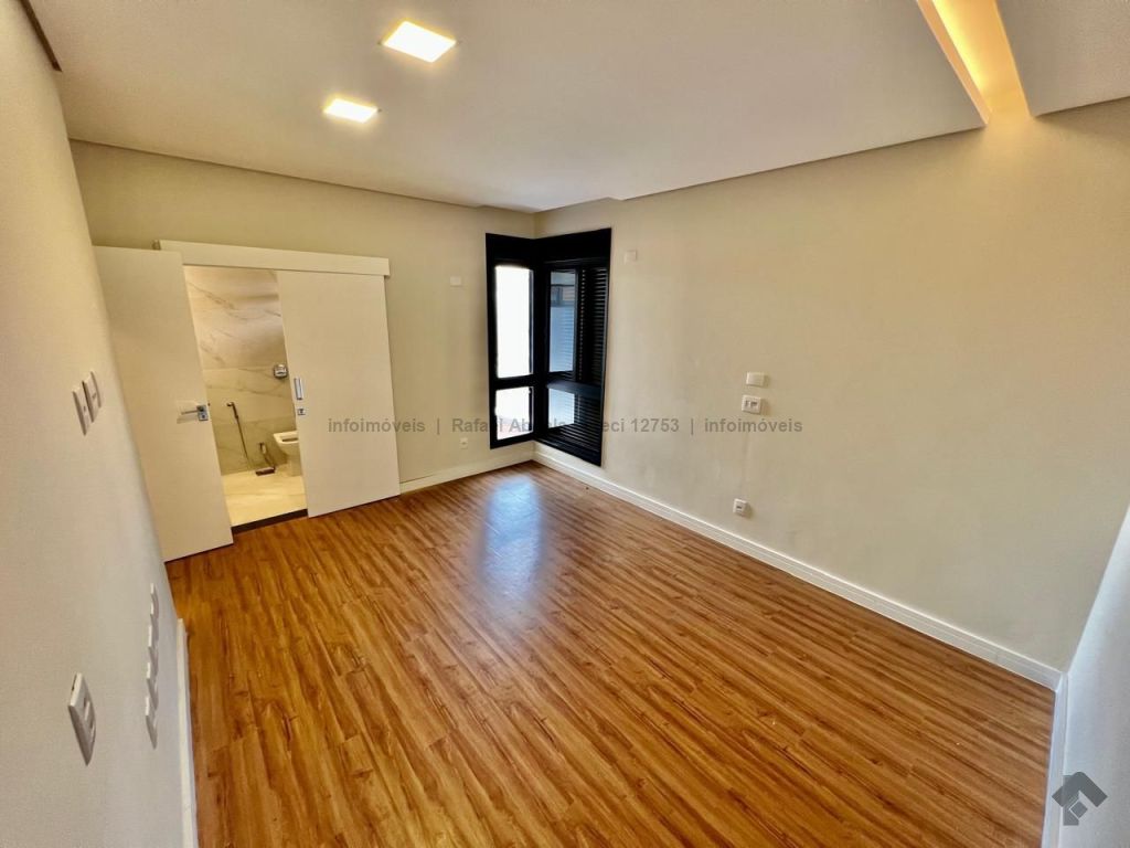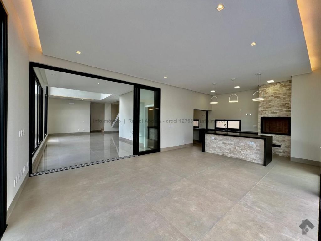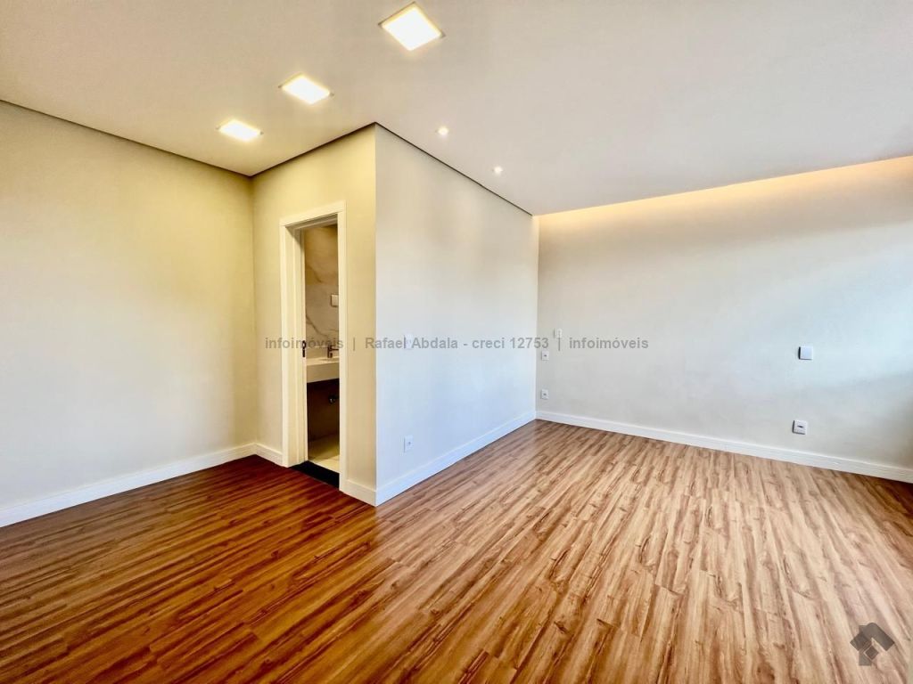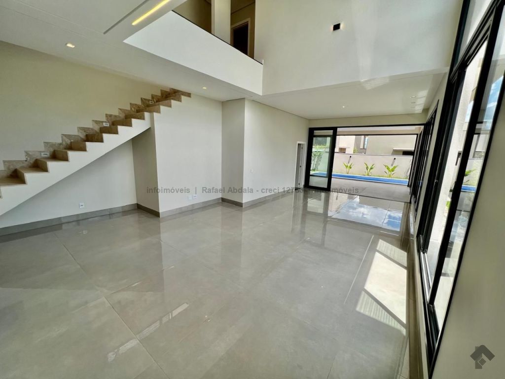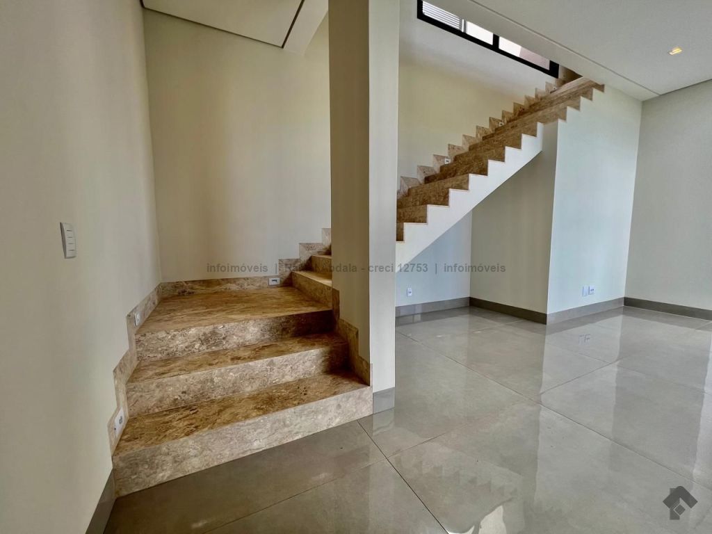Garagem coberta para 2 carros e descoberta para mais 2 carros, hall de entrada, lavabo, sala para 2 ambientes com pé direito duplo, escada em mármore travertino com guarda-corpo em vidro, cozinha separada, ampla área gourmet, lavabo externo, lavanderia, despensa, depósito, piscina aquecida com hidro. Todas as suítes com persianas automatizadas. Boiler de aquecimento de água com 600 litros. Piso Portinari 1,20 x 1,20 m. Preparação na área gourmet para ar condicionado K7.