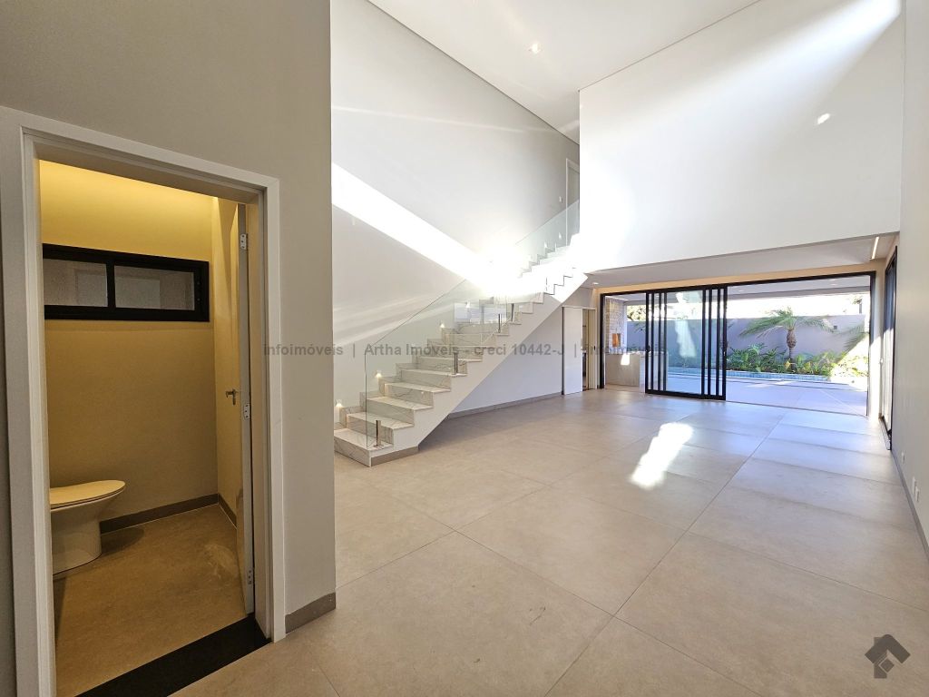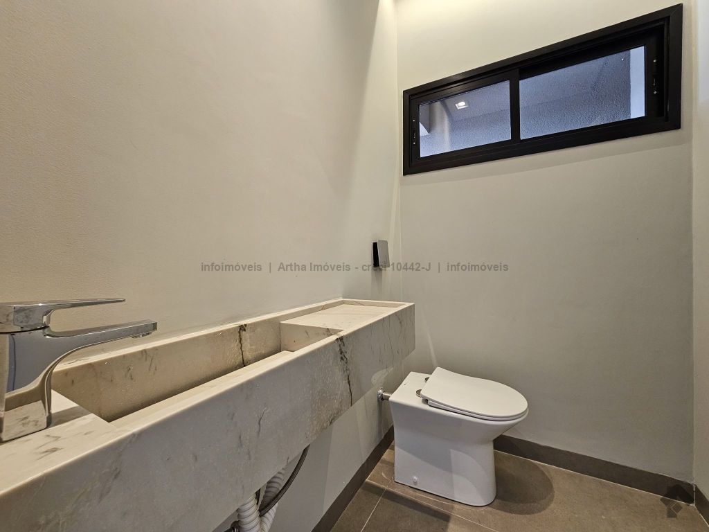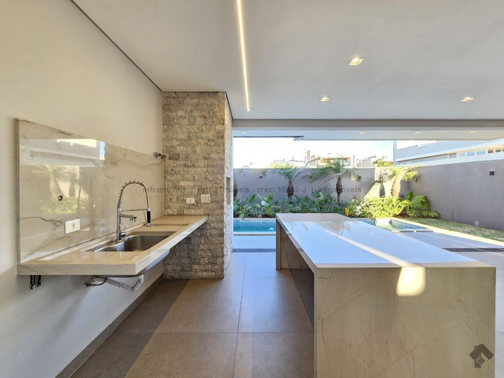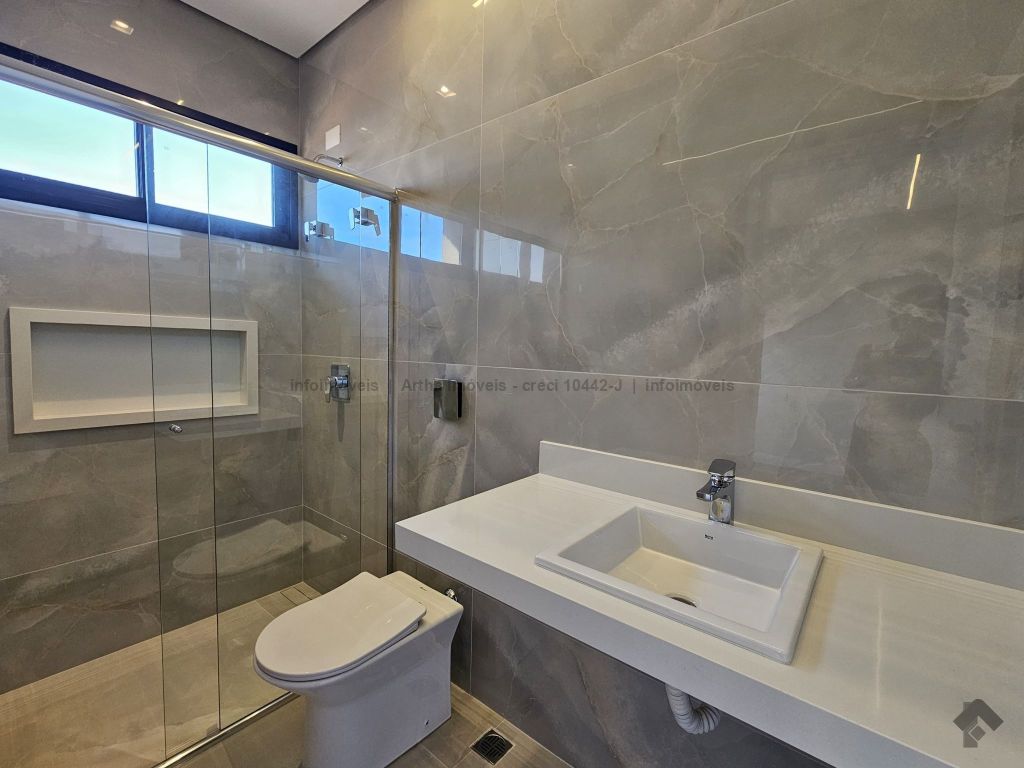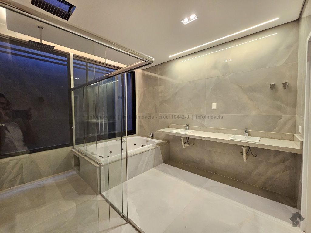 Sobrado no condomínio Alphaville III, localiza-se em área centralizada dentro do condomínio. Piso térreo: sala em dois ambientes com pé direito alto, lavabo, suíte ou sala de TV ou escritório com banheiro, cozinha gourmet, piscina (será entregue aquecida), W.C. no lazer, lavanderia, depósito pequeno, garagem coberta para 2 carros. No piso superior possui: minicopa, espaço para roupeiro, 2 suítes, 1 suíte master com sacada, amplo closet, banheiro muito espaçoso com 2 chuveiros, 2 pias, hidromassagem e jardim de inverno. Diferenciais: aquecimento solar da água, preparação para instalação de energia fotovoltaica, porta de entrada de tamanho especial e pivotante, fechadura digital, persianas automatizadas, muita iluminação natural, paisagismo, projeto de iluminação, preparação para instalação de ar condicionado.