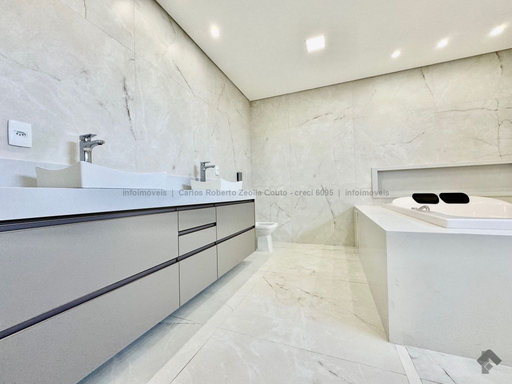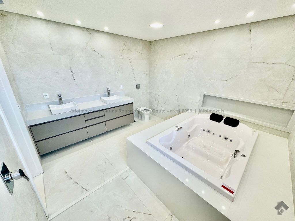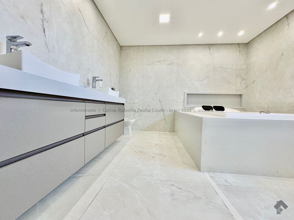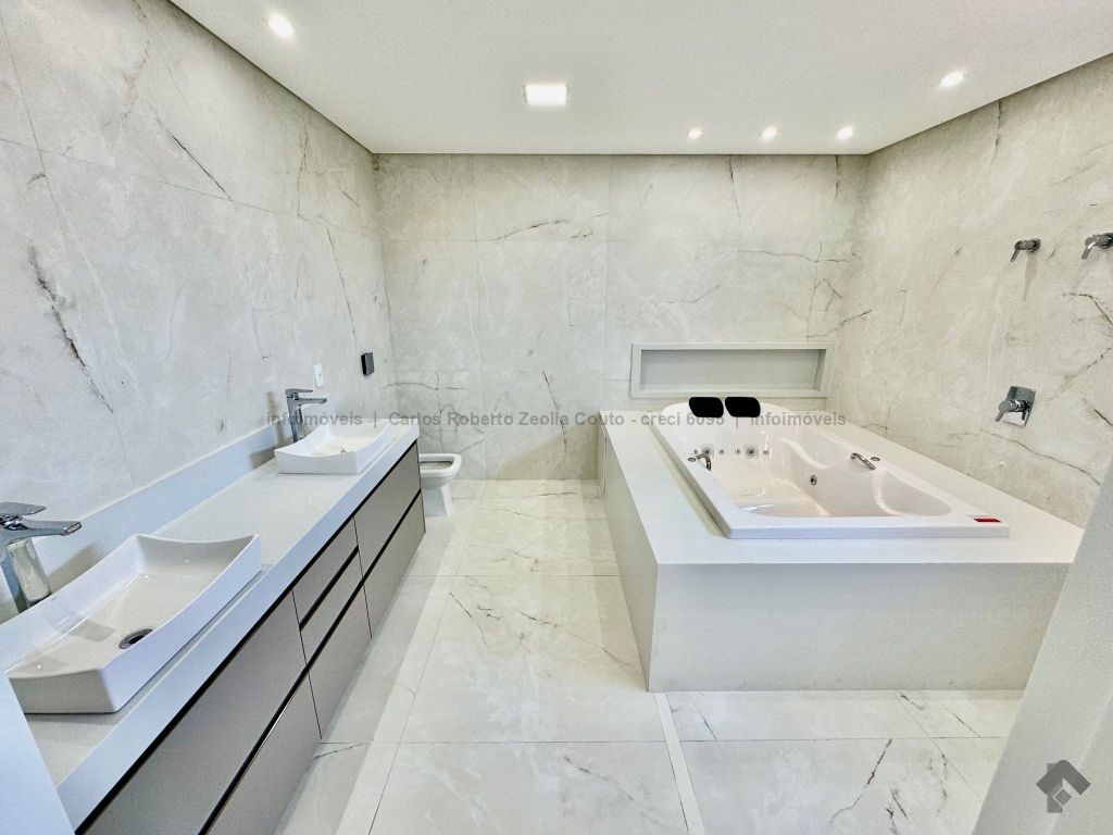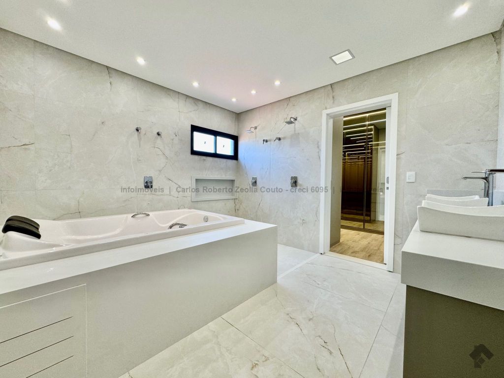 1 suíte master com closet e banheira, 3 suítes no 2º andar, 1 suíte no térreo, lavabo, sala com pé direito duplo, espaço gourmet, cozinha, lavanderia, depósito, banheiro da piscina, energia solar fotovoltaica e piscina com aquecimento solar.