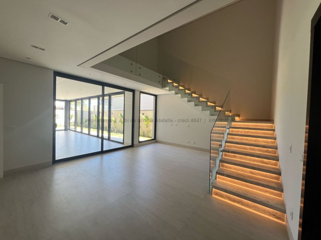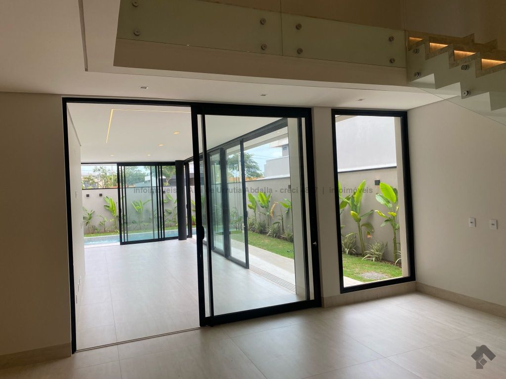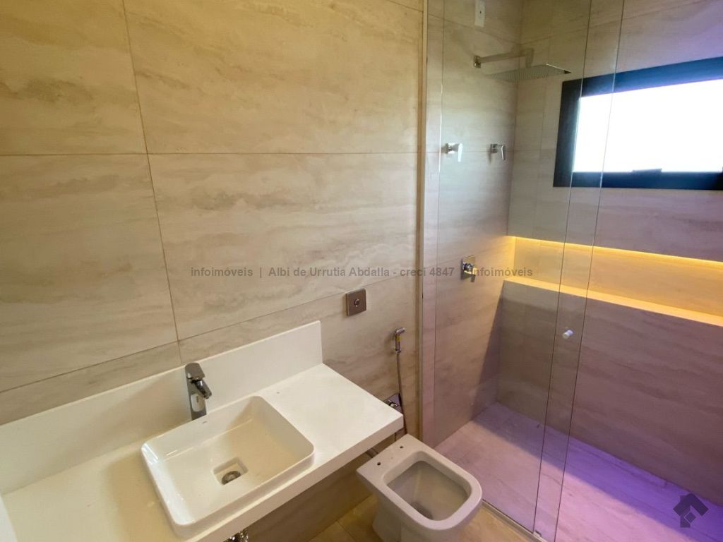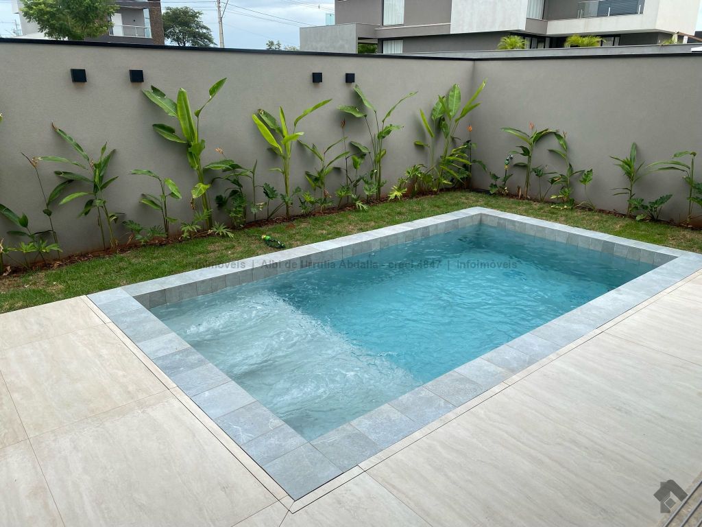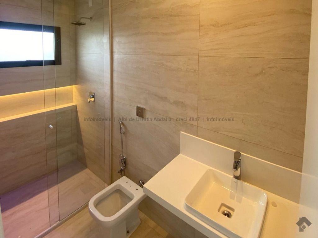 Sobrado de alto padrão com 5 suítes e 6 vagas de garagem. Arquitetura contemporânea. Pavimento térreo: sala de estar e jantar integradas, suíte (reversível para home office), cozinha integrada com a sala e espaço gourmet, despensa, depósito de gás, piscina aquecida com prainha e hidromassagem (sala de máquinas elevada com espaço para depósito), garagem para 6 veículos. Pavimento superior: suíte máster 1 (closet e banheiro com duchas e cubas duplas), suíte máster 2 (closet camarim e persiana), suíte 4 (persianas automatizadas).