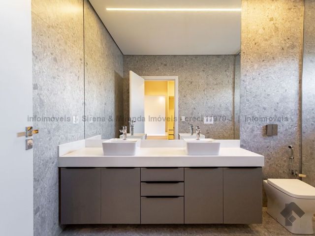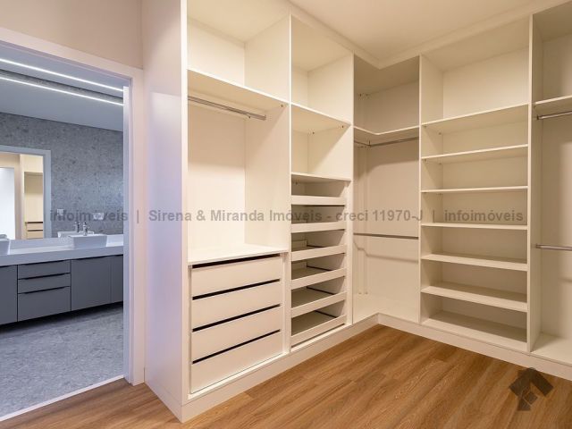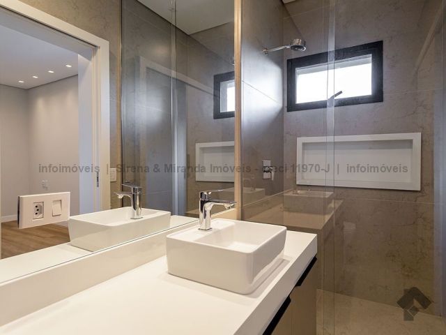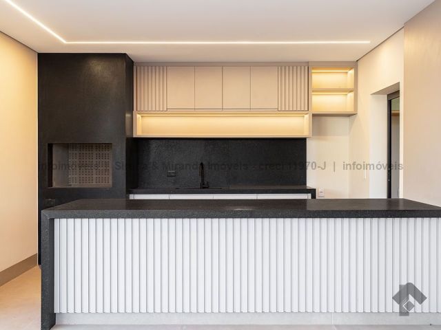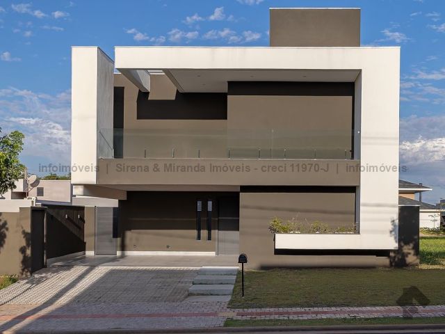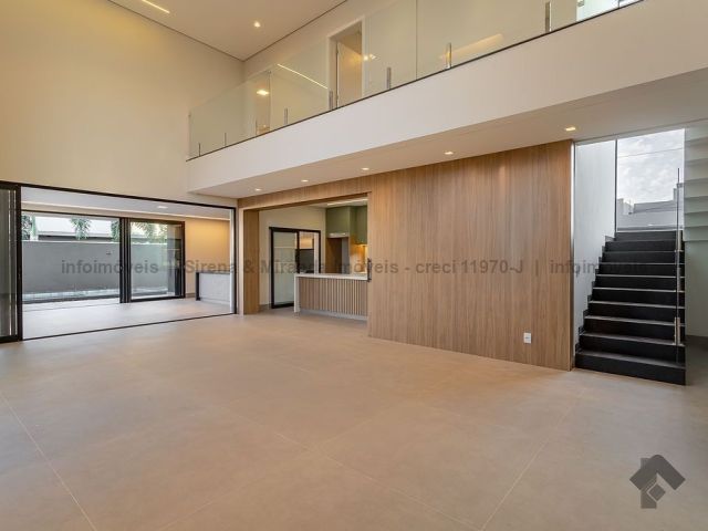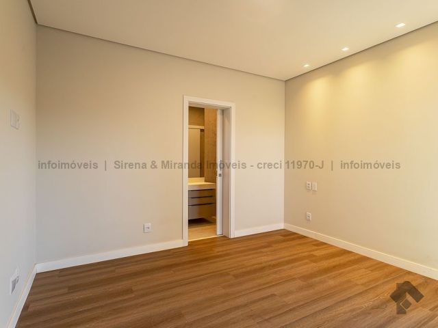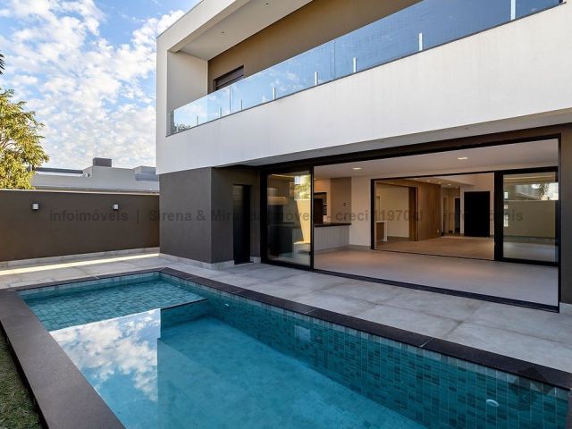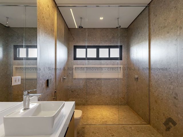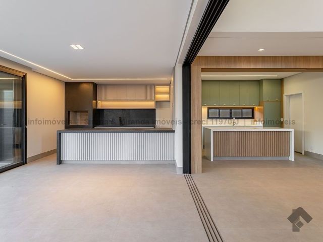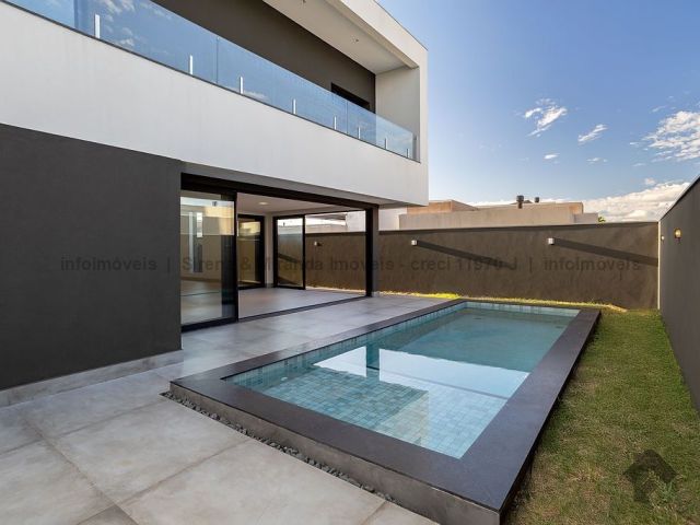 Térreo, sala de estar e jantar com pé direito duplo, lavabo, área gourmet com armário planejado, bancada, churrasqueira, cozinha planejada, lavanderia, depósito, piscina com prainha e iluminação em LED, além de uma bela suíte. Piso superior, suíte master, closet amplo, sacada, banheiro da suíte master com duas cubas, dois chuveiros de teto e mais duas suítes, sendo que todas as suítes têm janelas com persiana automática com blackout e sistema de pressurização e água quente, que é solar. Irrigação no jardim.