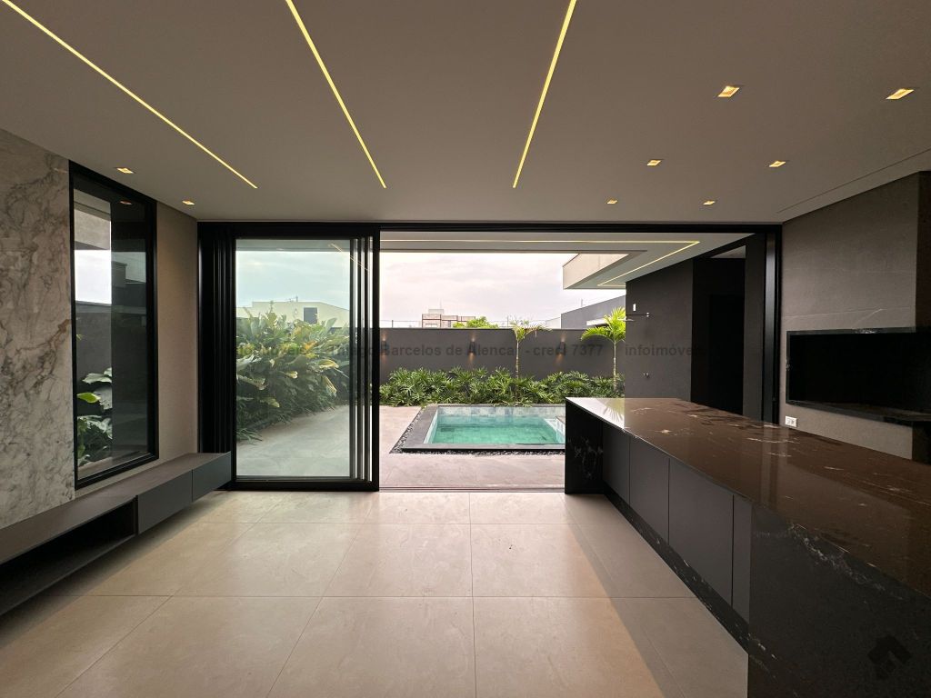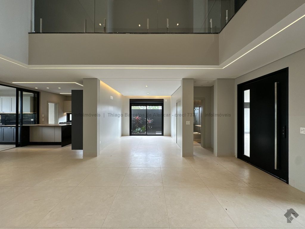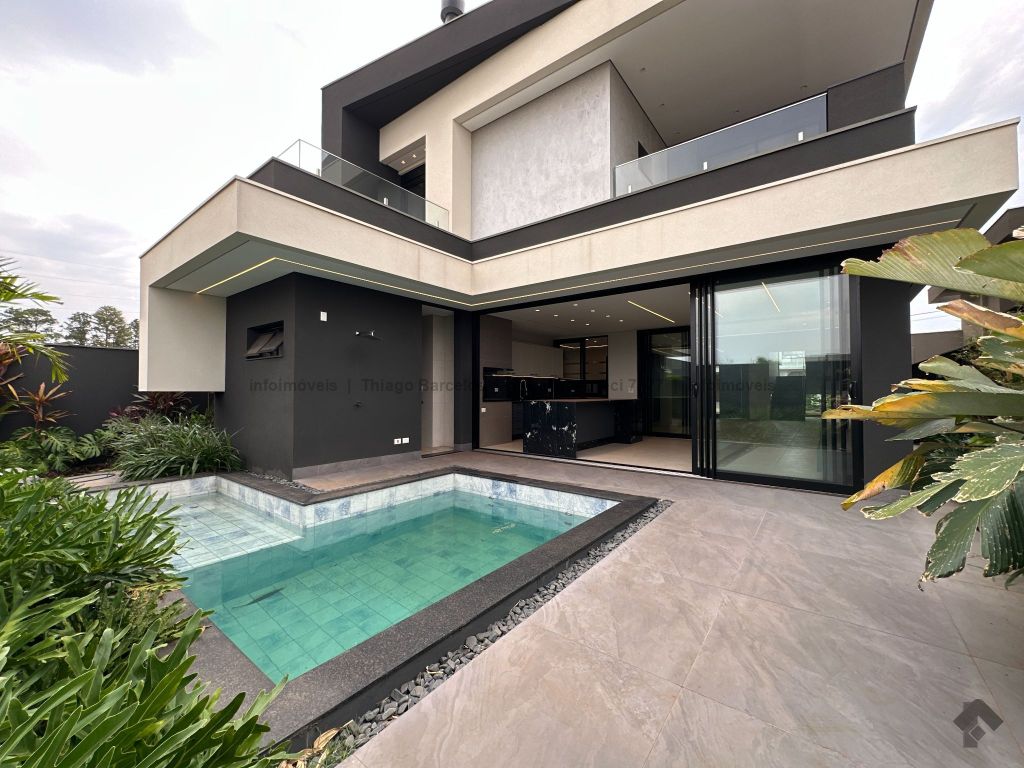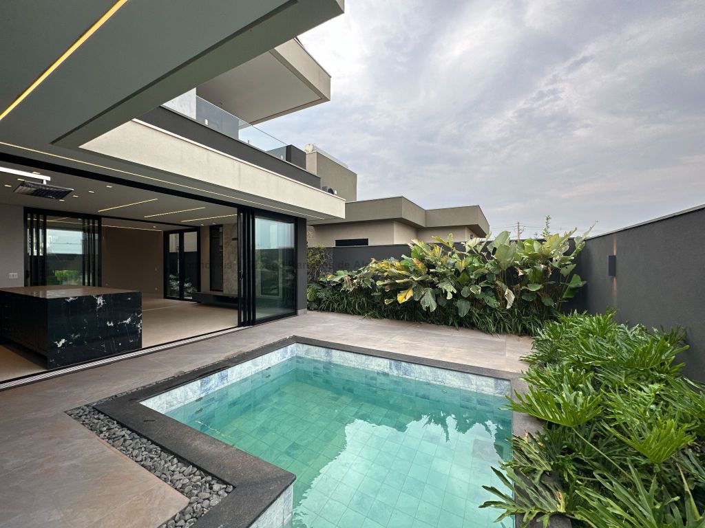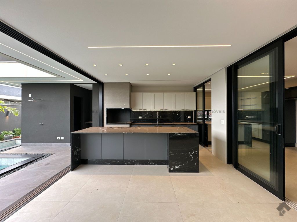 Sobrado de alto padrão com living amplo e integrado, lavabo, home cinema e cozinha planejada. A área gourmet, separada por esquadrias de alumínio, oferece praticidade e elegância, integrada à piscina com hidromassagem e prainha. Conta com banheiro de apoio, lavanderia, despensa e armário vertical de gás. No piso superior, duas suítes com sacada e uma suíte master com hidromassagem, cubas e chuveiros duplos, além de sacada privativa. Possui garagem coberta para dois carros e infraestrutura completa com aquecimento solar e ambientes climatizados.