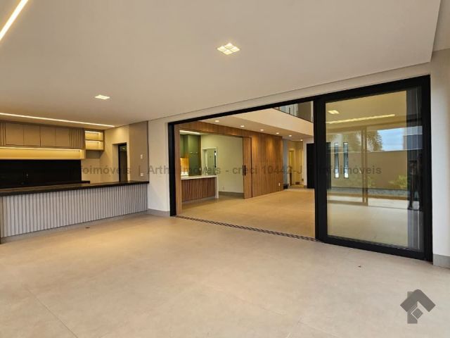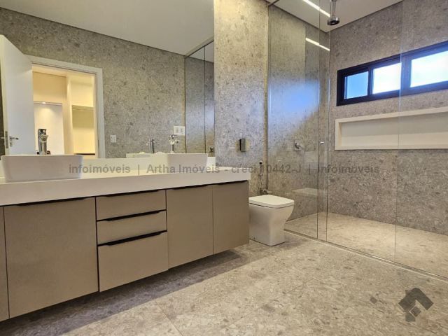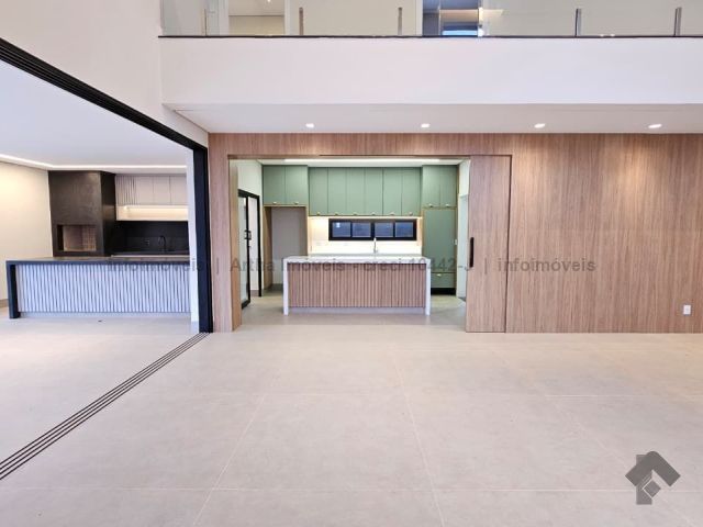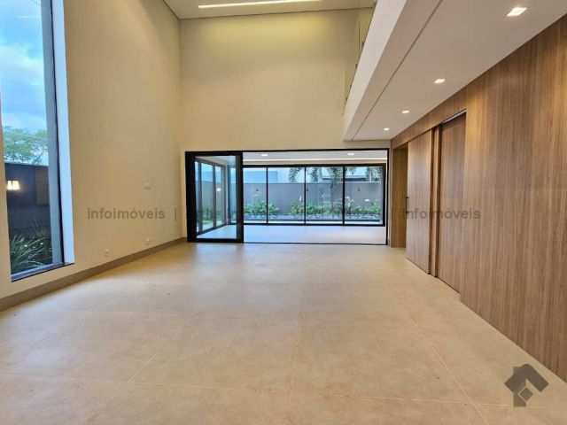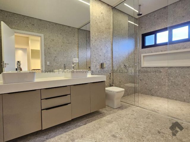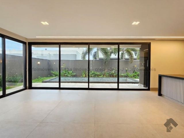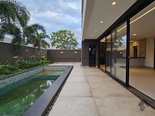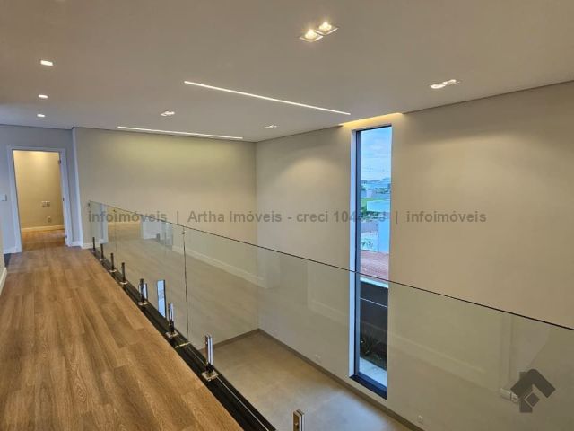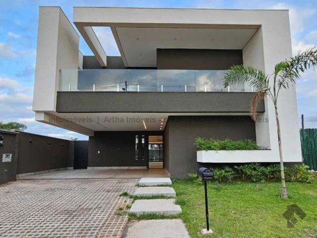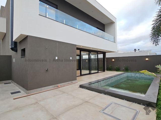 Localizado a poucas quadras da área de lazer do condomínio, o sobrado possui 318,86 m² de corpo principal (habite-se), 17,50 m² de piscina e 382,7 m² de terreno, com a seguinte distribuição de cômodos: Térreo: 1 suíte/escritório, lavabo, sala muito ampla com pé direito duplo, cozinha individualizada com porta ampla para integração de ambiente, área gourmet fechada, piscina com prainha e iluminação em LED, banheiro no lazer, lavanderia, despensa e 2 vagas de garagem cobertas. Piso superior: 1 suíte com closet e sacada na frente, 1 suíte ampla sem sacada e 1 suíte master com closet amplo e sacada para o lazer.