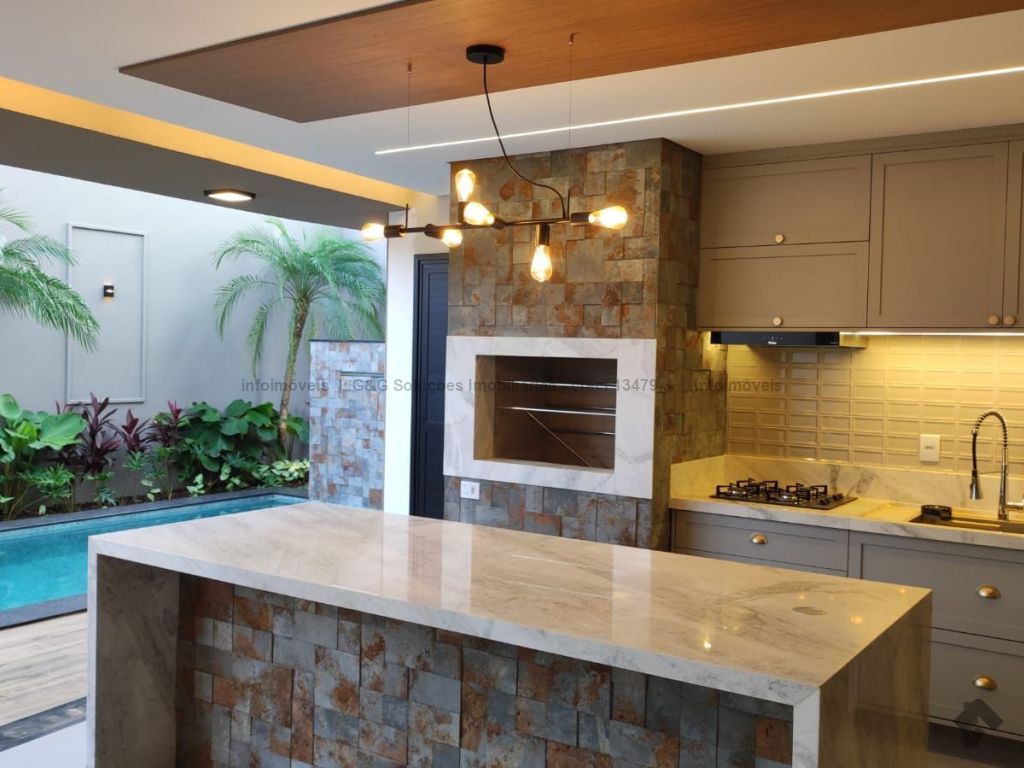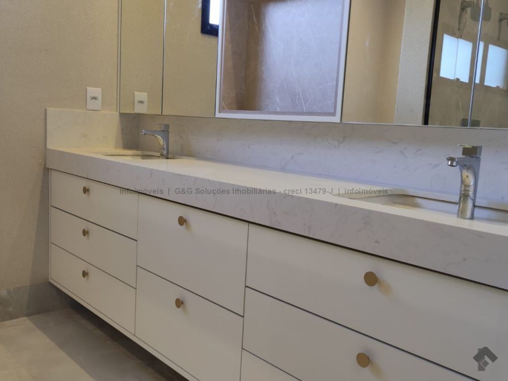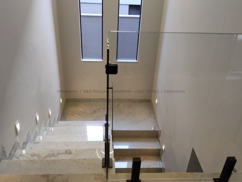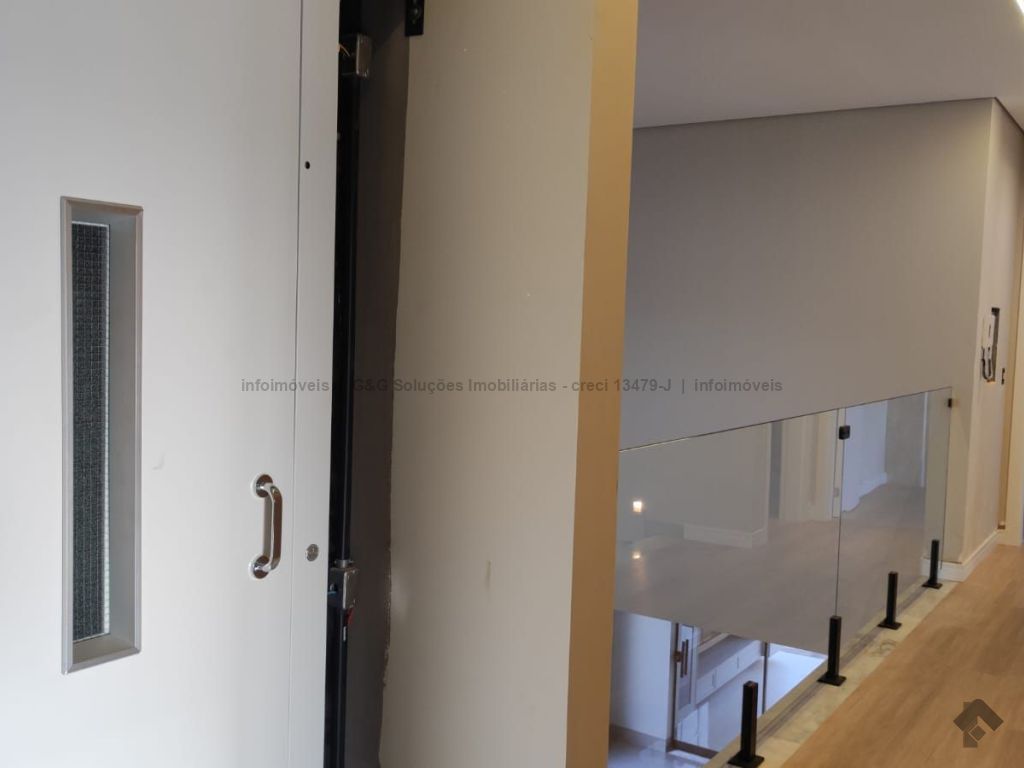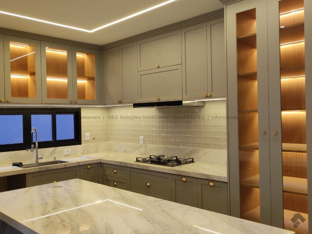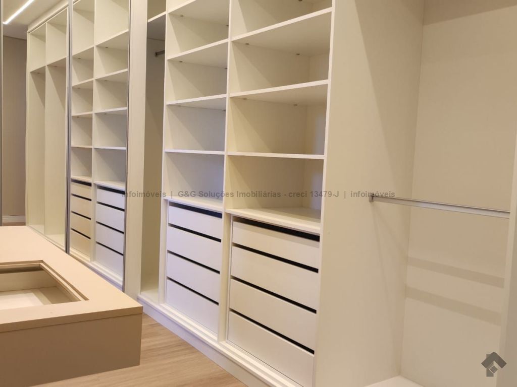 Piso inferior: sala ampla com dois ambientes, lavabo, cozinha, área gourmet com piscina aquecida e lavabo, lavanderia, despensa e banheiro de serviço. Piso superior: três suítes com closet, sendo uma master e outra com sacada privativa, copa, sacada e elevador.
