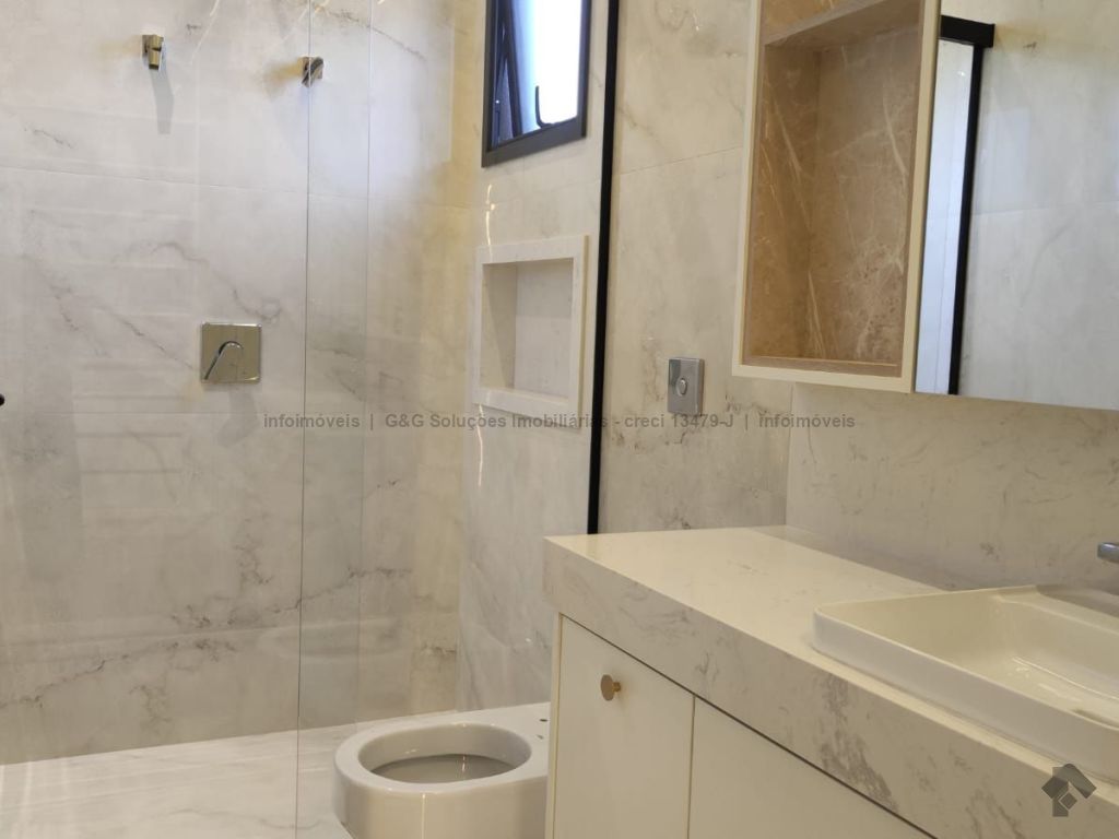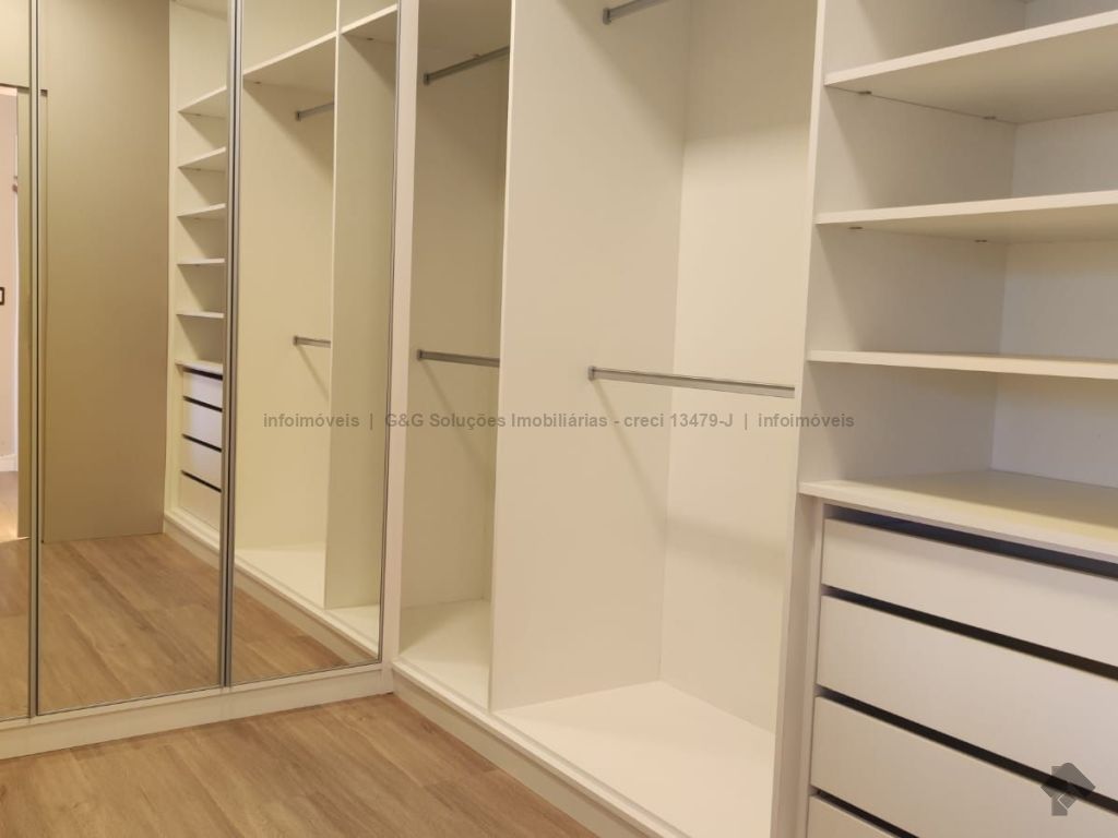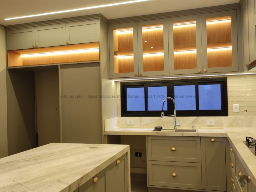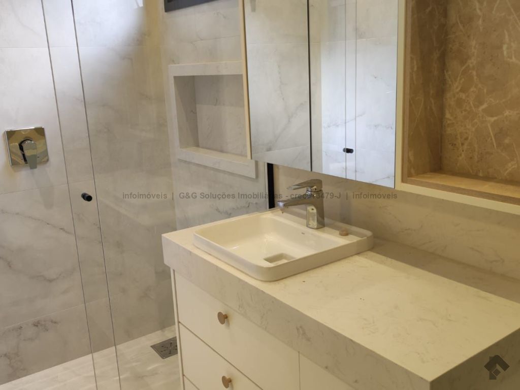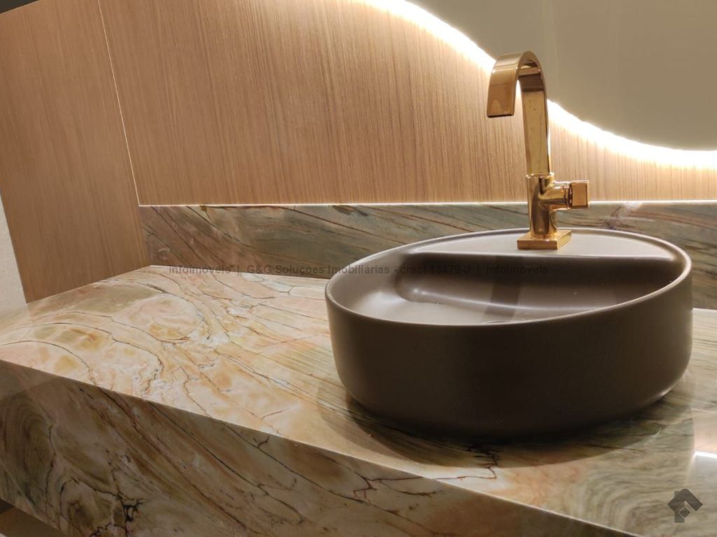 Piso inferior: sala ampla com dois ambientes, lavabo, cozinha, área gourmet com piscina aquecida e lavabo, lavanderia, despensa e banheiro de serviço. Piso superior: três suítes com closet, sendo uma master e outra com sacada privativa, copa, sacada e elevador.