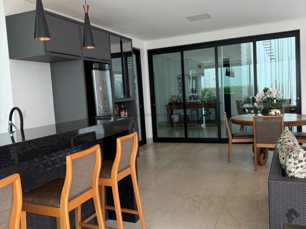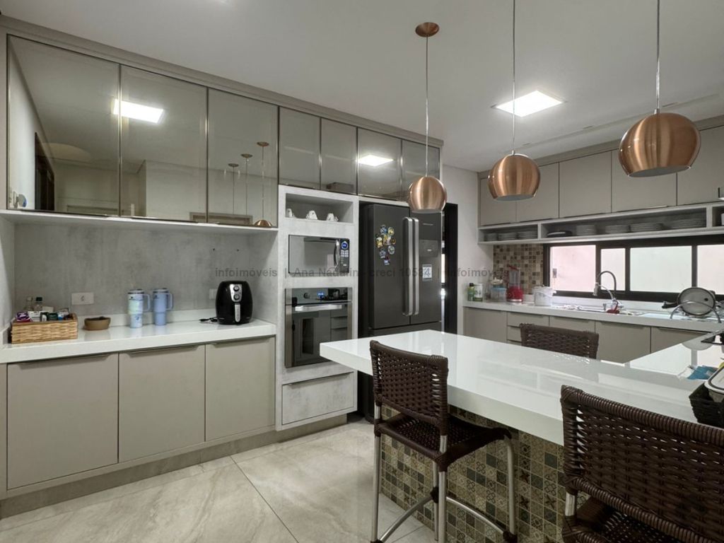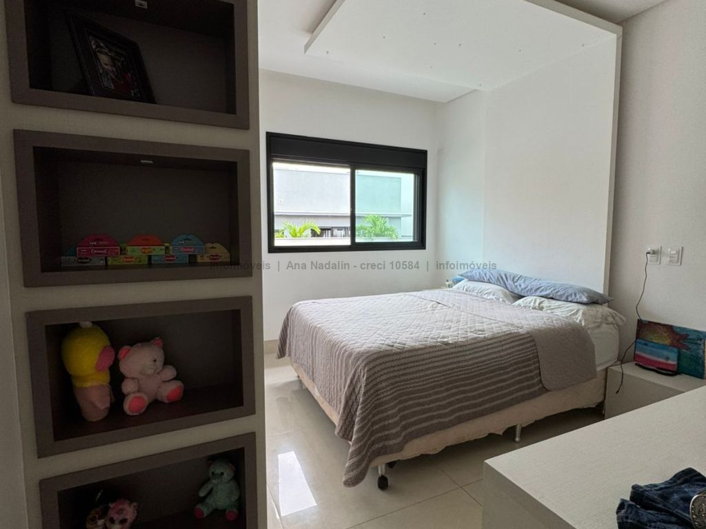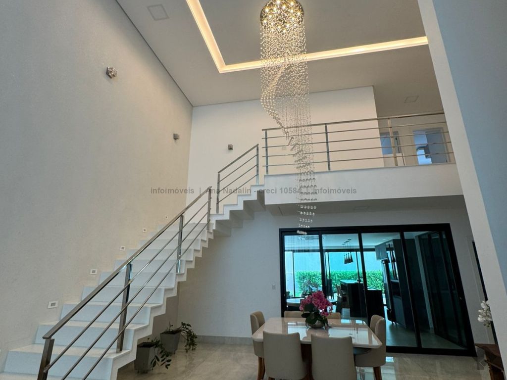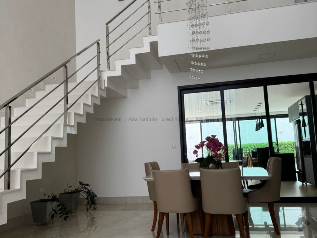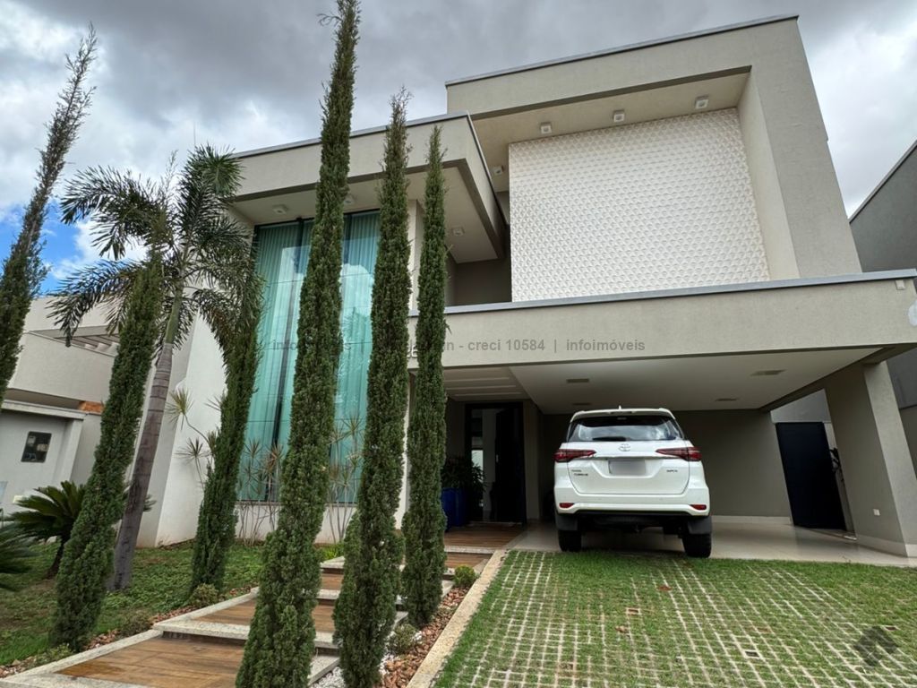 Sobrado com pé direito duplo, 5 suítes, sendo 1 máster com amplo closet, todas as suítes com armários e banheiros equipados, uma das suítes se encontra no térreo, ampla sala de estar e jantar, cozinha planejada, área gourmet espaçosa para 3 ambientes com churrasqueira, armários planejados, piscina e garagem coberta. Condomínio com toda segurança 24 horas e excelente infraestrutura.