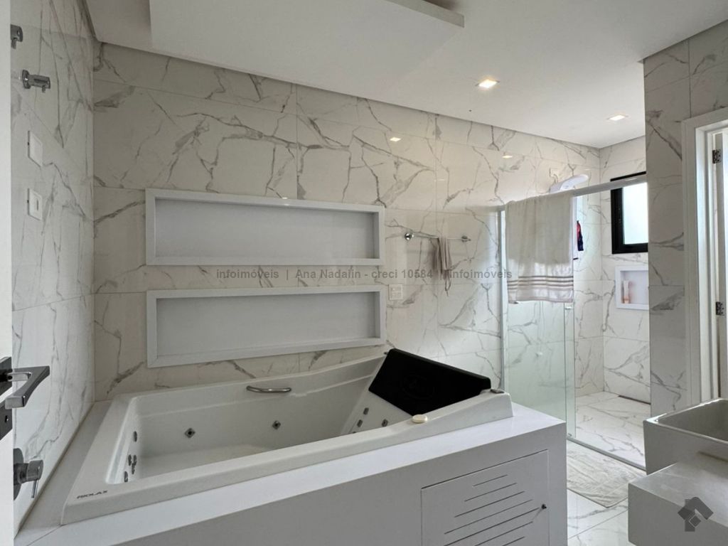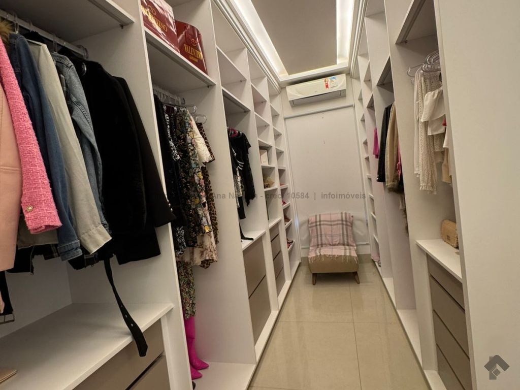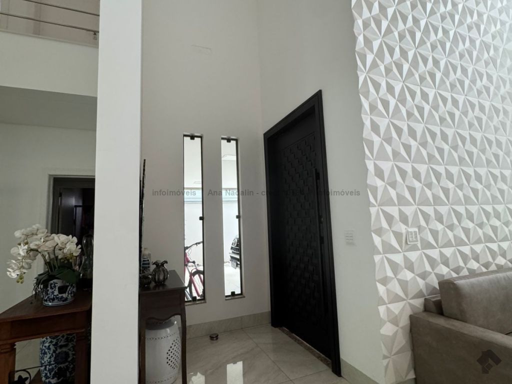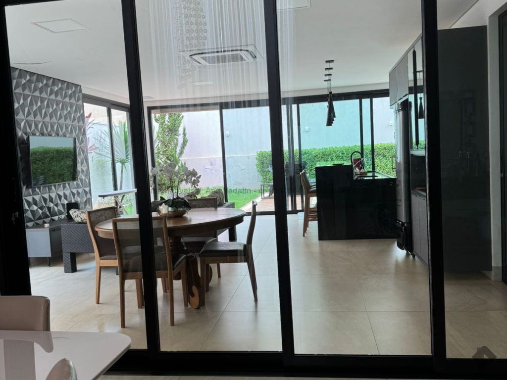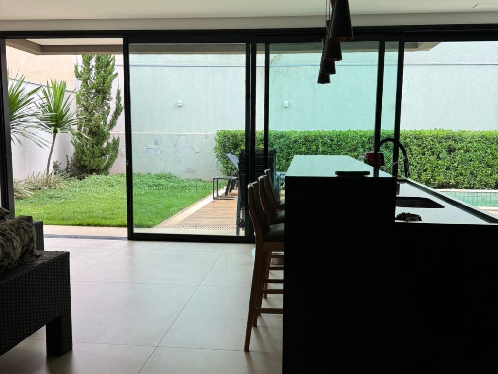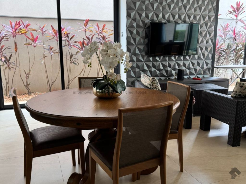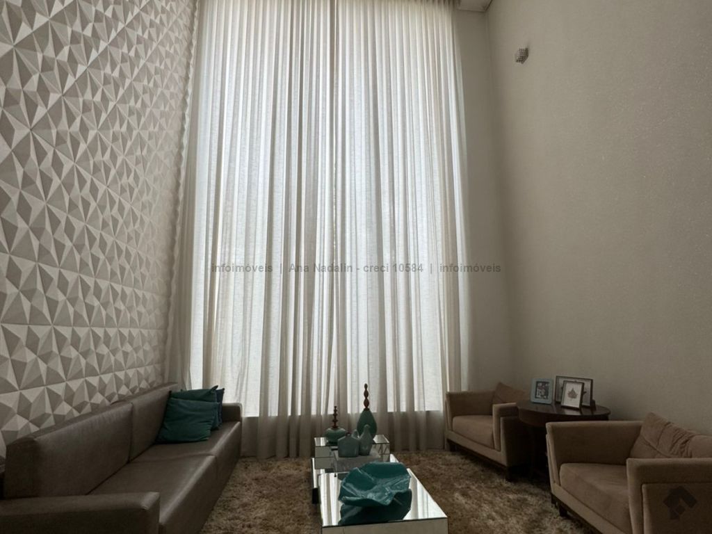 Sobrado com pé direito duplo, 5 suítes, sendo 1 máster com amplo closet, todas as suítes com armários e banheiros equipados, uma das suítes se encontra no térreo, ampla sala de estar e jantar, cozinha planejada, área gourmet espaçosa para 3 ambientes com churrasqueira, armários planejados, piscina e garagem coberta. Condomínio com toda segurança 24 horas e excelente infraestrutura.