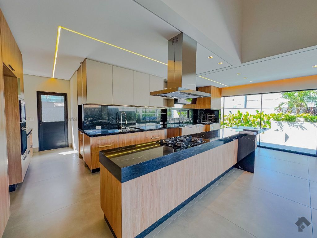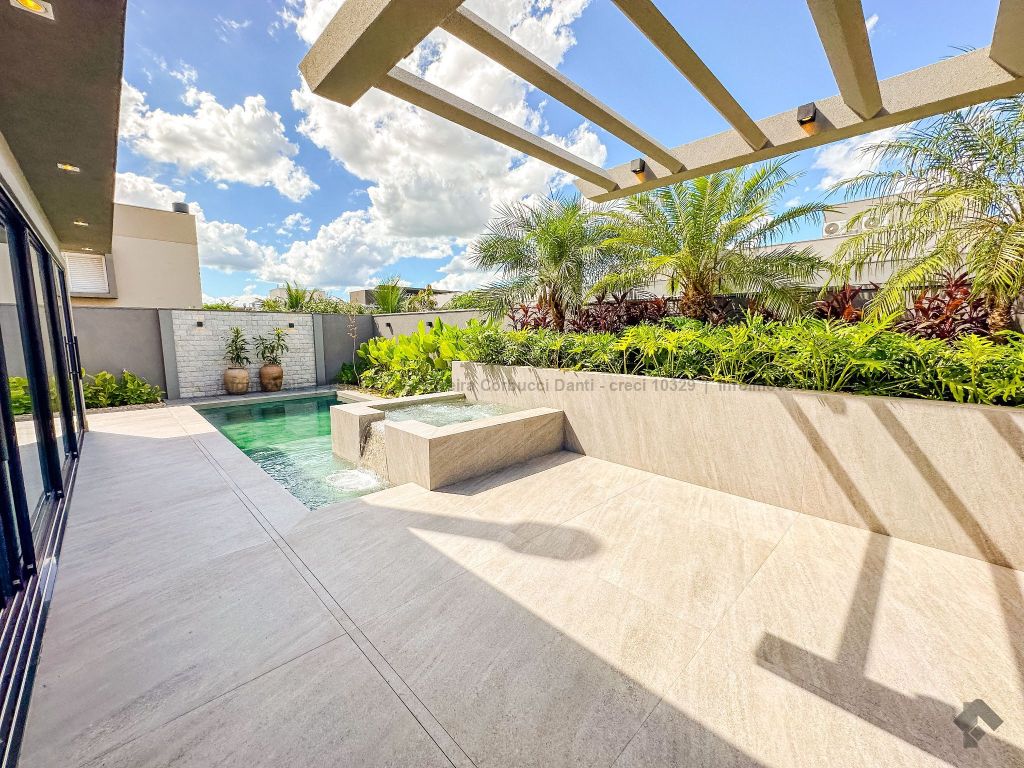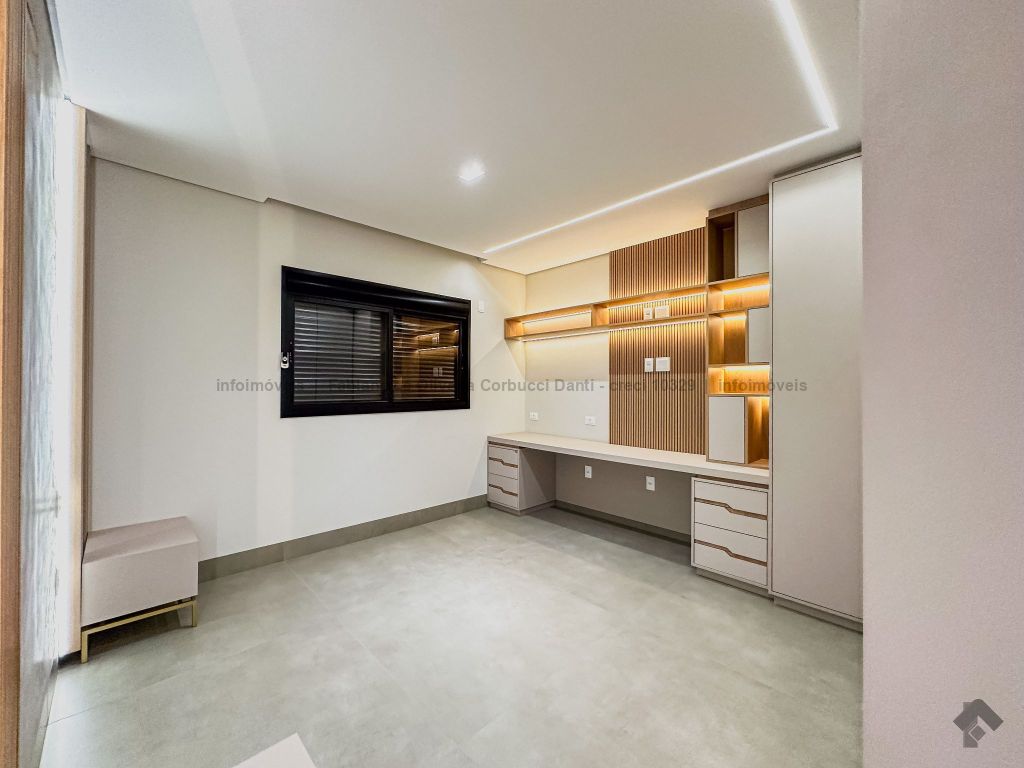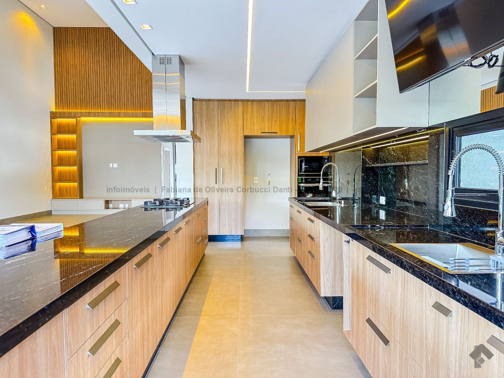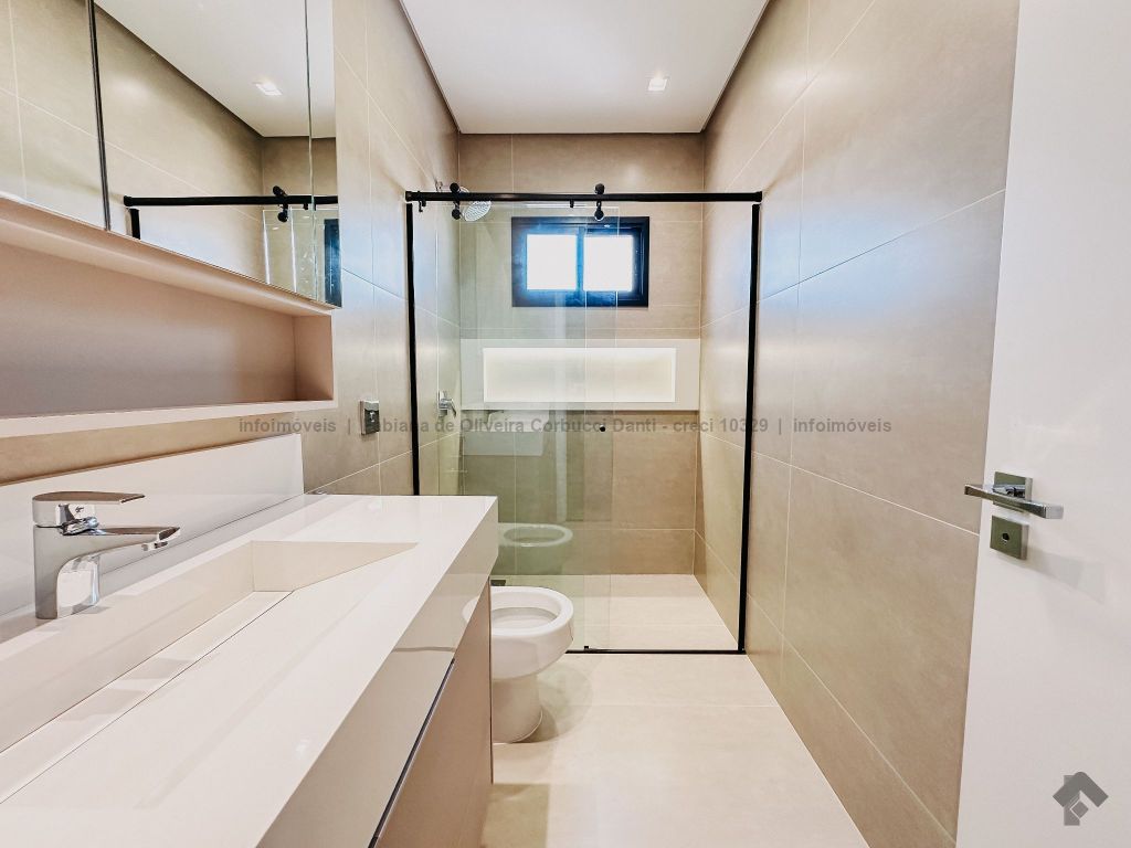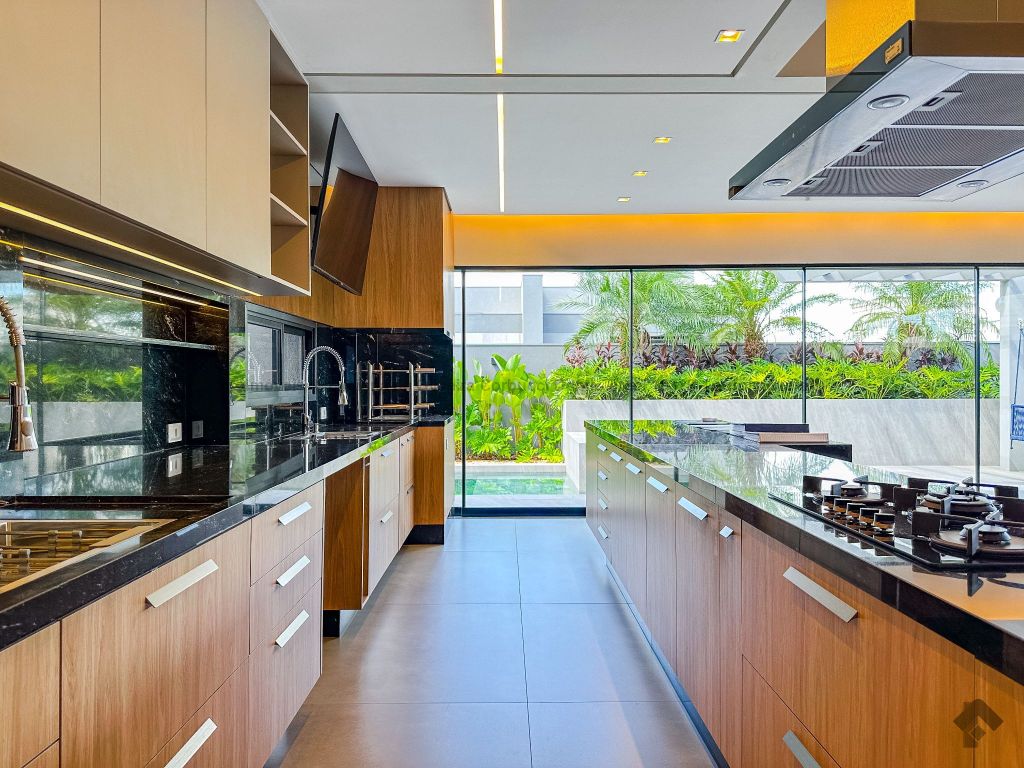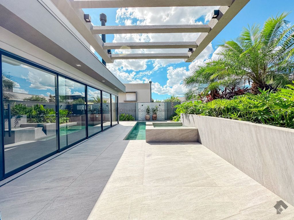 4 suítes, sendo 1 suíte no térreo e 3 suítes no piso superior, incluindo 1 máster. A área de lazer impressiona, contendo muito paisagismo e uma piscina aquecida com jacuzzi. A casa é rica em detalhes, oferecendo água aquecida através de aquecimento solar, completa de móveis planejados. A casa será entregue com alguns eletrodomésticos, como cooktop, coifa, forno elétrico e micro-ondas, espaço gourmet integrado e todo planejado, pergolado e paisagismo, irrigação automática, fechadura digital e persianas elétricas.