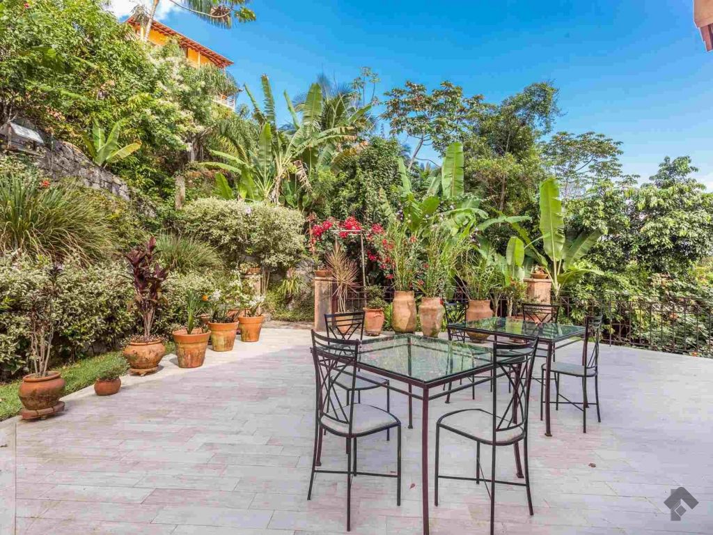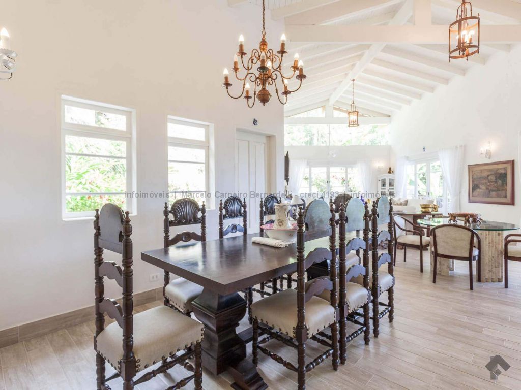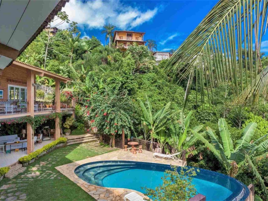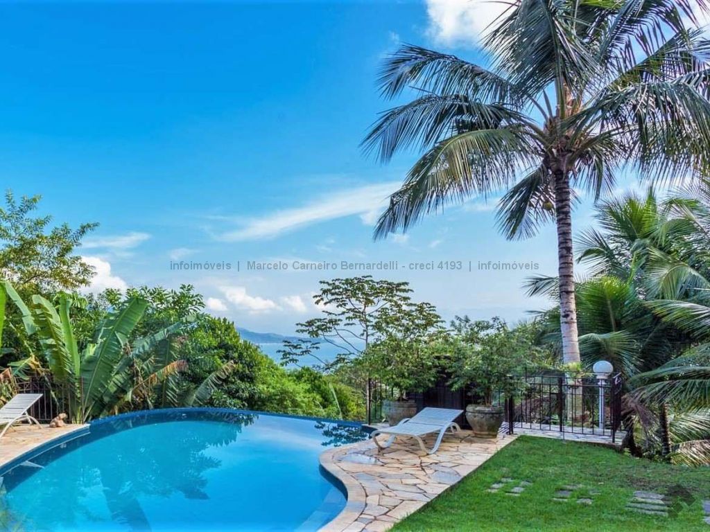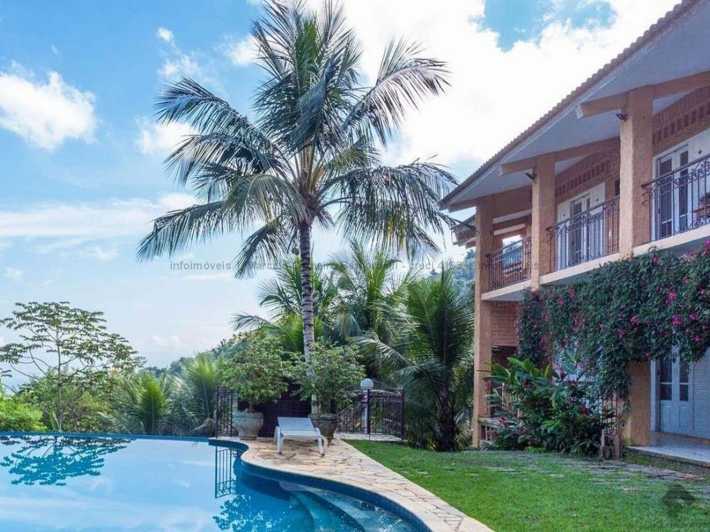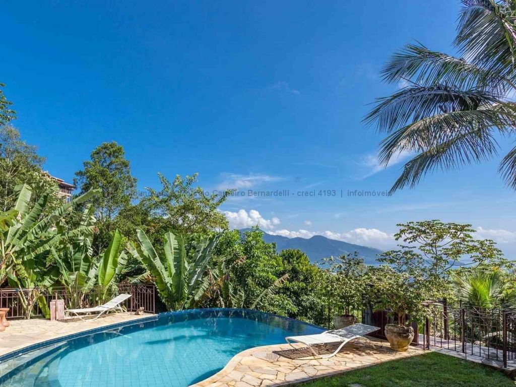 Rodeada de jardins em vários níveis. Piscina com borda infinita com vista para o mar, com área de lazer ao redor. No térreo há 06 suítes, todas com vista para o mar, lavabo, grande cozinha gourmet, forno de pizza, fogão a lenha, churrasqueira e área de convívio social com TV digital. No 1º andar, há outras 05 suítes, sendo que uma delas, além da vista para o mar, tem também vista para a Mata Atlântica. Ainda no 1º andar, uma outra cozinha, lavabo e grande sala de convívio social com TV digital e lareira. Há ainda sala de jantar e sala para jogos. Extensa e larga varanda e jardim contornam grande parte da mansão. O imóvel é dotado de uma plataforma elevatória externa e todas as suítes possuem ar-condicionado.