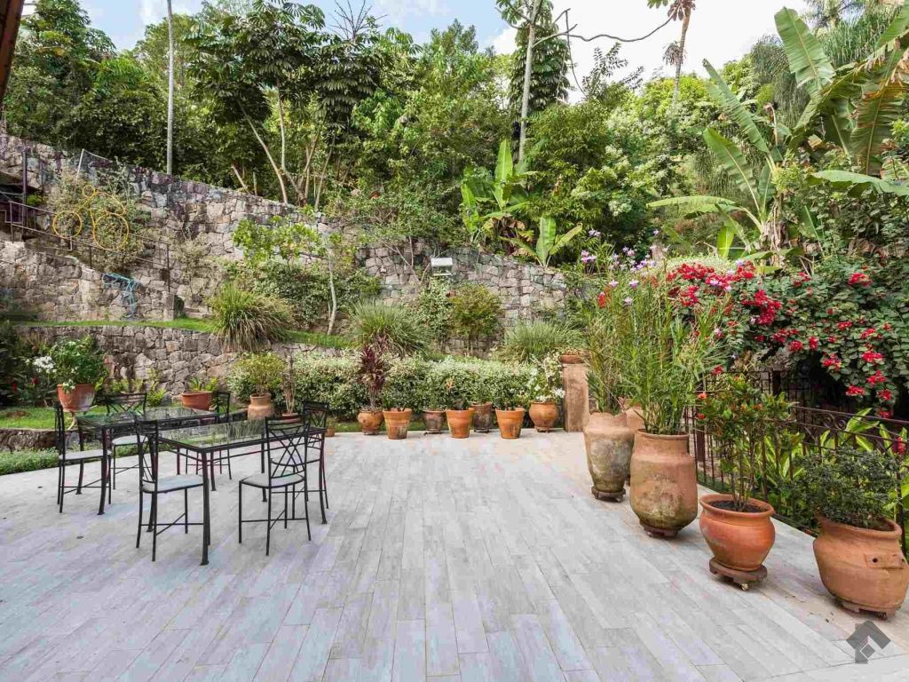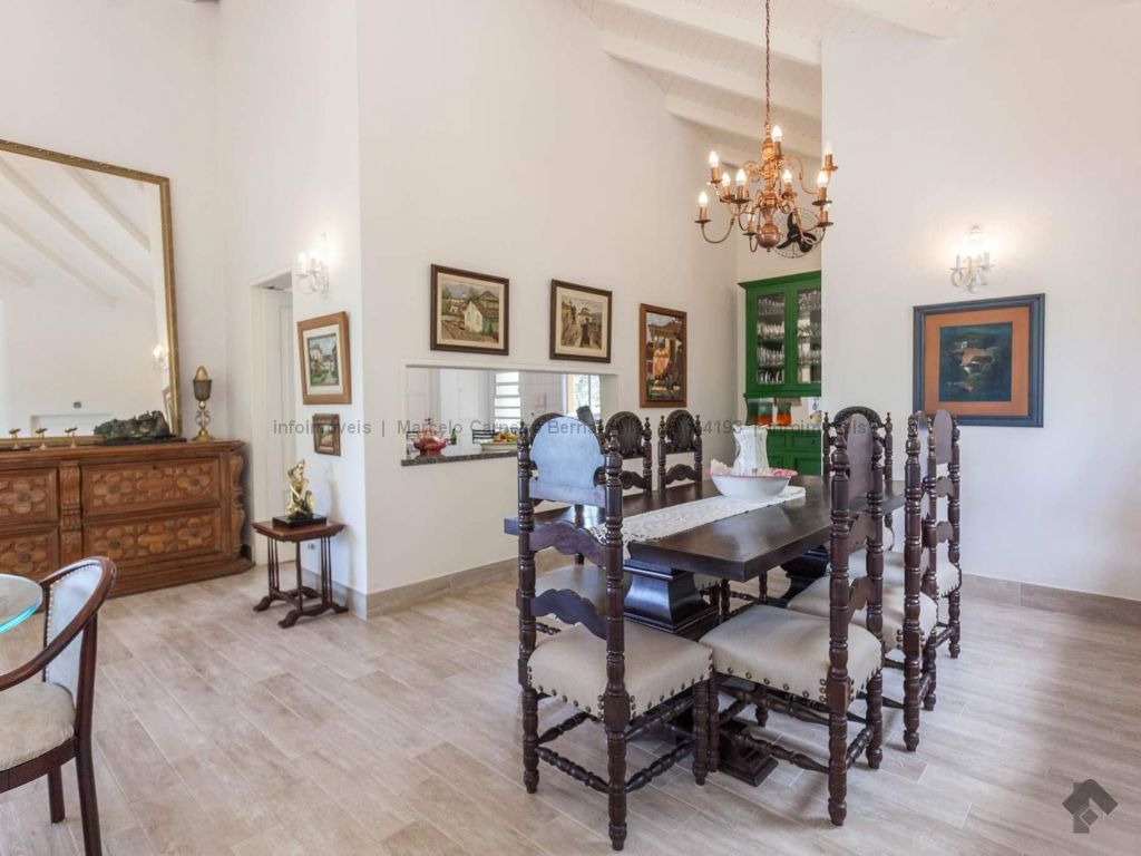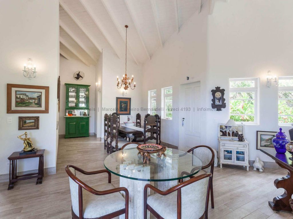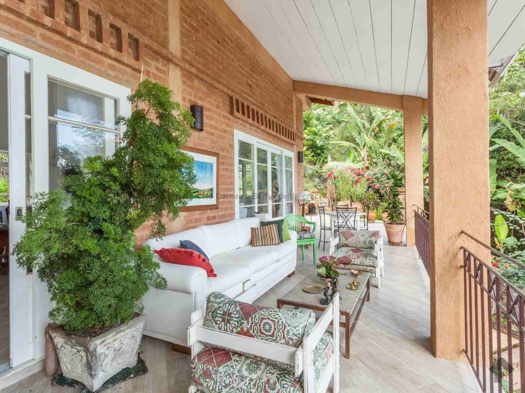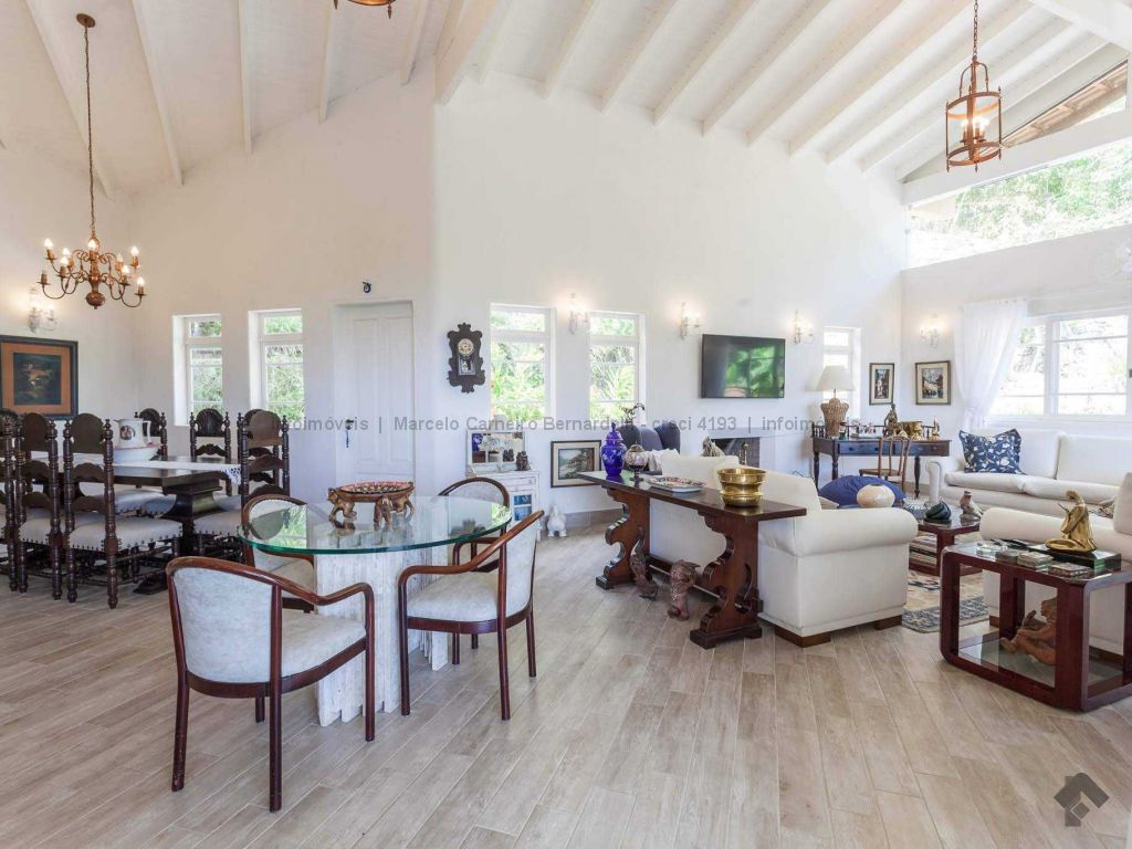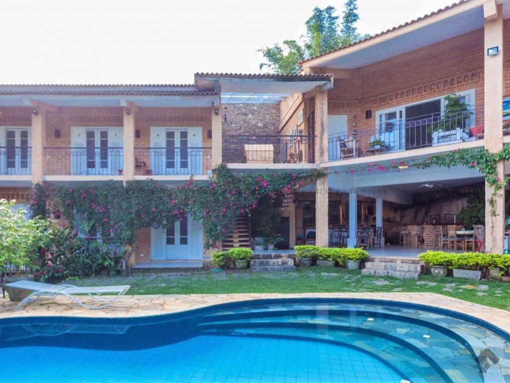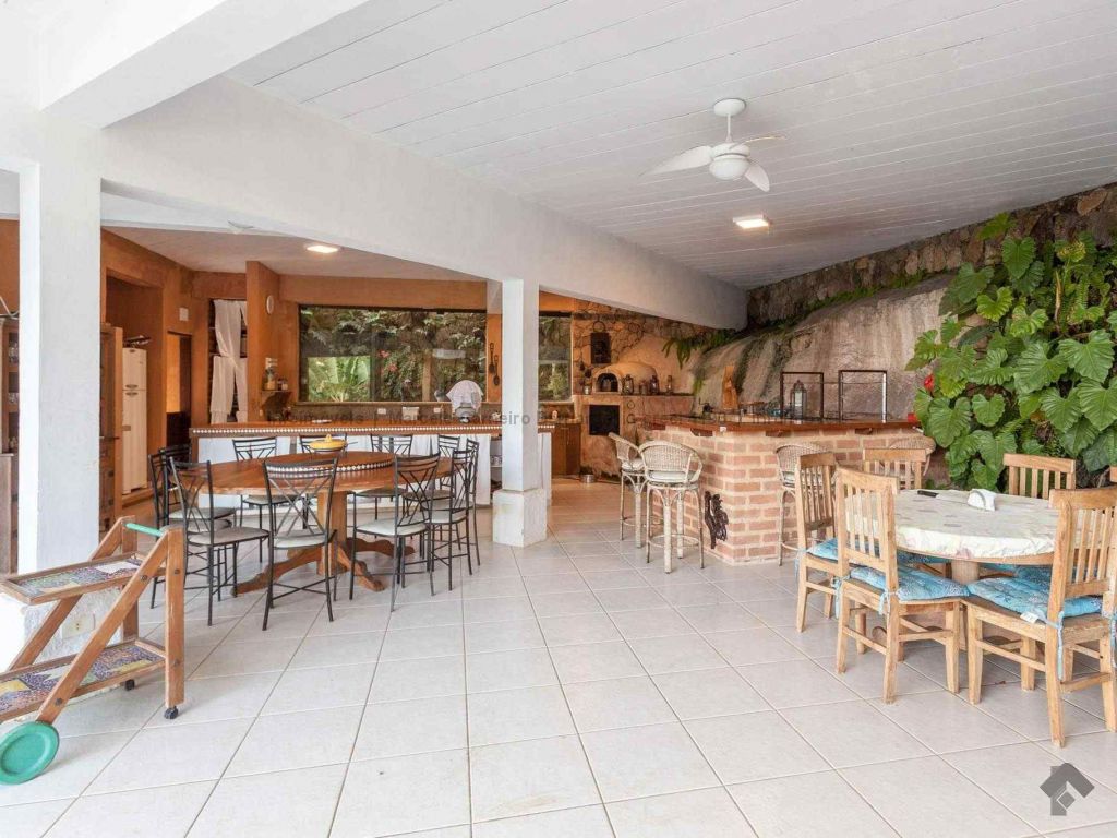 Rodeada de jardins em vários níveis. Piscina com borda infinita com vista para o mar, com área de lazer ao redor. No térreo há 06 suítes, todas com vista para o mar, lavabo, grande cozinha gourmet, forno de pizza, fogão a lenha, churrasqueira e área de convívio social com TV digital. No 1º andar, há outras 05 suítes, sendo que uma delas, além da vista para o mar, tem também vista para a Mata Atlântica. Ainda no 1º andar, uma outra cozinha, lavabo e grande sala de convívio social com TV digital e lareira. Há ainda sala de jantar e sala para jogos. Extensa e larga varanda e jardim contornam grande parte da mansão. O imóvel é dotado de uma plataforma elevatória externa e todas as suítes possuem ar-condicionado.