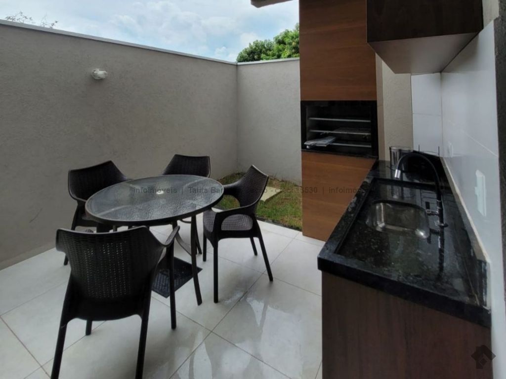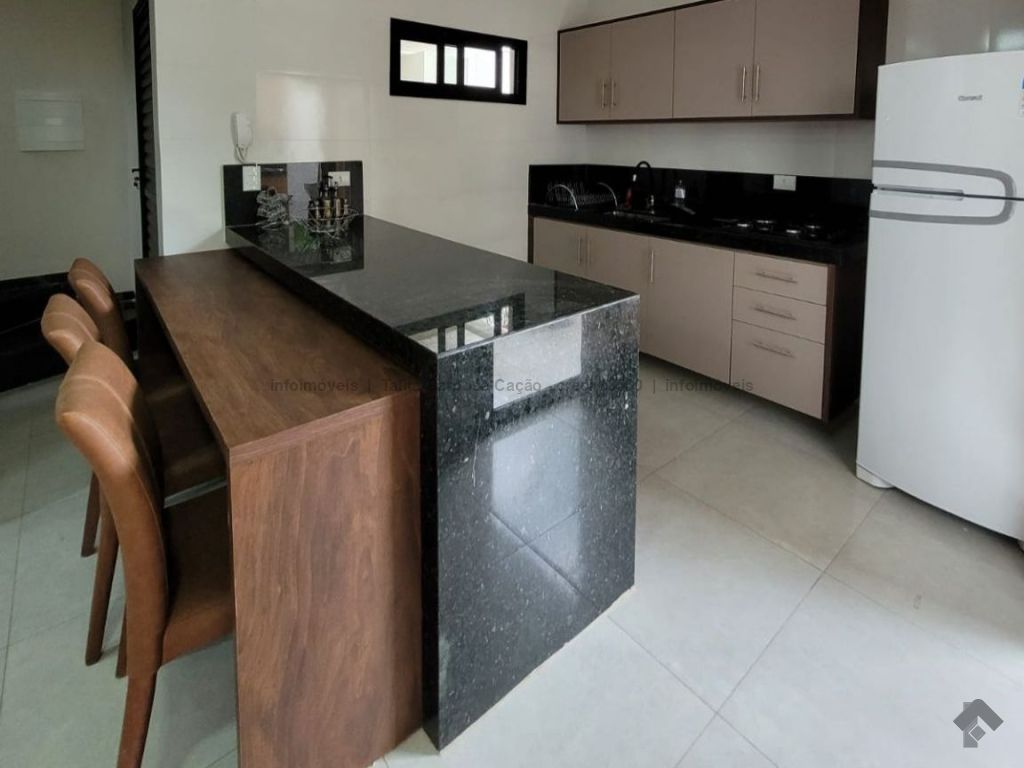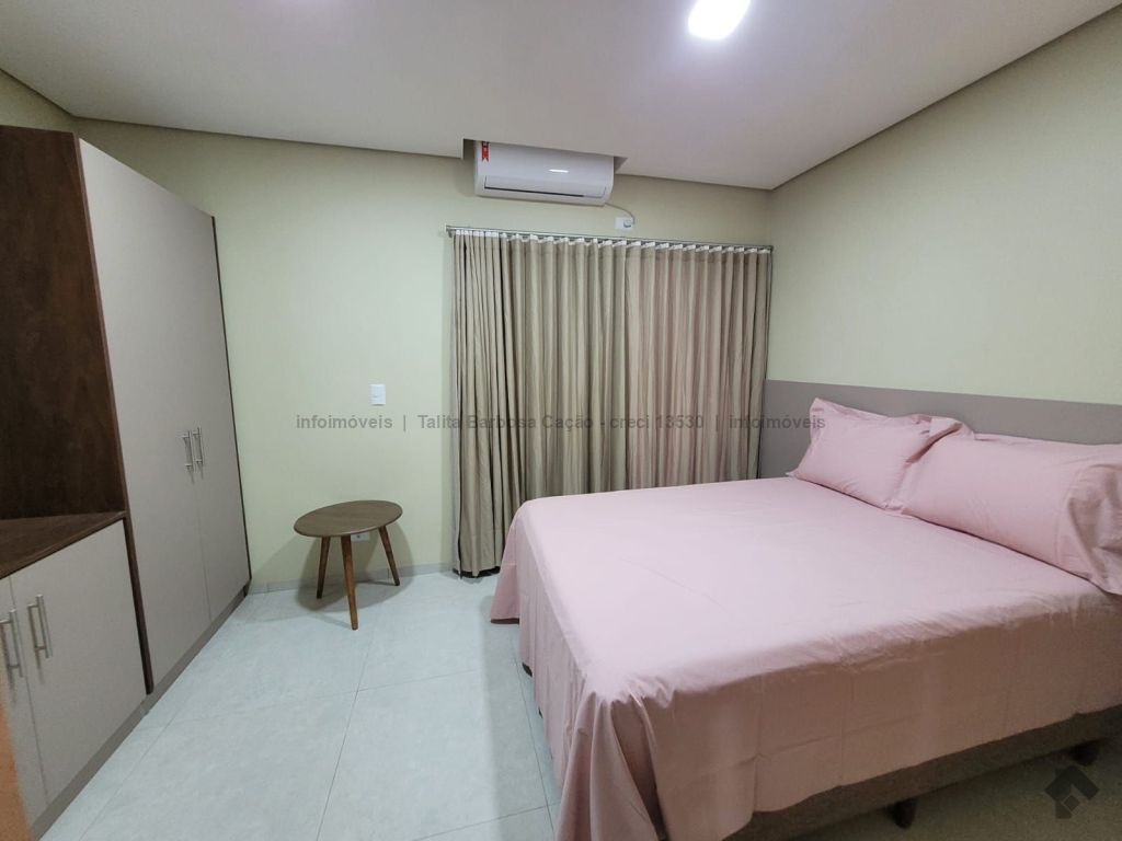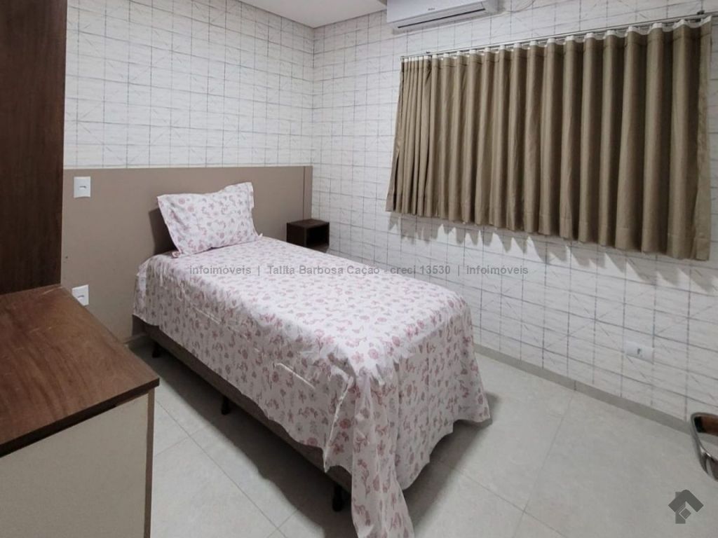 Sobrado mobiliado com móveis de primeira linha, localizado em condomínio seguro. O imóvel tem 3 quartos com ar-condicionado, sendo 1 suíte, lavabo, sala, cozinha, garagem e área externa com churrasqueira.