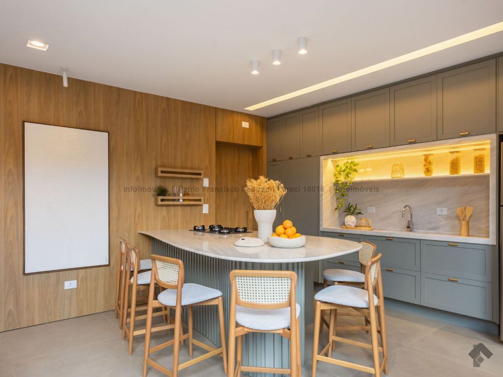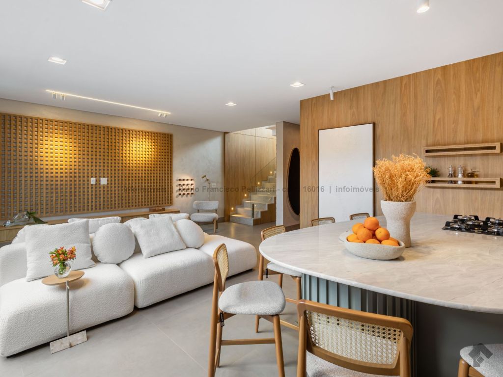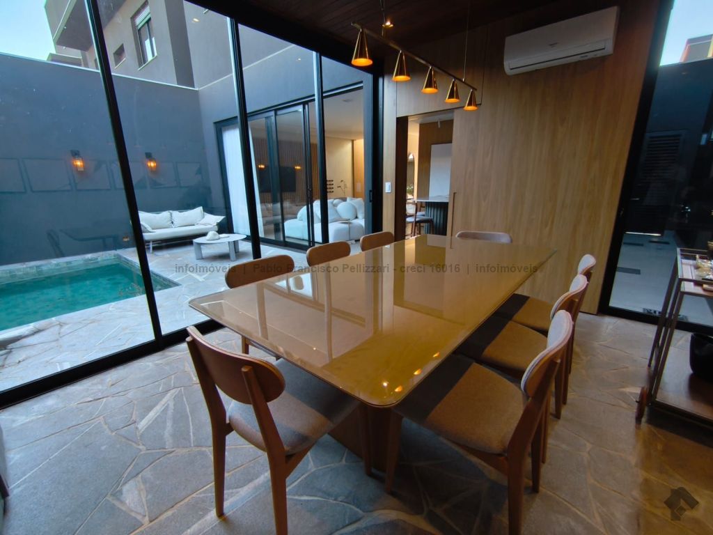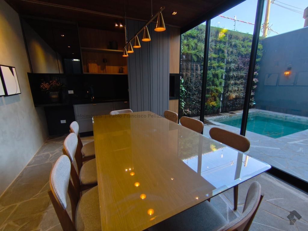 O imóvel conta no térreo com lavabo, ampla sala 2 ambientes, cozinha com área gourmet integrada com churrasqueira, piscina e garagem coberta para 2 veículos. No piso superior, 3 suítes com janelas em esquadrias de alumínio e persianas embutidas automatizadas. Diferenciais do imóvel: fino acabamento (porcelanatos de 1ª linha e portas e janelas em esquadrias de alumínio), localização e todo decorado.