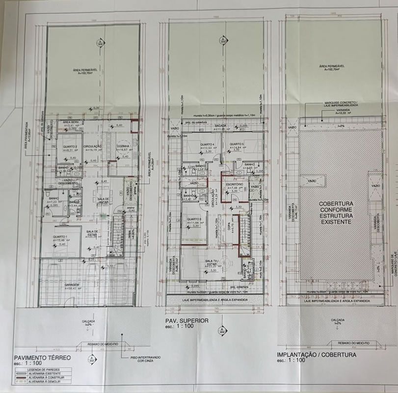 Garagem para 3 carros, projeto amplo com 5 suítes. Destaques do sobrado: terreno de 300 m² com amplo espaço externo permeável, área construída total de mais de 300 m², muito espaço para sua família. Térreo com 2 suítes, sala de estar e jantar, cozinha ampla e banheiro social. Pavimento superior com 3 suítes, sala de TV, copa, escritório e banheiro social.