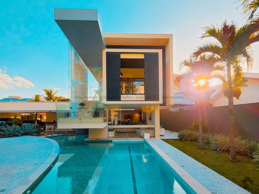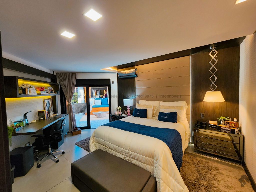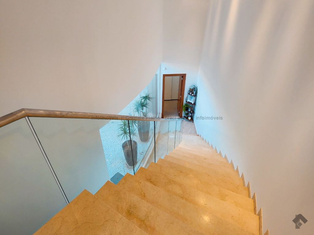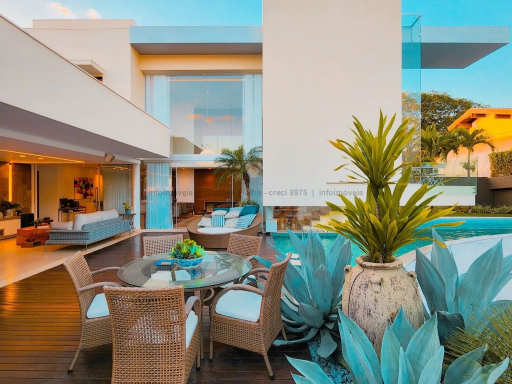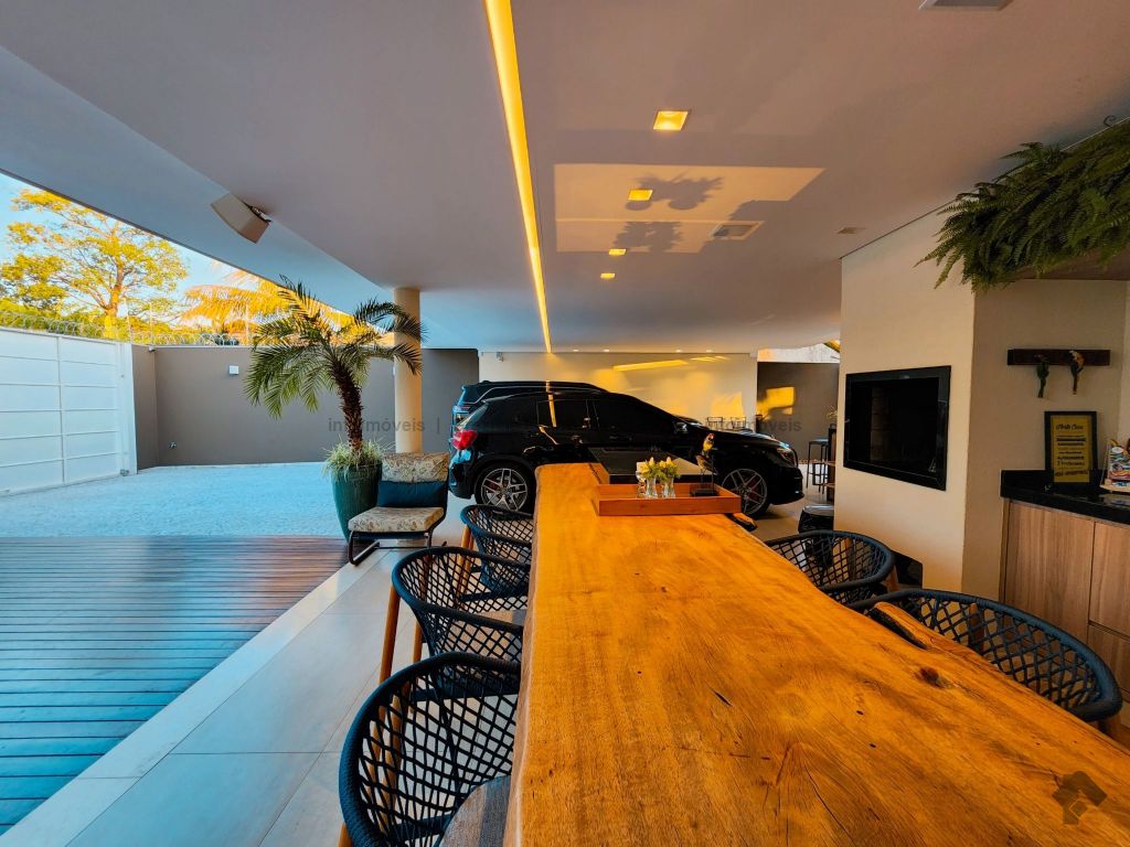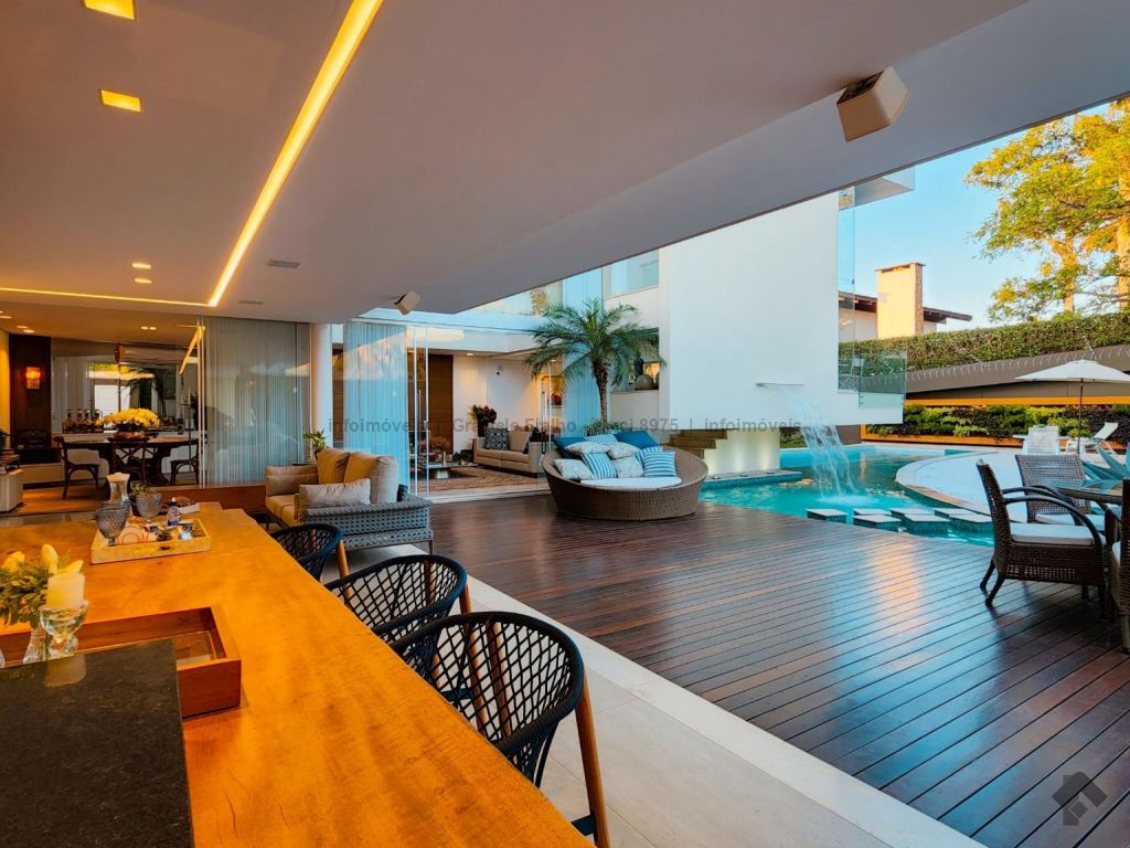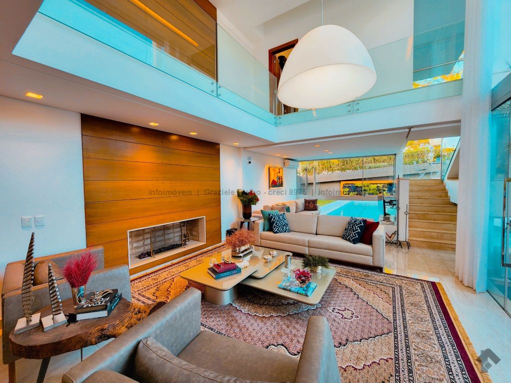 O imóvel chama atenção não só pelo tamanho, más também pela Imponente fachada e pelos modernos traços retos e a integração dos ambientes, suavizada pelo longo espelho d’água que guiam todos que chegam até a entrada principal. Piso térreo: ampla sala 3 ambientes, lareira, lavabo, adega fechada, 1 suíte com closet, o banheiro ainda conta com um lindo jardim de inverno, cozinha totalmente planejada, despensa, área de serviço, banheiro externo e canil. Piso superior: conta com 2 suítes ricas em detalhes e acabamento, sendo uma delas com vista para piscina. Ampla varanda gourmet totalmente planejada e decorada a madeira ganhou destaque deixando o ambiente mais aconchegante. Sistema de som integrado, piscina.