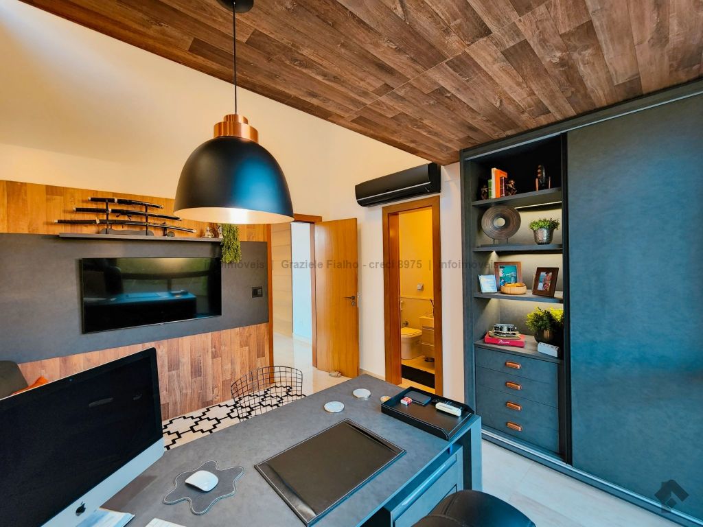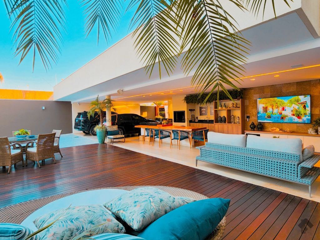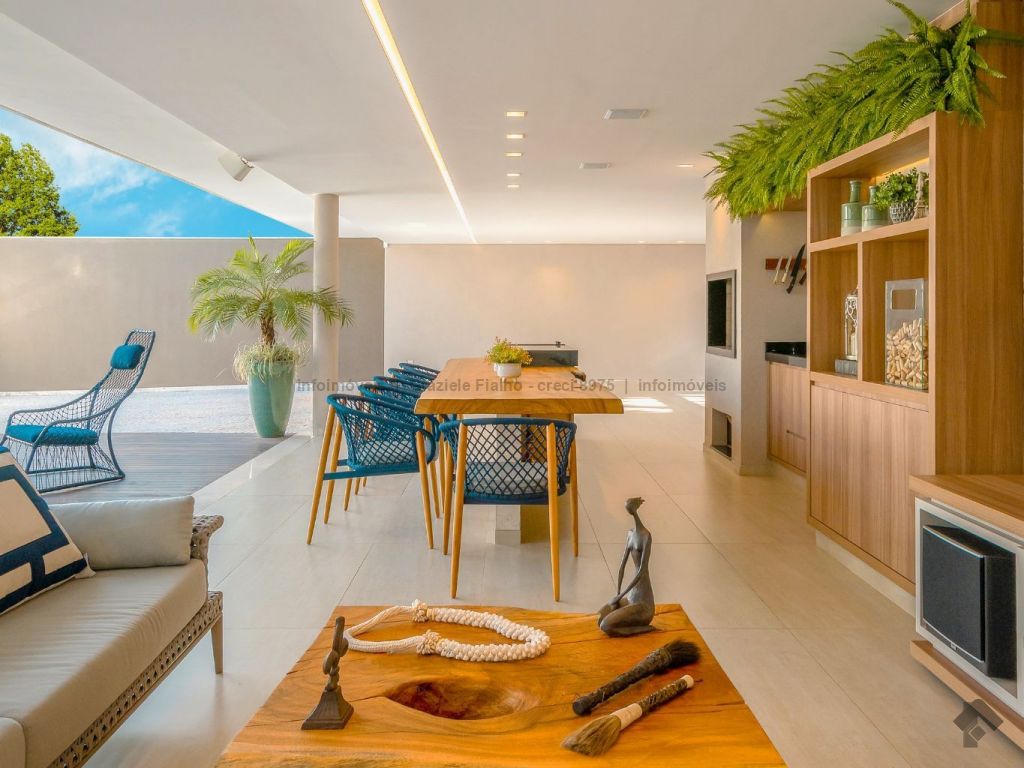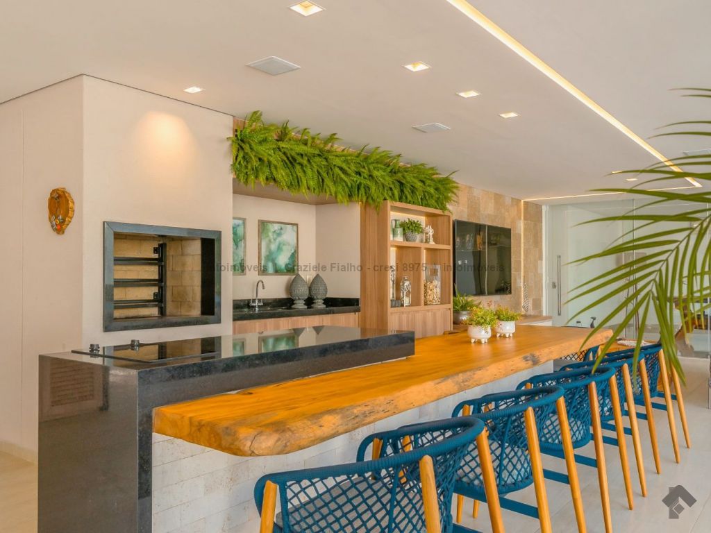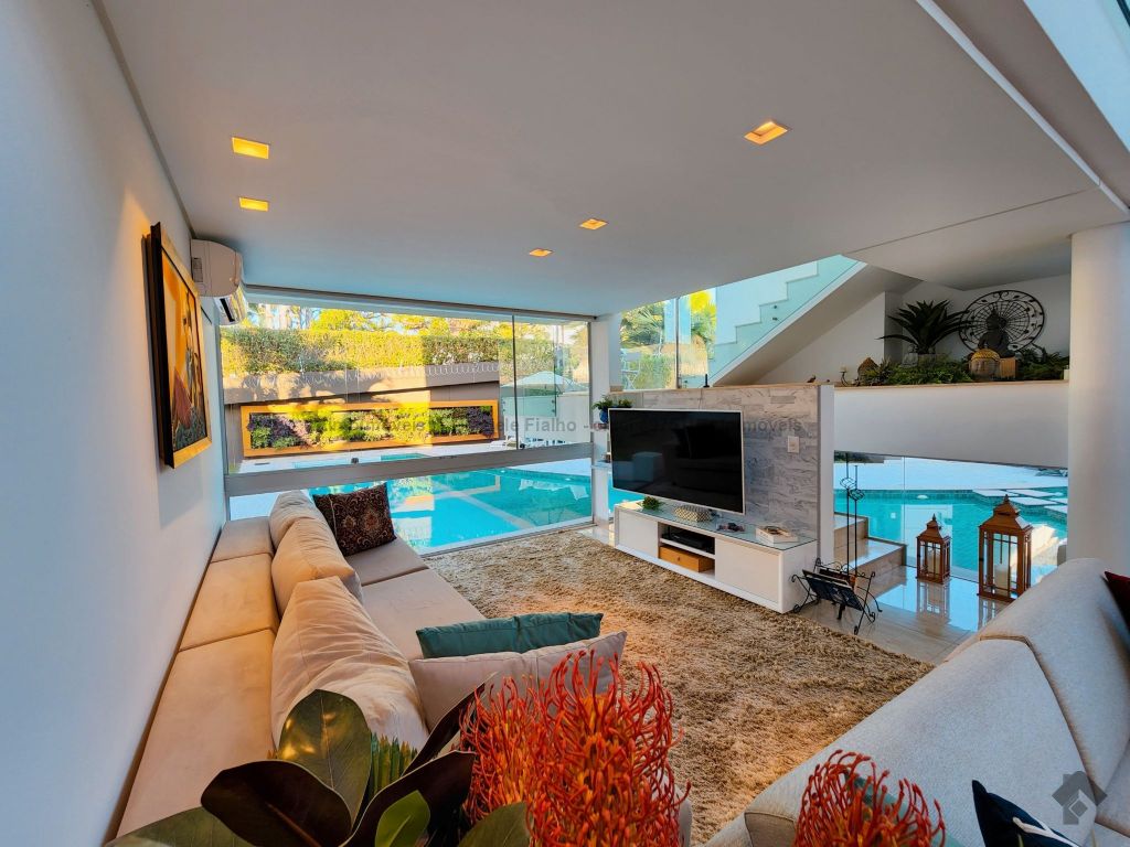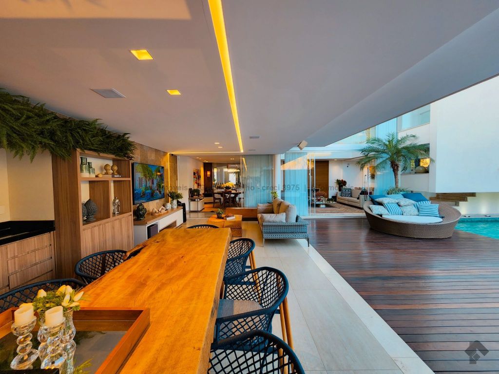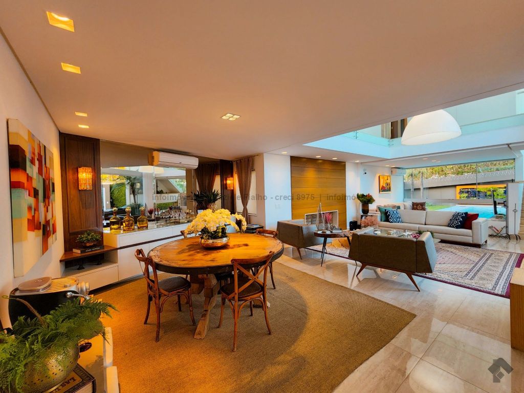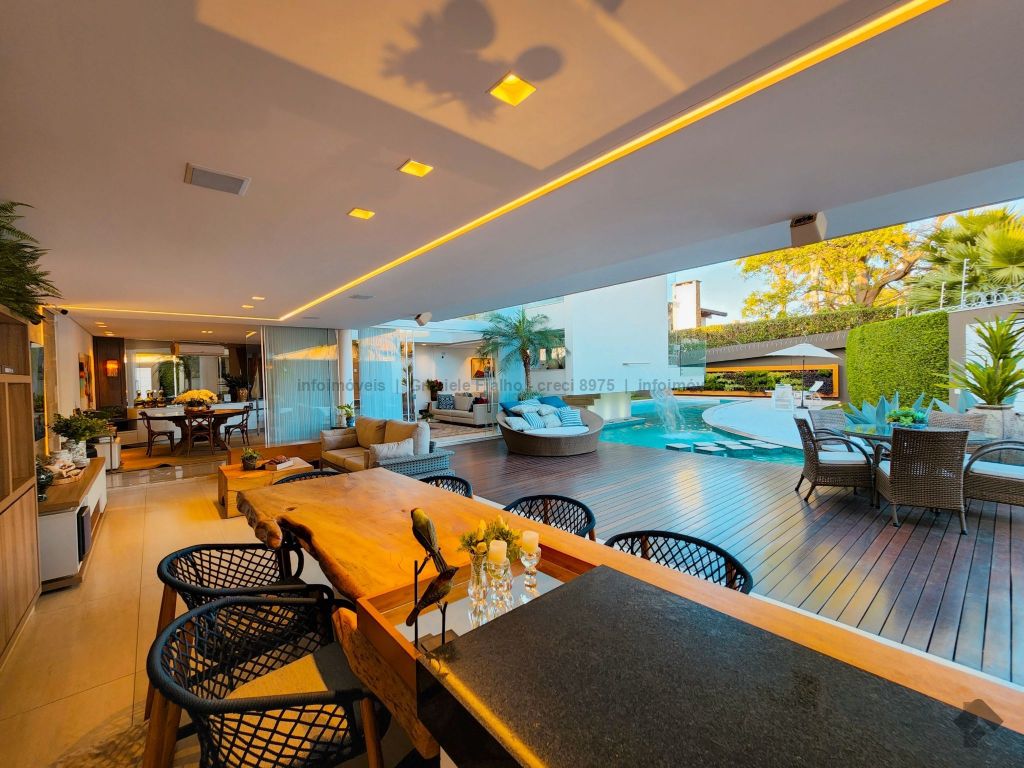 O imóvel chama atenção não só pelo tamanho, más também pela Imponente fachada e pelos modernos traços retos e a integração dos ambientes, suavizada pelo longo espelho d’água que guiam todos que chegam até a entrada principal. Piso térreo: ampla sala 3 ambientes, lareira, lavabo, adega fechada, 1 suíte com closet, o banheiro ainda conta com um lindo jardim de inverno, cozinha totalmente planejada, despensa, área de serviço, banheiro externo e canil. Piso superior: conta com 2 suítes ricas em detalhes e acabamento, sendo uma delas com vista para piscina. Ampla varanda gourmet totalmente planejada e decorada a madeira ganhou destaque deixando o ambiente mais aconchegante. Sistema de som integrado, piscina.