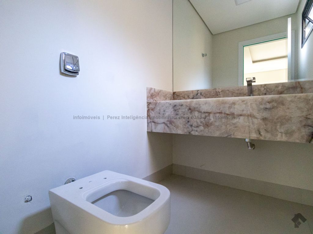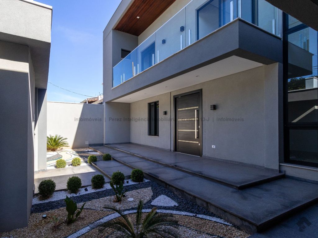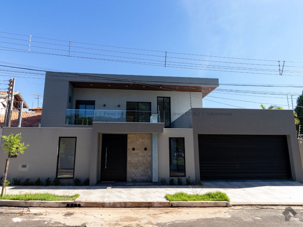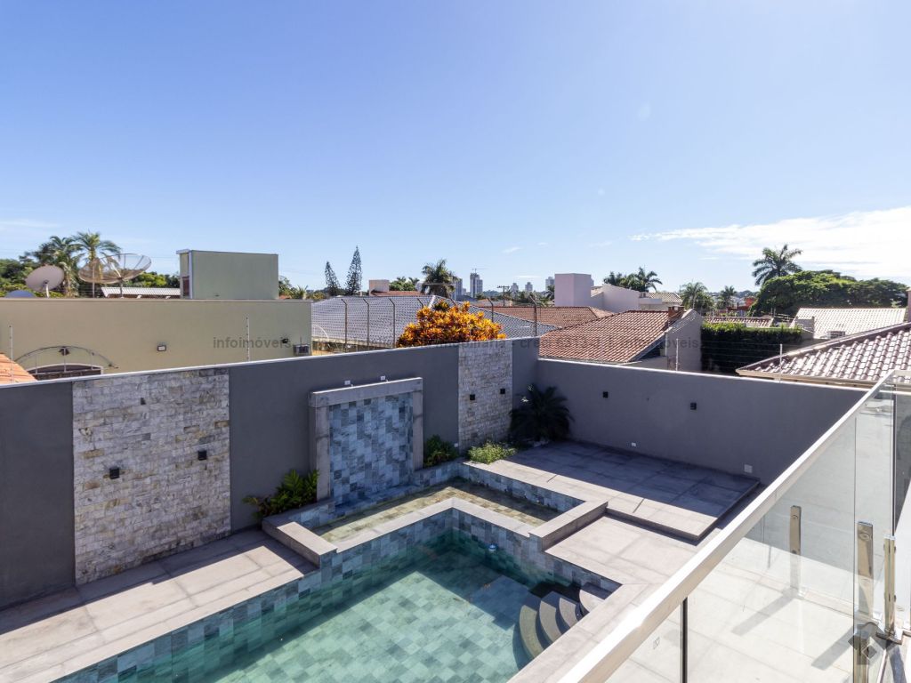 Sobrado de alto padrão com 392,37 m² de área construída e terreno de 525,00 m². Piso inferior: uma sala de estar, um lavabo com revestimento em ônix natural, uma sala de TV, uma sala de jantar, uma cozinha com bancadas em preto São Gabriel, uma suíte, uma área de serviço ampla e prática, um banheiro de serviço e um jardim de inverno. Piso superior: quatro suítes, sendo uma suíte master com closet e banheiros em quartzo Stellar branco, três sacadas. Área externa e lazer: uma varanda ampla e coberta, uma área gourmet, uma piscina, uma piscina infantil aquecida, um banheiro externo, quatro vagas de garagem cobertas.