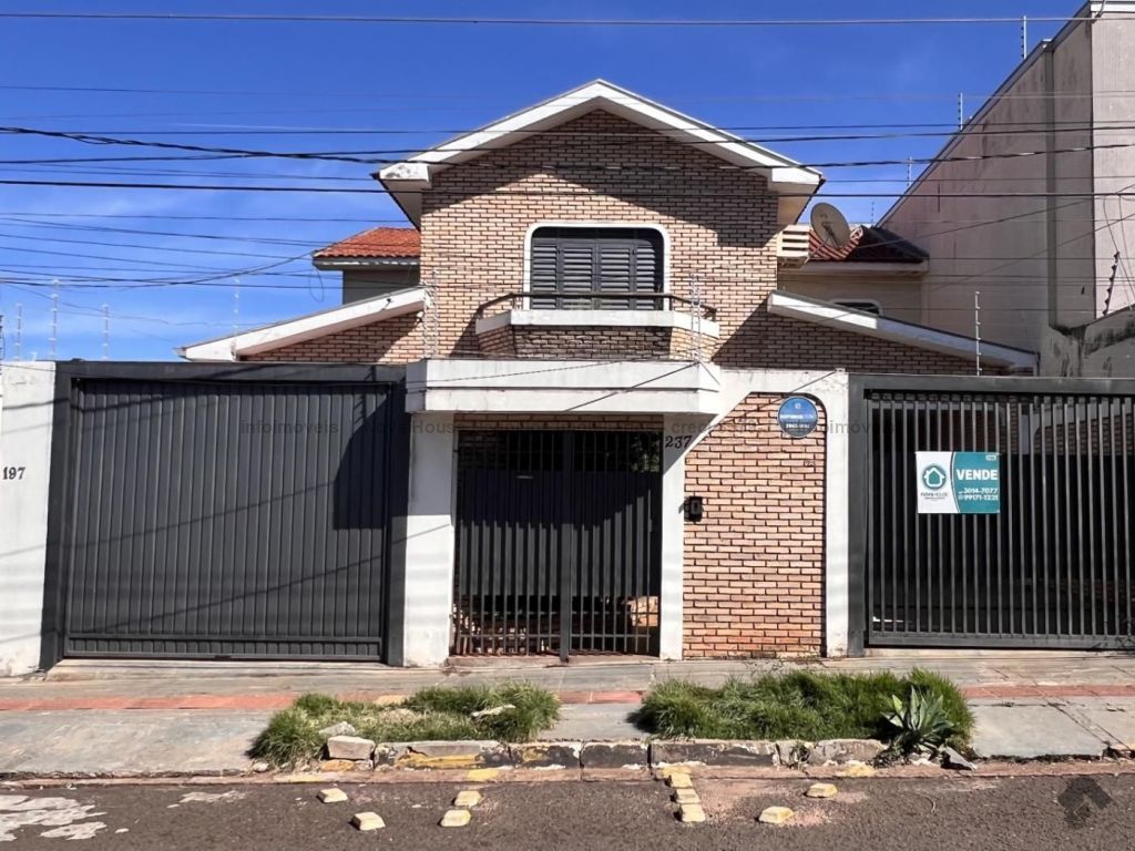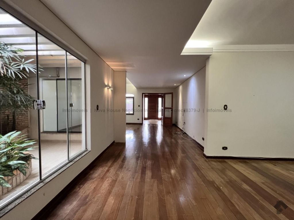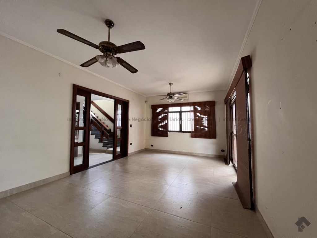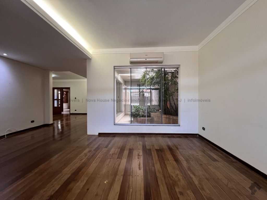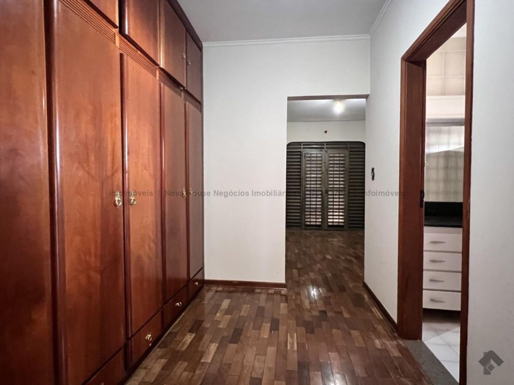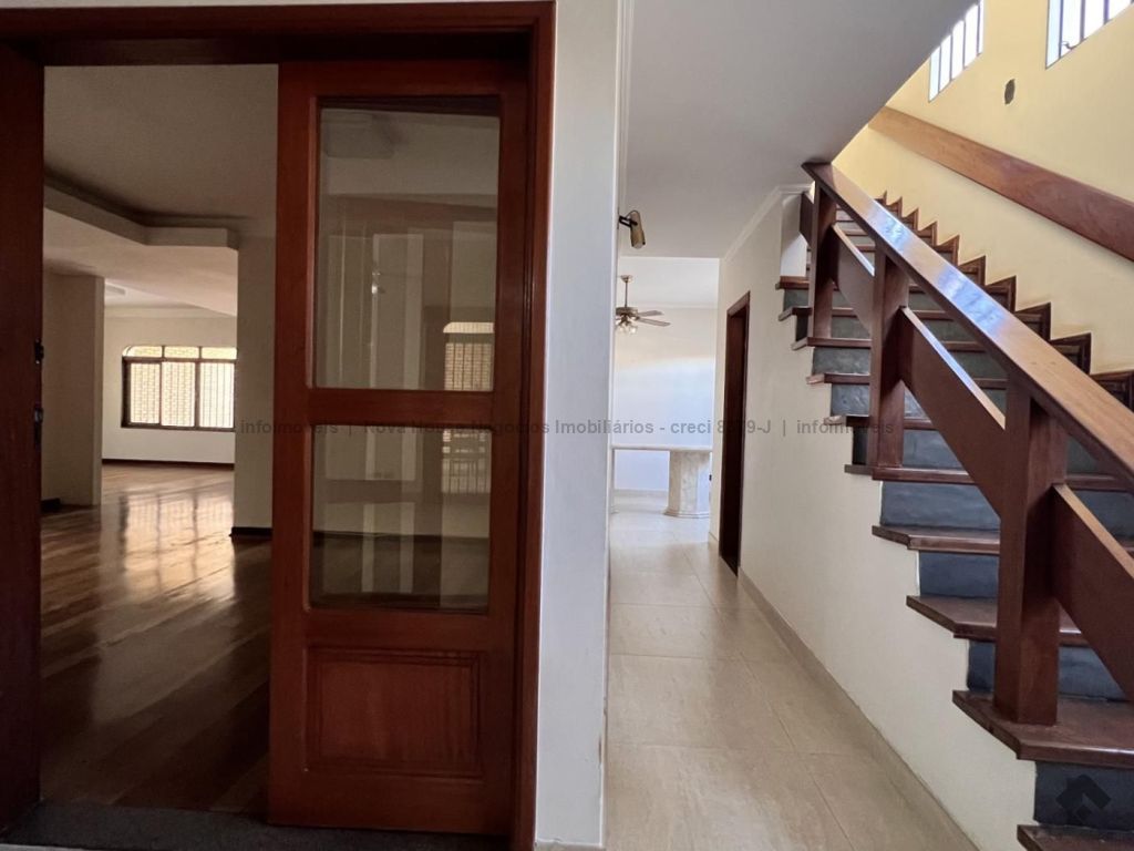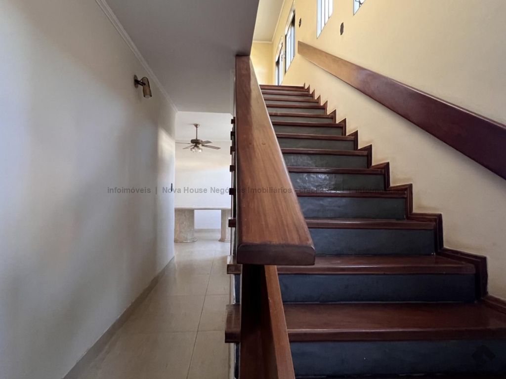 Piso térreo: sala para três ambientes, sala íntima, cozinha, área de serviço, banheiro de serviço, despensa, varanda. Piso superior: três suítes, um quarto, sala íntima, depósito, varanda.
