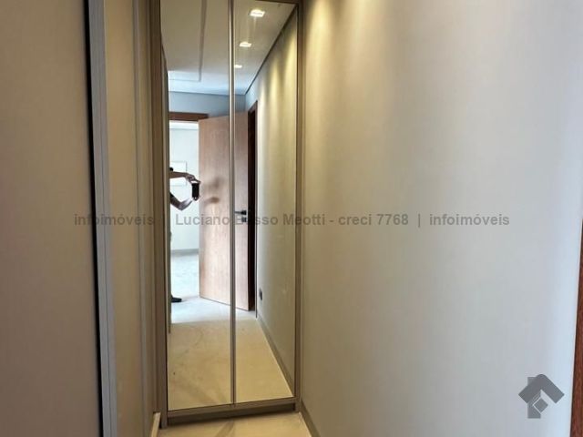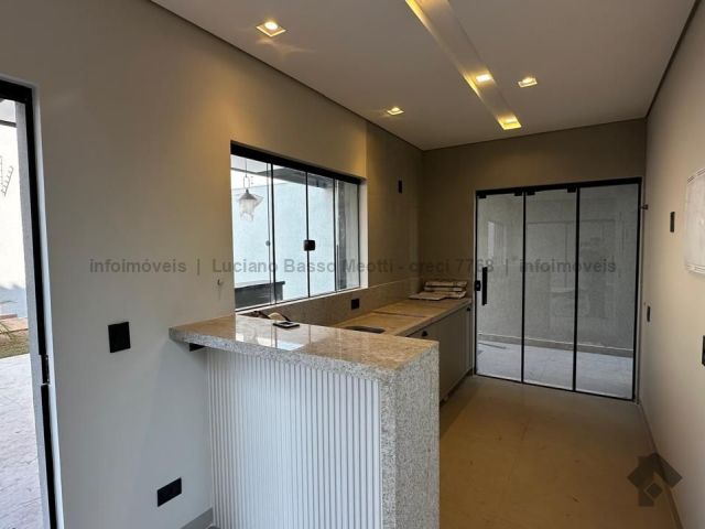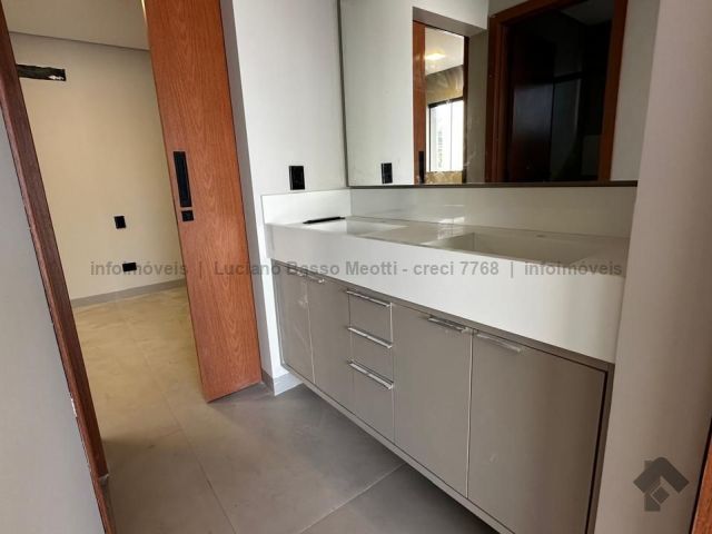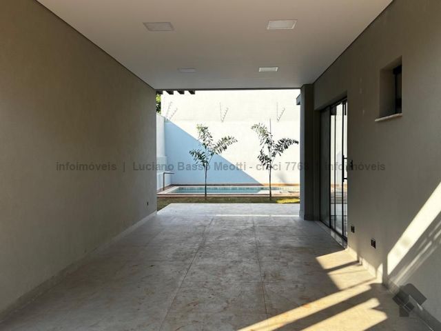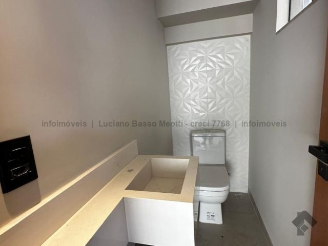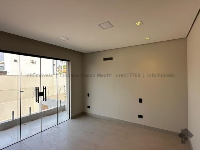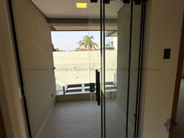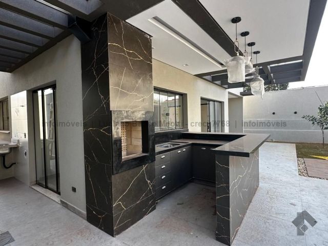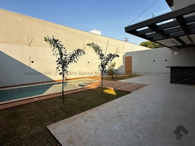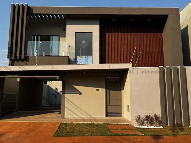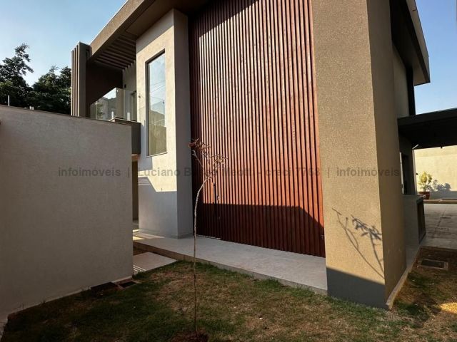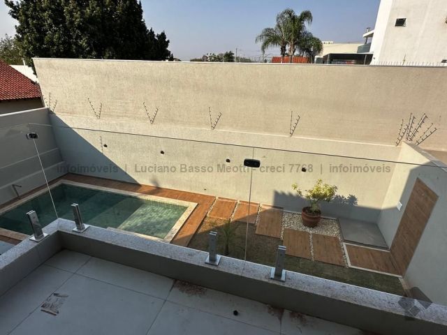 Sobrado alto padrão contendo: no térreo: sala de TV, sala de jantar integrada com a cozinha, lavanderia, garagem coberta, área gourmet e área de lazer com piscina. No andar superior: uma suíte com sacada voltada para a fachada frontal e duas demi-suites, sendo uma com sacada voltada para a fachada posterior.