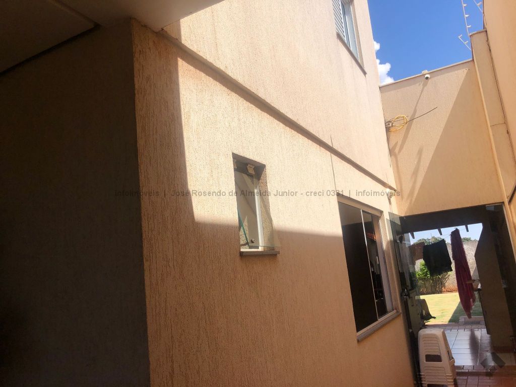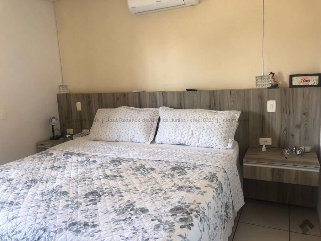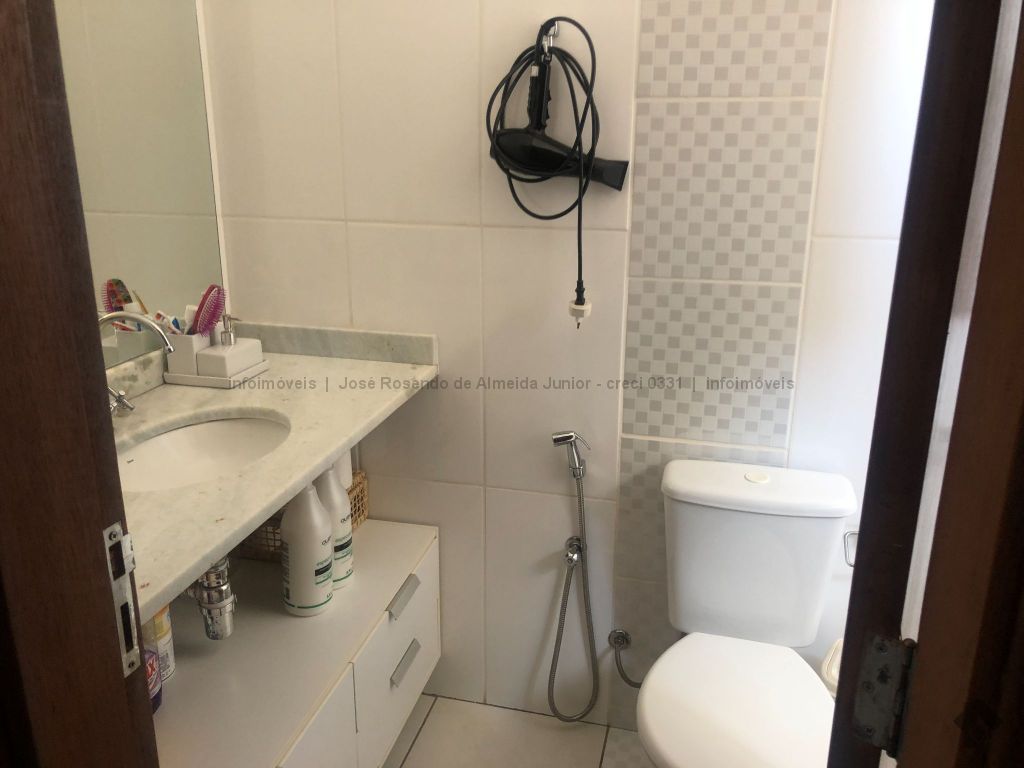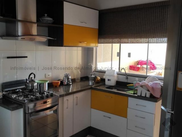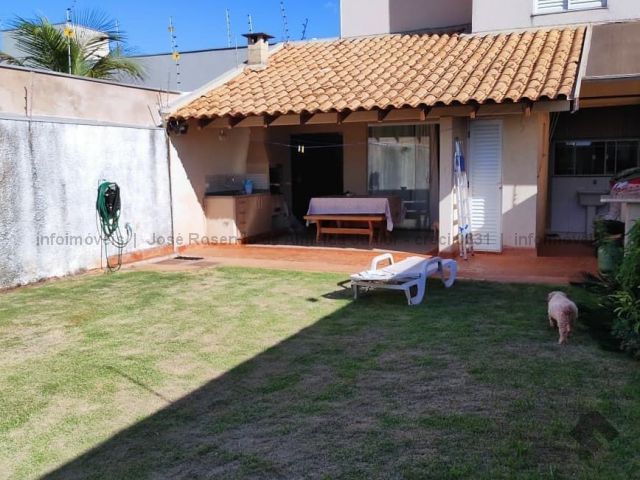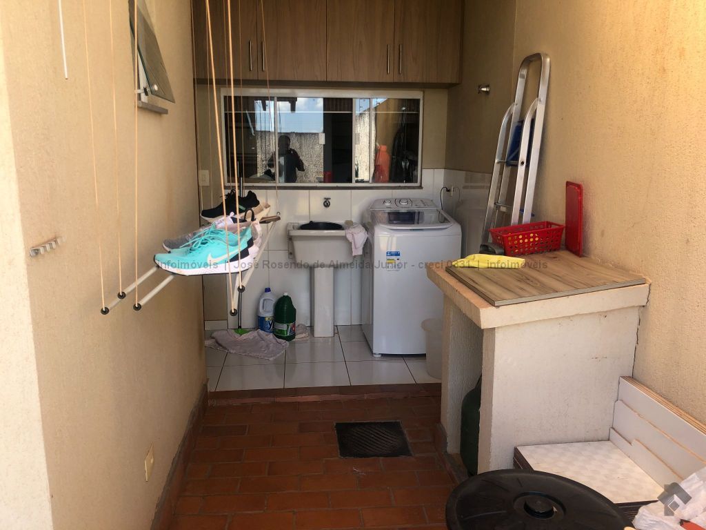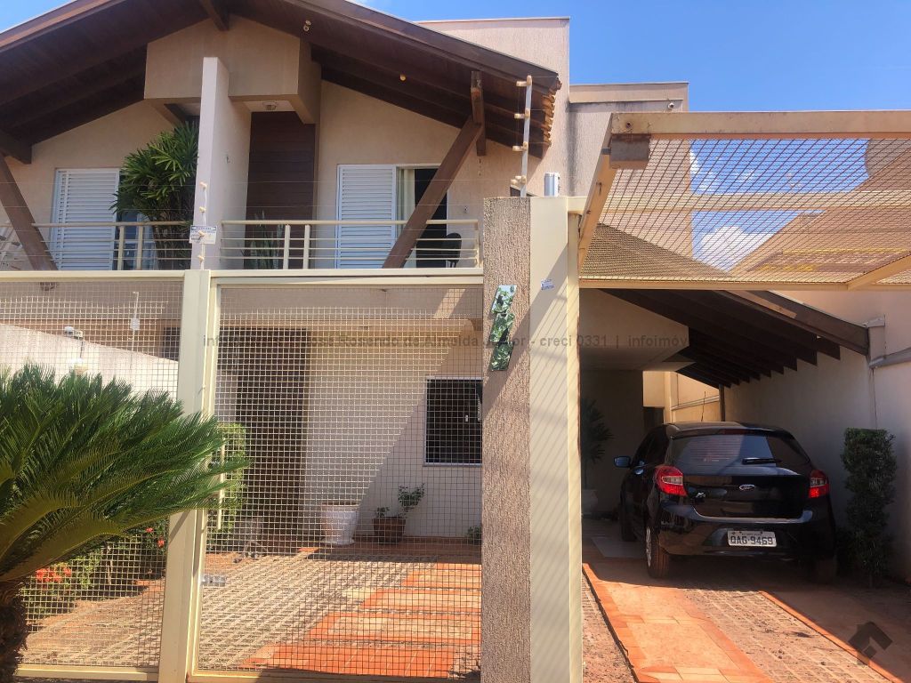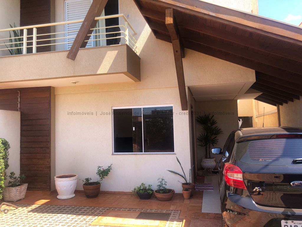 Sobrado com três quartos sendo um suíte, banheiro social, cozinha planejada, sala de estar, sala de jantar, lavabo, lavanderia, garagem para três carros com portão eletrônico, e varanda com churrasqueira.