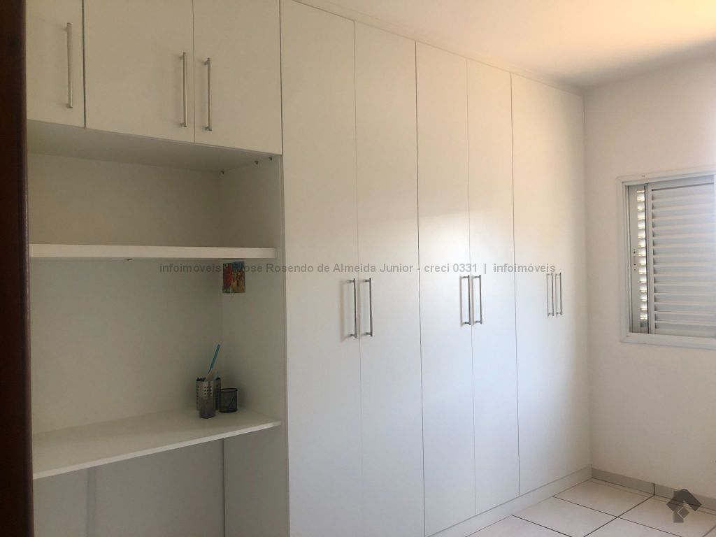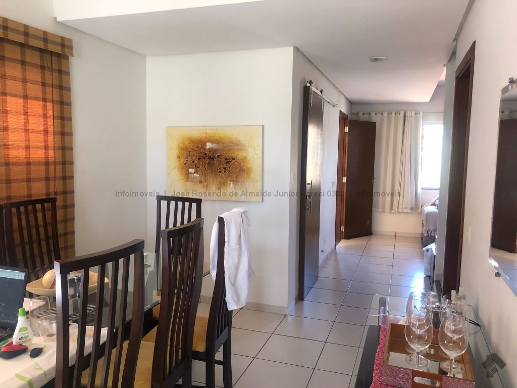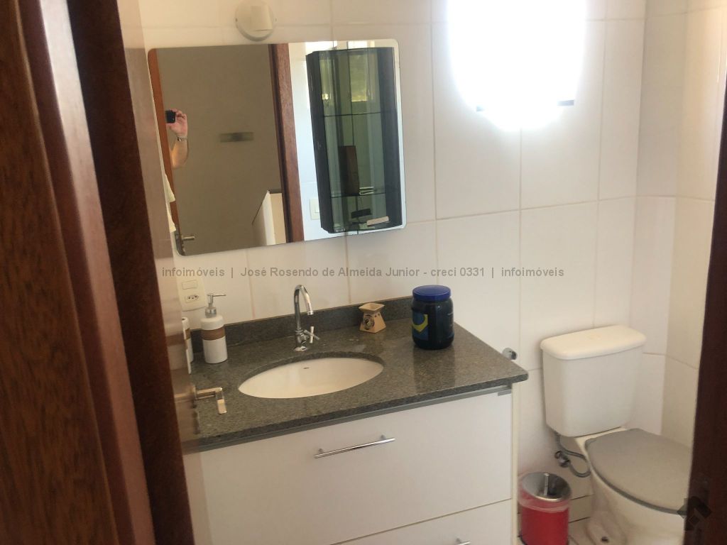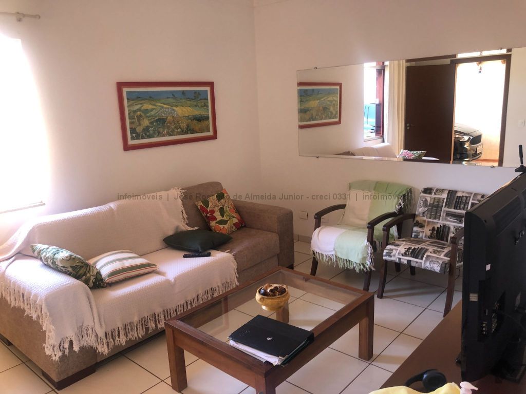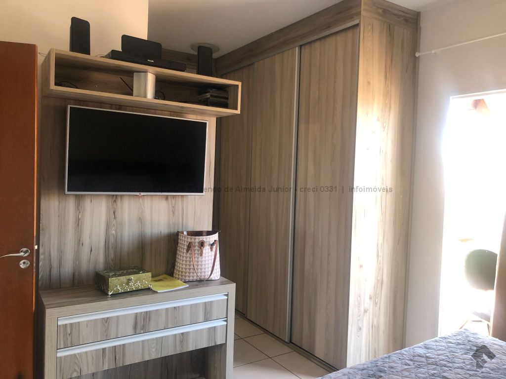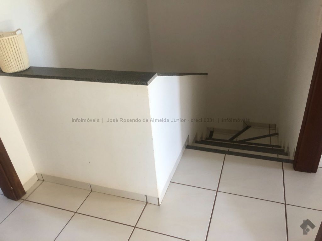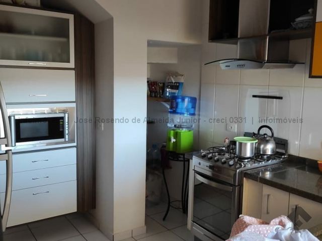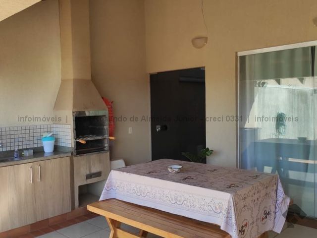 Sobrado com três quartos sendo um suíte, banheiro social, cozinha planejada, sala de estar, sala de jantar, lavabo, lavanderia, garagem para três carros com portão eletrônico, e varanda com churrasqueira.