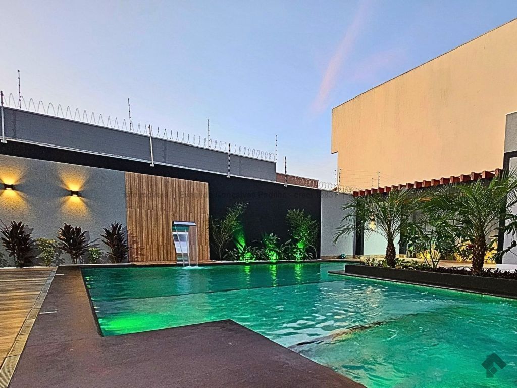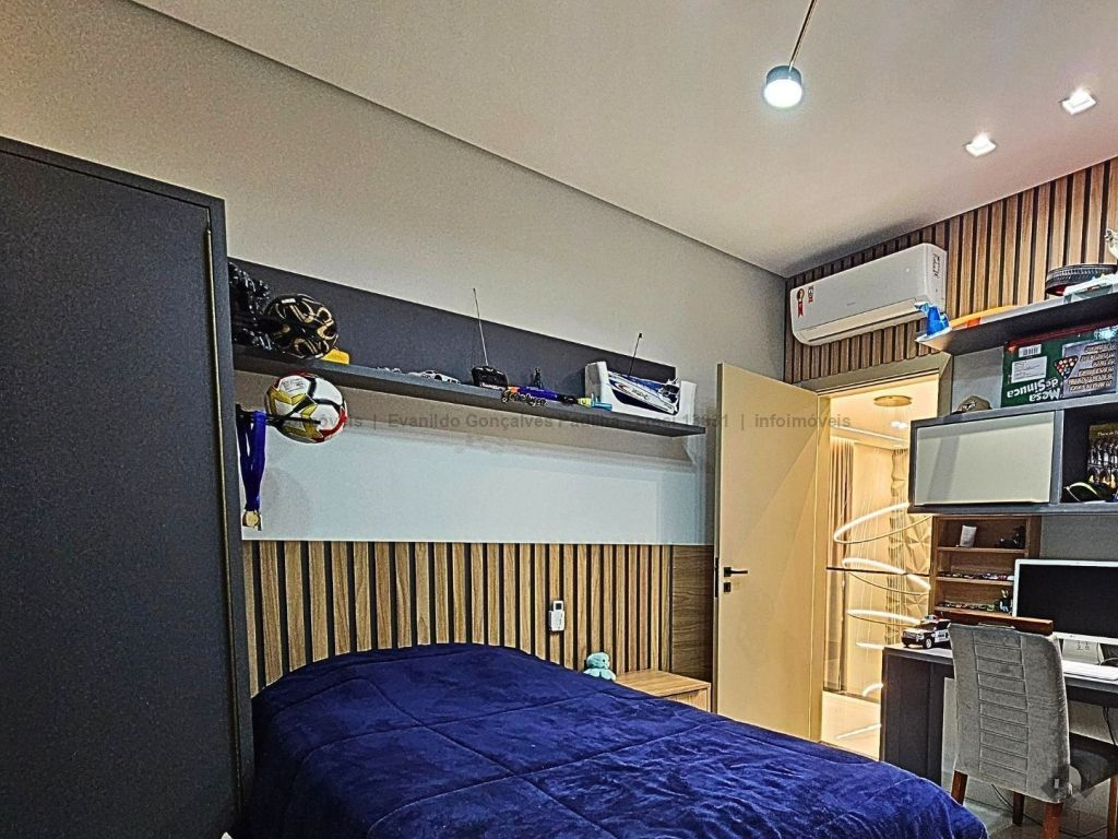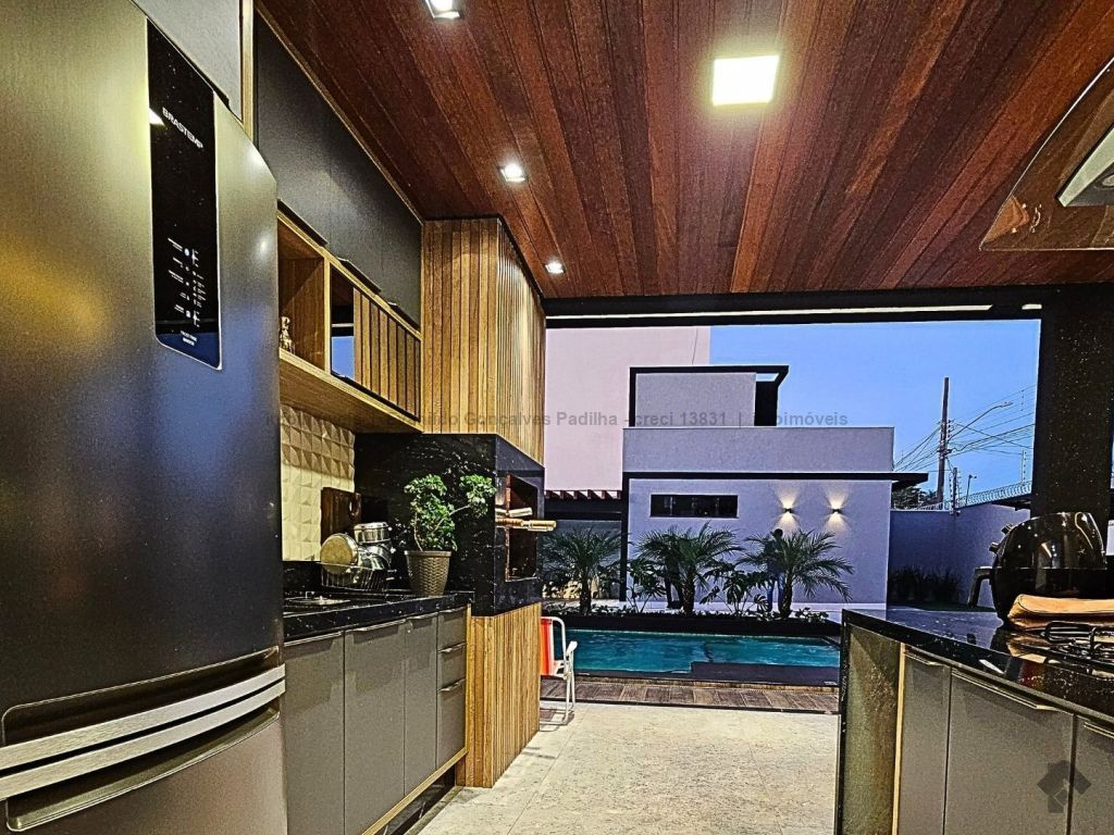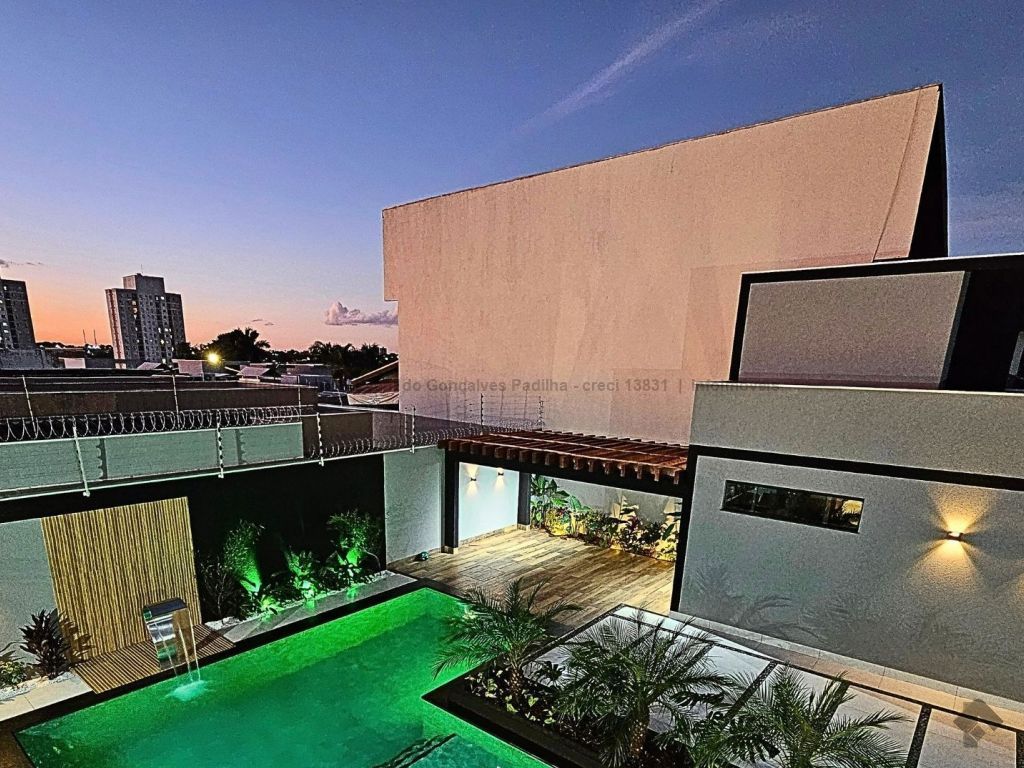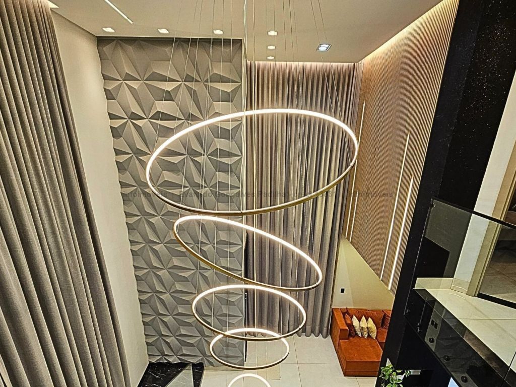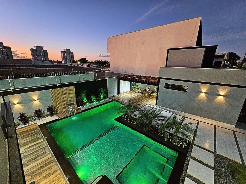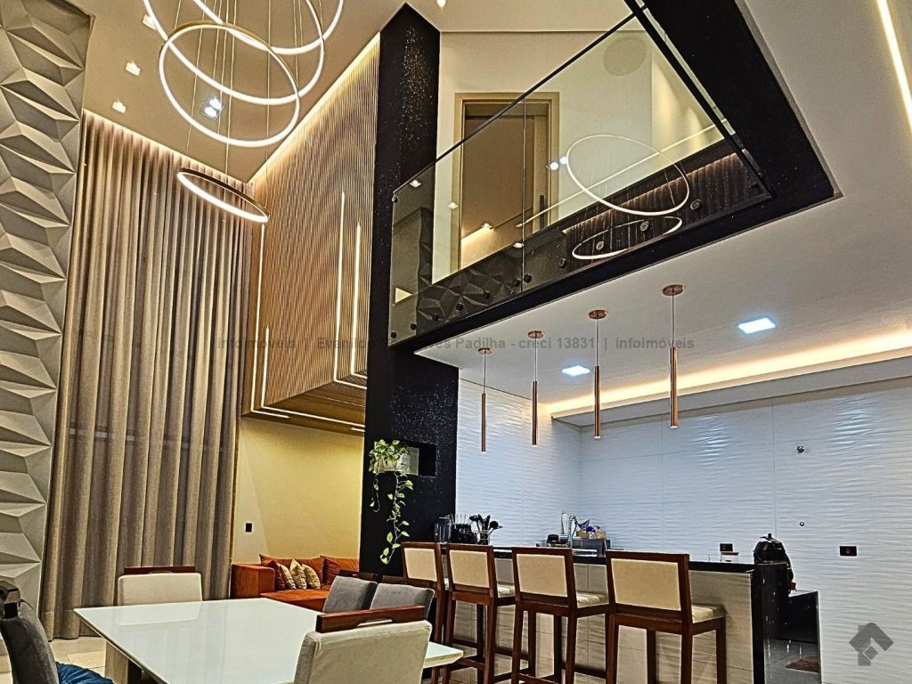 3 suítes amplas na parte superior, todas com armários planejados de alta qualidade, ar condicionado e sacada em todas, todos os banheiros com espelhos, box e armários. Sala ampla para até 3 ambientes, com pé direito alto, lustre, sala de jantar (acompanha mesa de jantar) sanca e iluminação em LED. Hall de entrada. Cozinha estilo americana cuba dupla e torneira mono comando mais geladeira. Espaço gourmet amplo com ilha em mármore, fogão cooktop, coifa e todo com armários planejados. Banheiro na área externa. Escritório. Lavanderia fechada e toda planejada. Duas entradas com portão de elevação. 4 vagas de garagem na entrada principal. Depósito nos fundos. Área de pergolado nos fundos e na piscina.