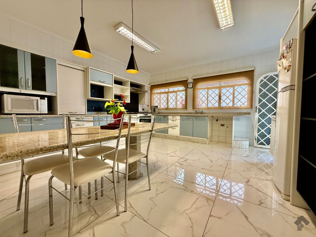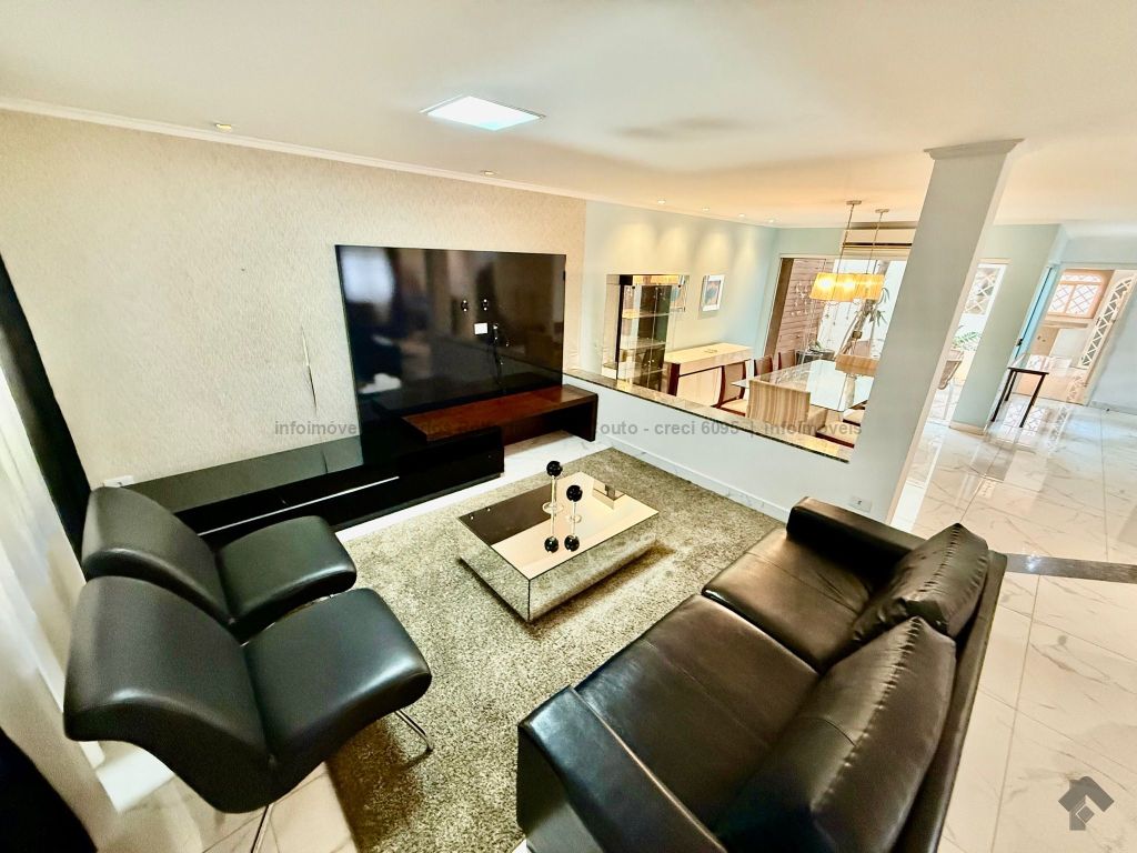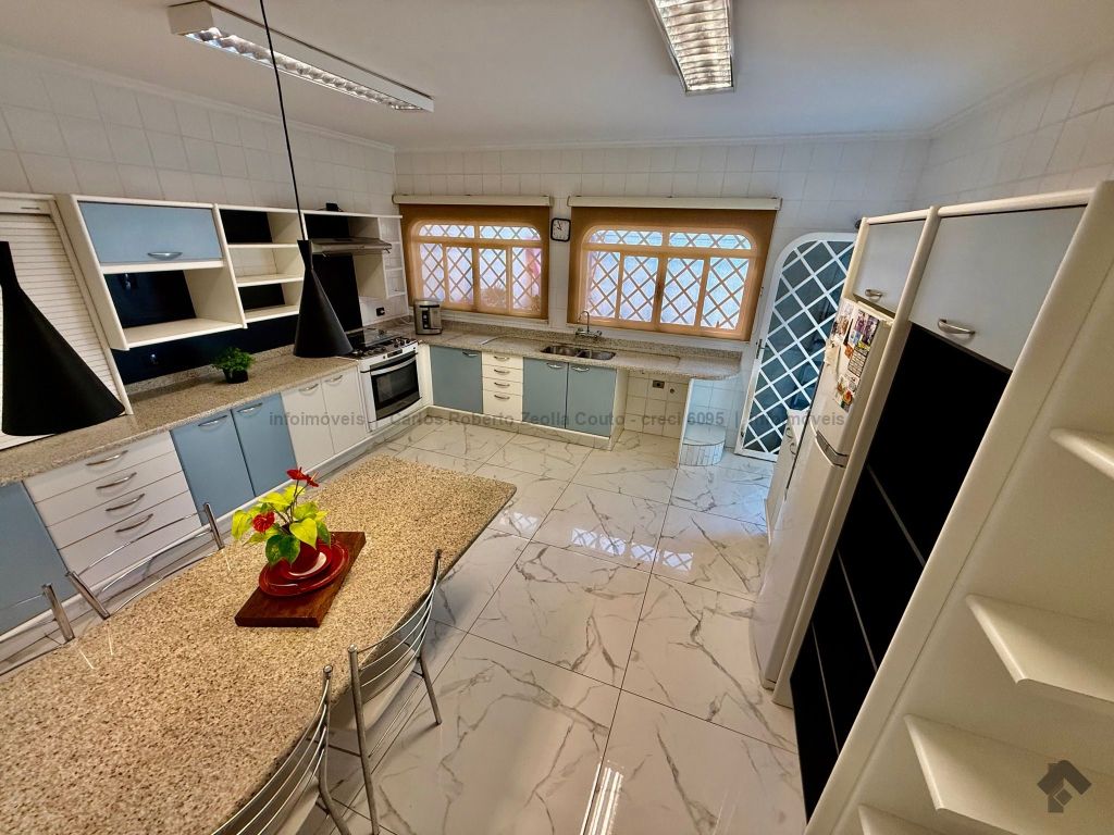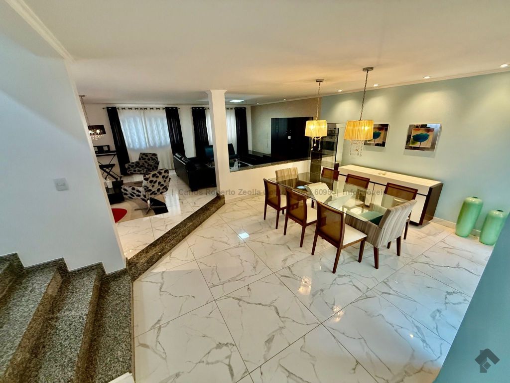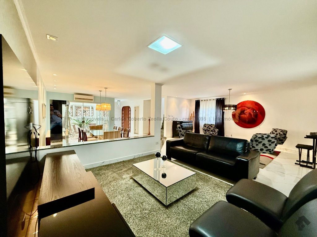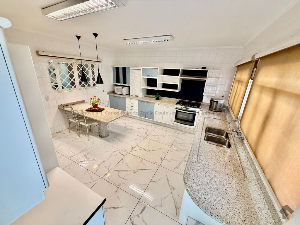 Pavimento térreo: sala 3 ambientes, jardim de inverno, lavabo, cozinha, despensa, quarto de empregada com banheiro. Pavimento superior (1º andar): 1 suíte com closet, 2 quartos com sacada, banheiro social e sala ampla. Pavimento superior (2º andar): escritório, sala (studio), banheiro social, sacada e área de lazer ao ar livre com banheira de ofurô e deck de madeira. Área anexa à casa: área gourmet climatizada e fechada, com sala ampla, churrasqueira e giragrill, bancada de pia contendo fogão e coifa embutidos, painel com TV e mesa de mármore central. Área superior à área gourmet: contém uma sala e uma suíte. 2 vagas de garagem cobertas e 3 vagas de garagem descobertas. Amplo espaço livre de terreno.