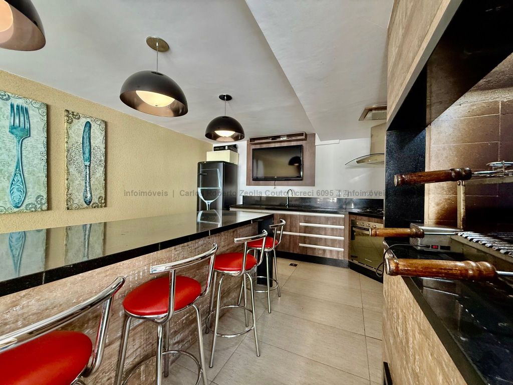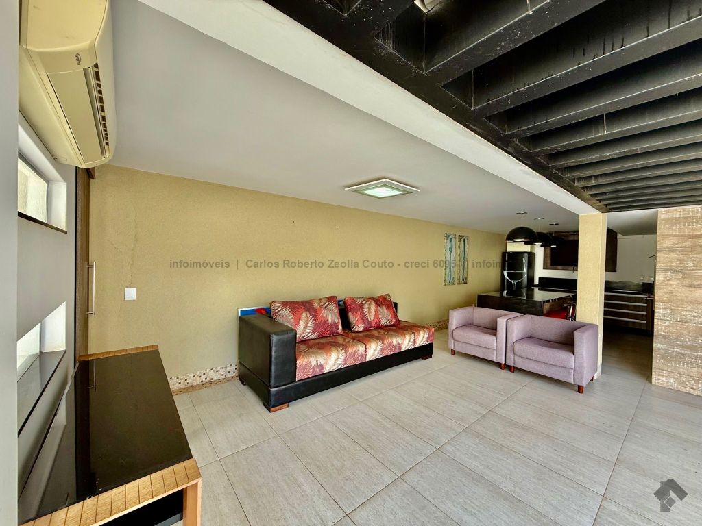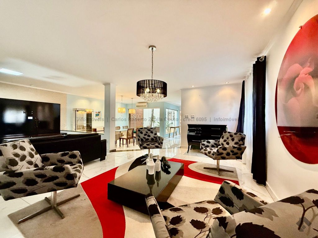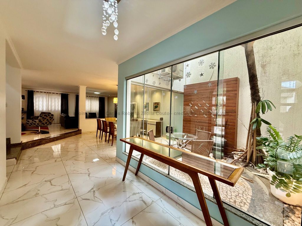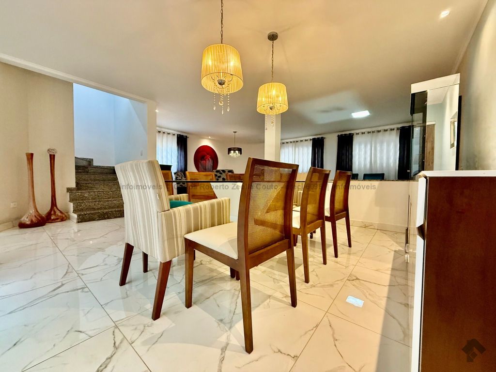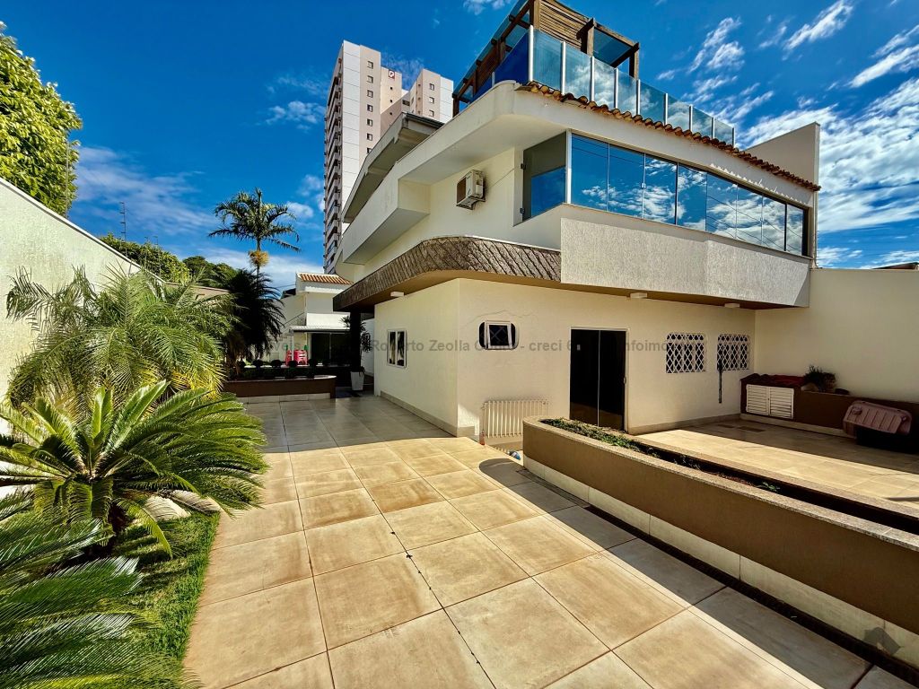 Pavimento térreo: sala 3 ambientes, jardim de inverno, lavabo, cozinha, despensa, quarto de empregada com banheiro. Pavimento superior (1º andar): 1 suíte com closet, 2 quartos com sacada, banheiro social e sala ampla. Pavimento superior (2º andar): escritório, sala (studio), banheiro social, sacada e área de lazer ao ar livre com banheira de ofurô e deck de madeira. Área anexa à casa: área gourmet climatizada e fechada, com sala ampla, churrasqueira e giragrill, bancada de pia contendo fogão e coifa embutidos, painel com TV e mesa de mármore central. Área superior à área gourmet: contém uma sala e uma suíte. 2 vagas de garagem cobertas e 3 vagas de garagem descobertas. Amplo espaço livre de terreno.
