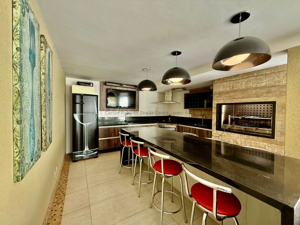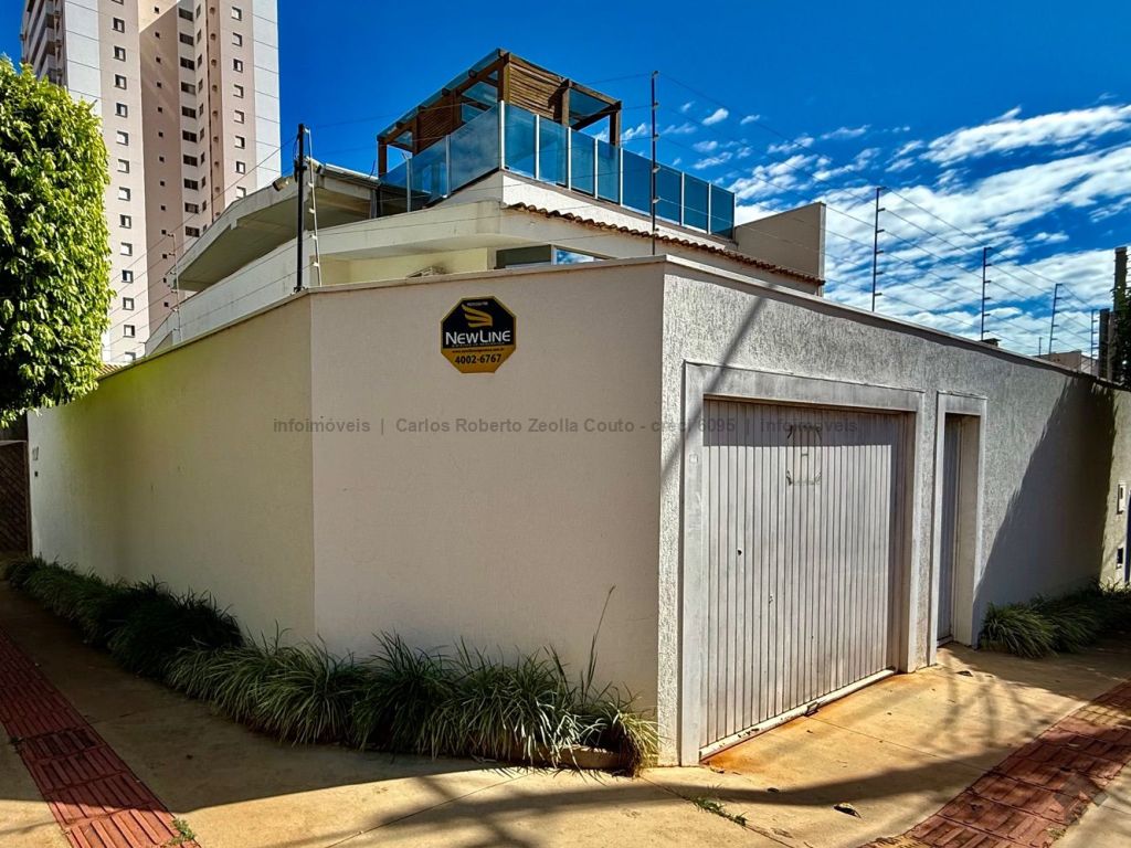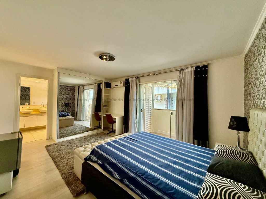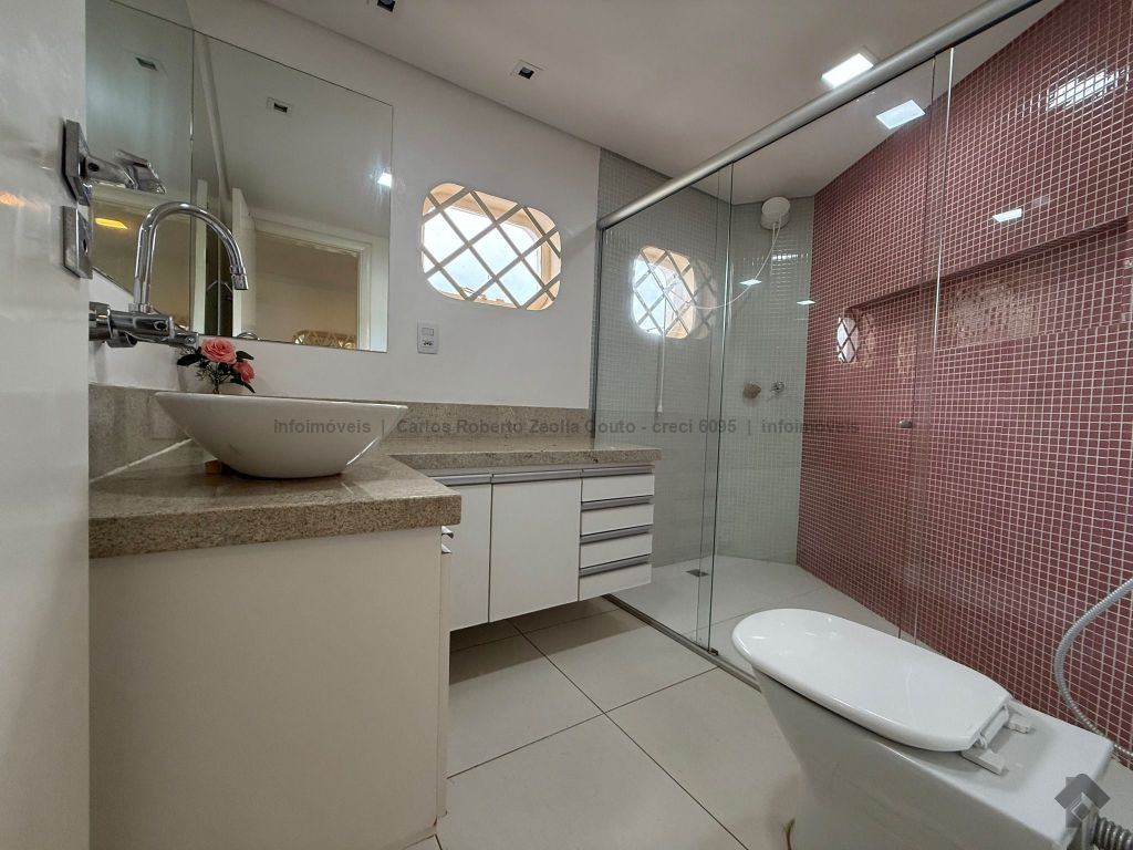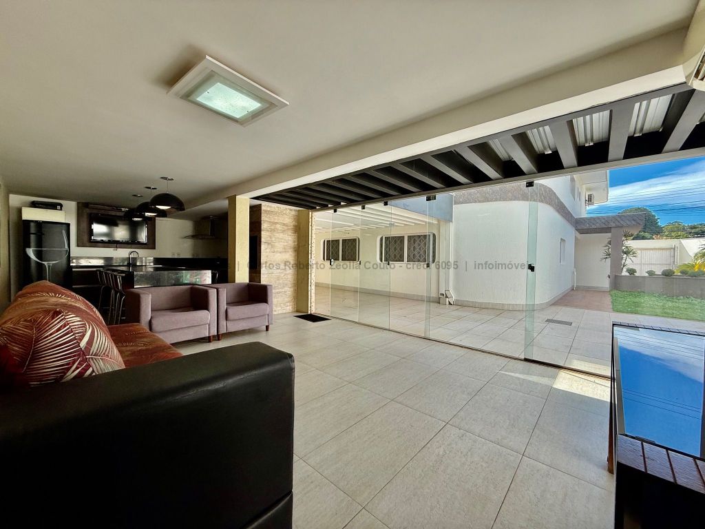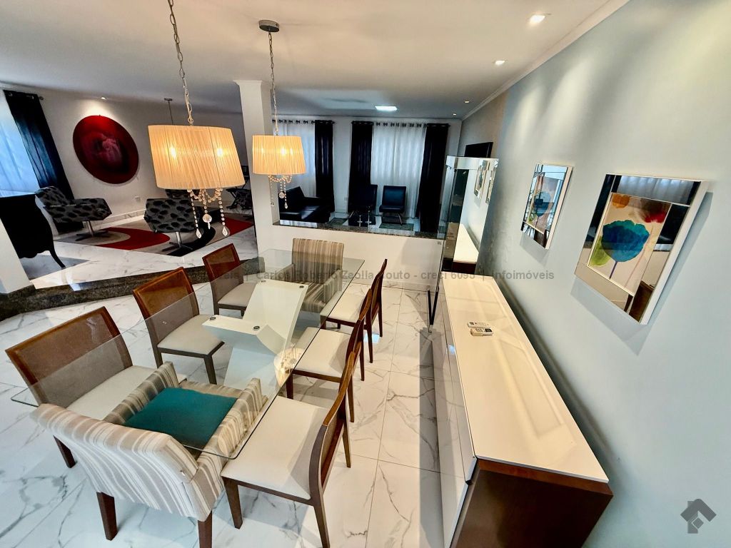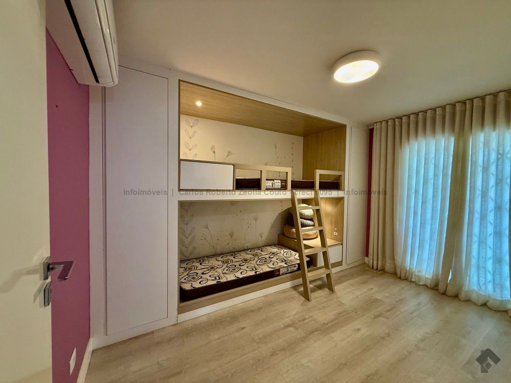 Pavimento térreo: sala 3 ambientes, jardim de inverno, lavabo, cozinha, despensa, quarto de empregada com banheiro. Pavimento superior (1º andar): 1 suíte com closet, 2 quartos com sacada, banheiro social e sala ampla. Pavimento superior (2º andar): escritório, sala (studio), banheiro social, sacada e área de lazer ao ar livre com banheira de ofurô e deck de madeira. Área anexa à casa: área gourmet climatizada e fechada, com sala ampla, churrasqueira e giragrill, bancada de pia contendo fogão e coifa embutidos, painel com TV e mesa de mármore central. Área superior à área gourmet: contém uma sala e uma suíte. 2 vagas de garagem cobertas e 3 vagas de garagem descobertas. Amplo espaço livre de terreno.