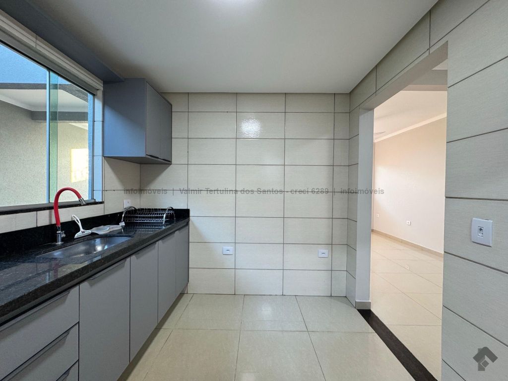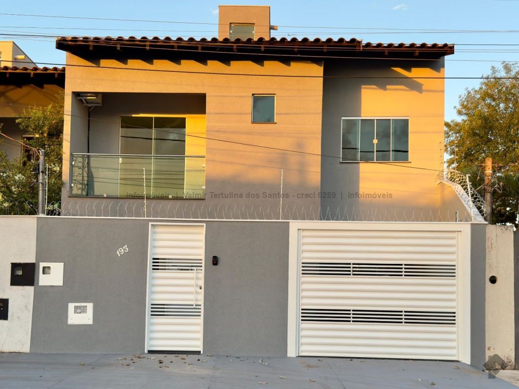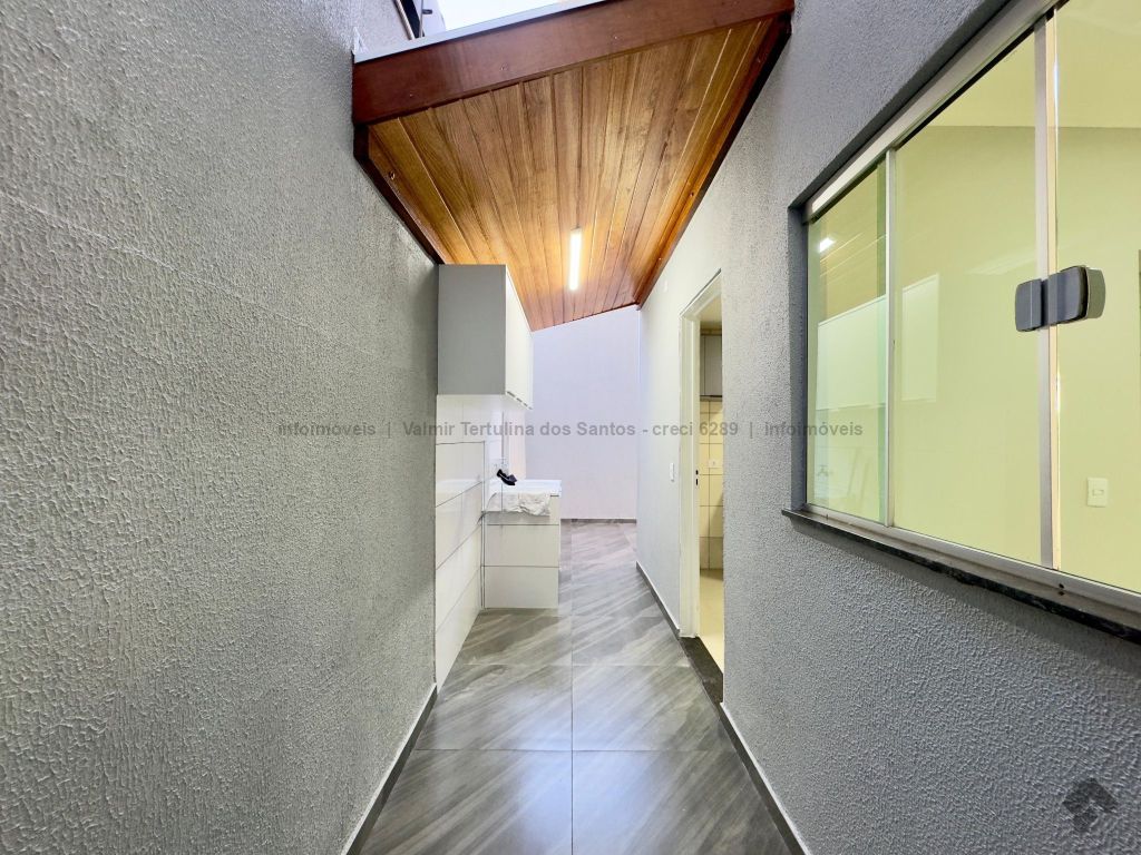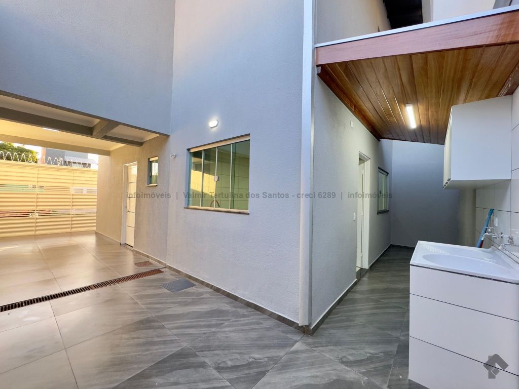 Disposição na parte inferior, vagas para 2 carros, varanda na frente e nos fundos, lavanderia coberta, sala, cozinha planejada. Na parte superior, 1 suíte com armários, mais 2 quartos com armários, 1 banheiro social.