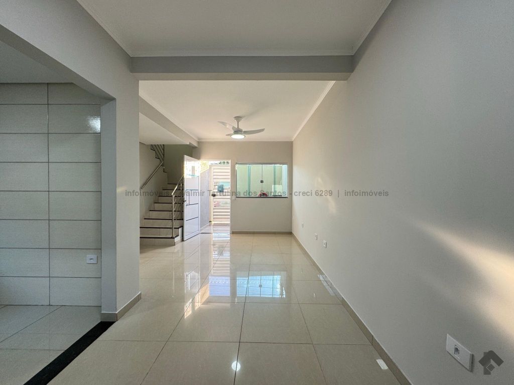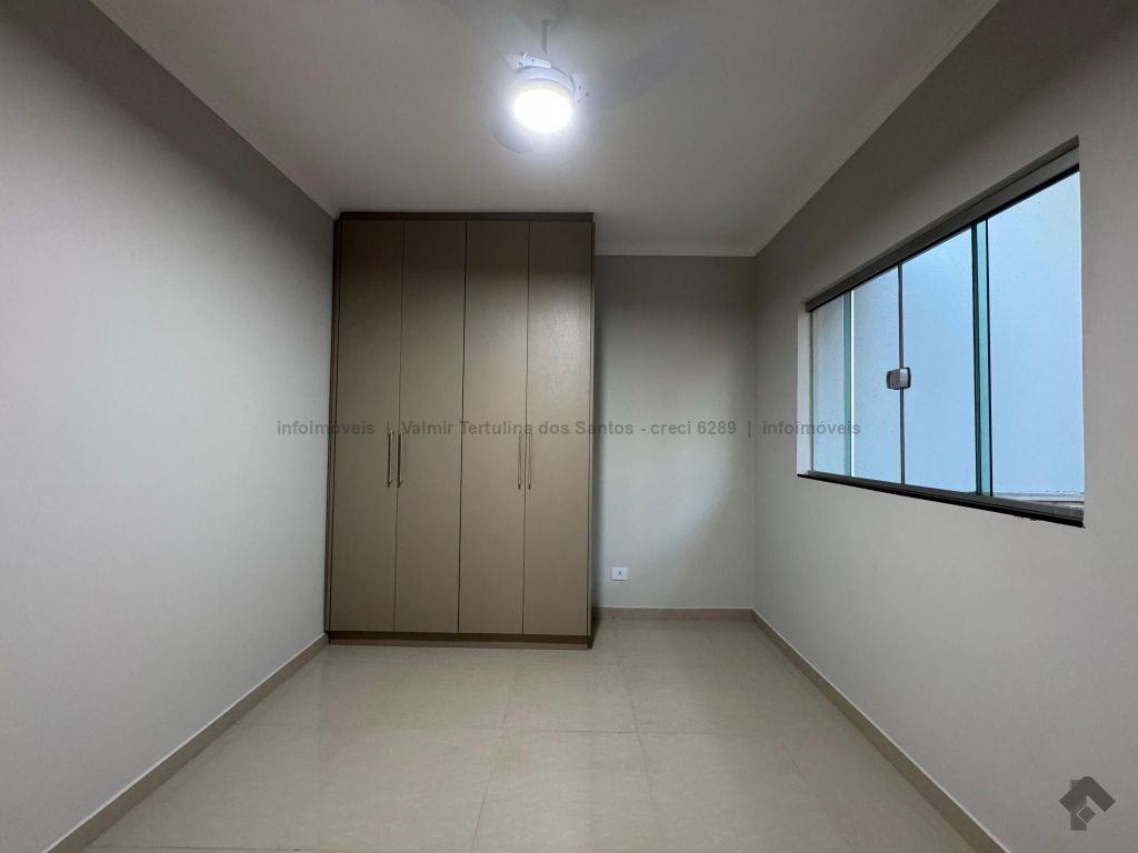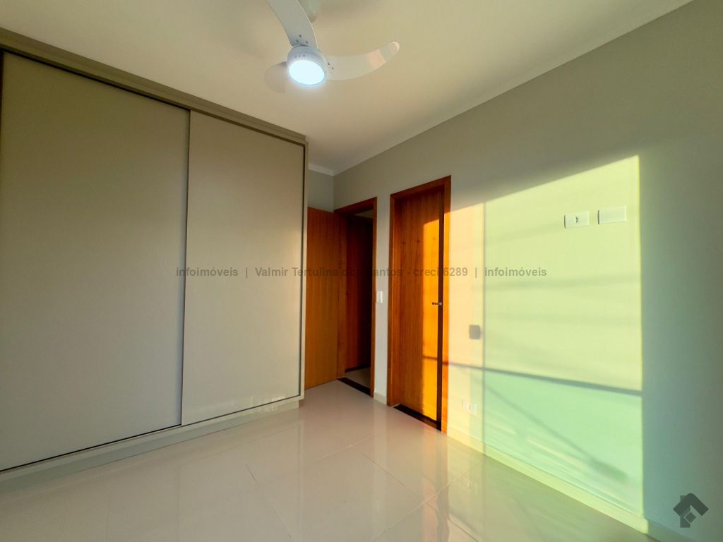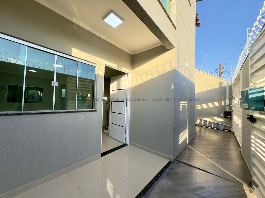 Disposição na parte inferior, vagas para 2 carros, varanda na frente e nos fundos, lavanderia coberta, sala, cozinha planejada. Na parte superior, 1 suíte com armários, mais 2 quartos com armários, 1 banheiro social.