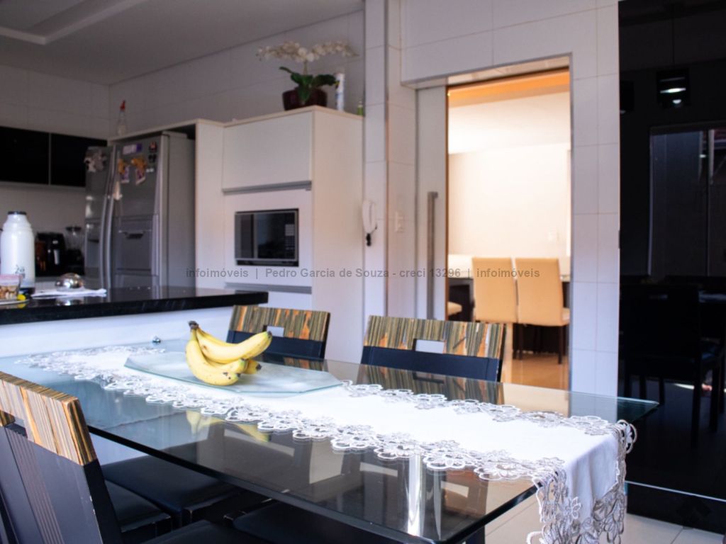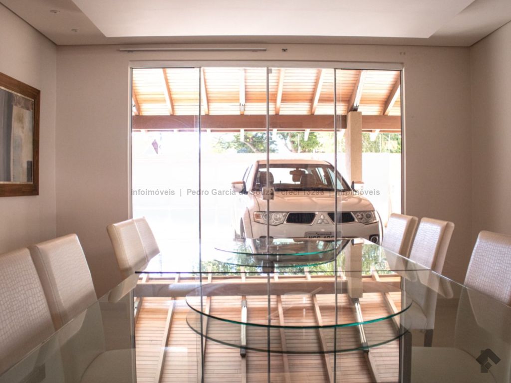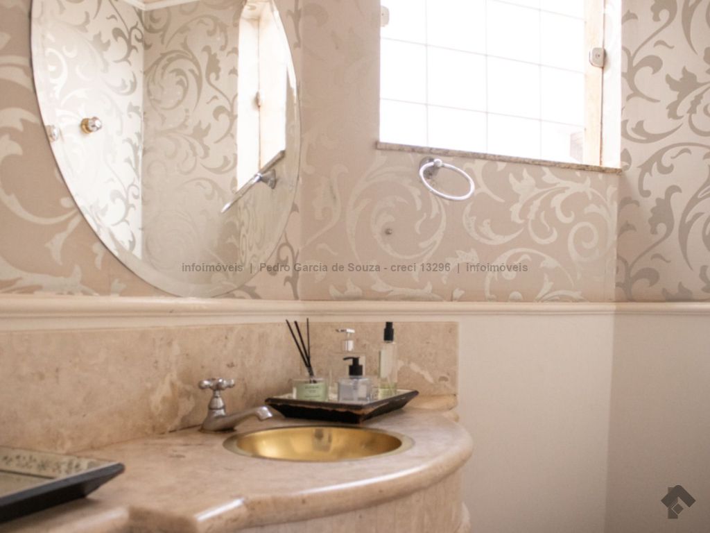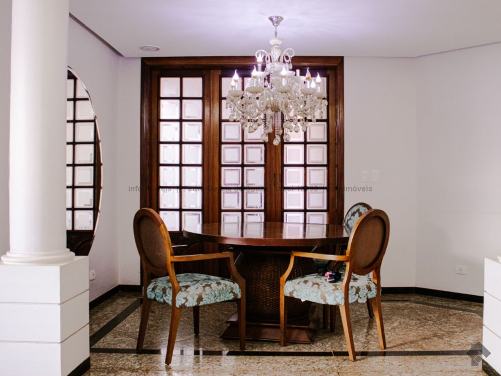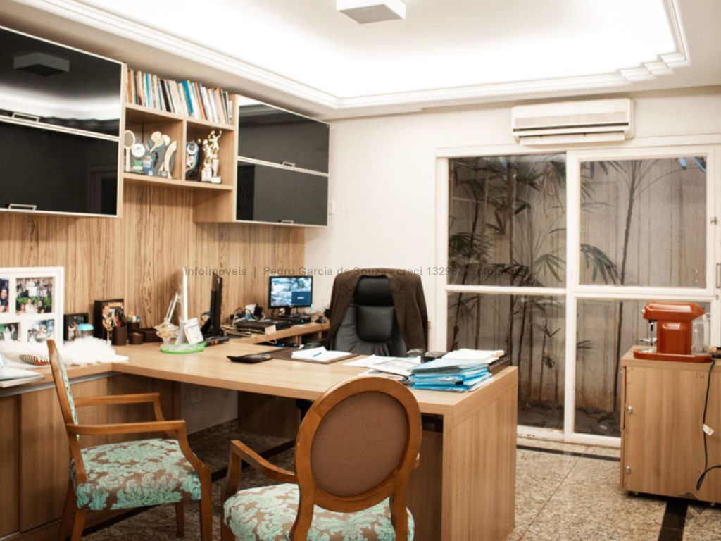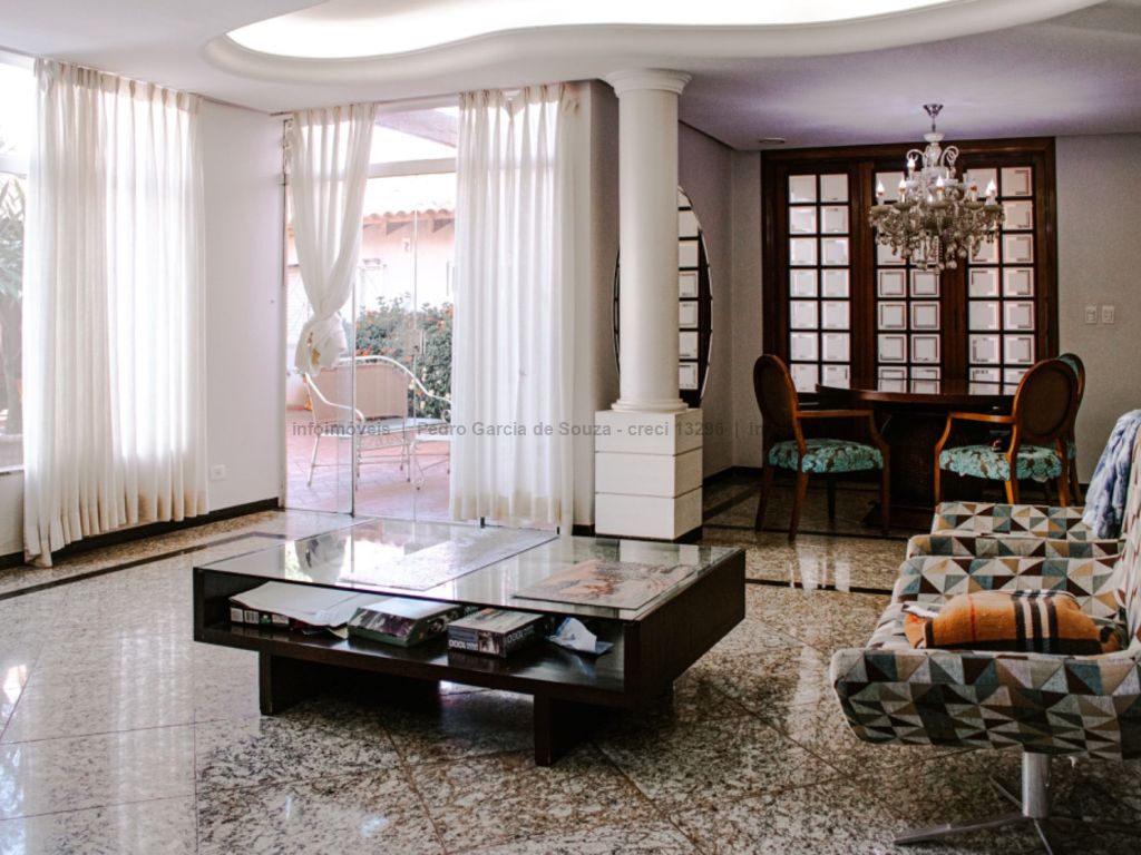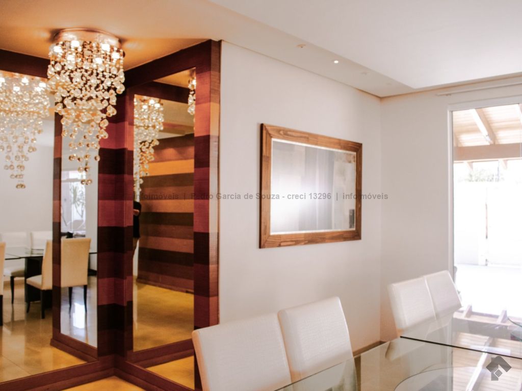 Com 720m² de terreno e 686m² de área construída, o primeiro piso dispõe de jardim, hall de entrada, escritório com jardim de inverno e banheiro, lavabo, sala com três ambientes integrados à área gourmet, ante-sala, sala de jantar, cozinha com despensa, área de serviço, piscina com sala de manutenção e banheiro, área gourmet com edícula, dois quartos com um banheiro social e uma suíte, além de garagem para até 4 carros. O piso superior conta com iluminação natural, sala de televisão, uma suíte master, uma suíte e duas demi-suítes com mezanino.