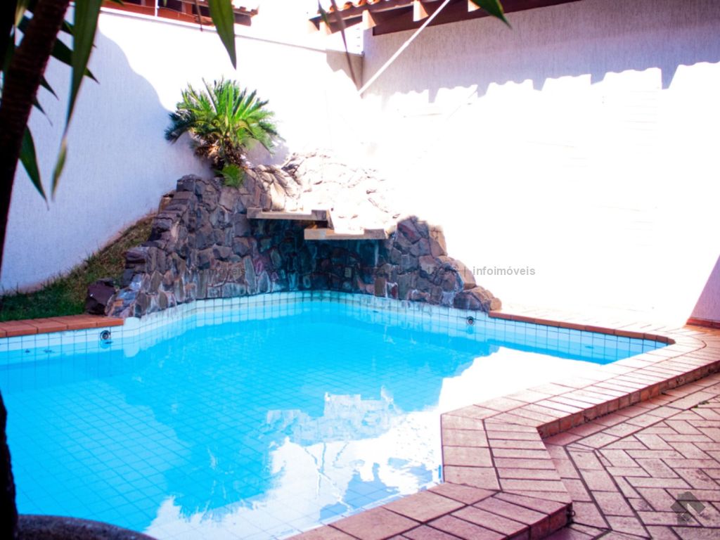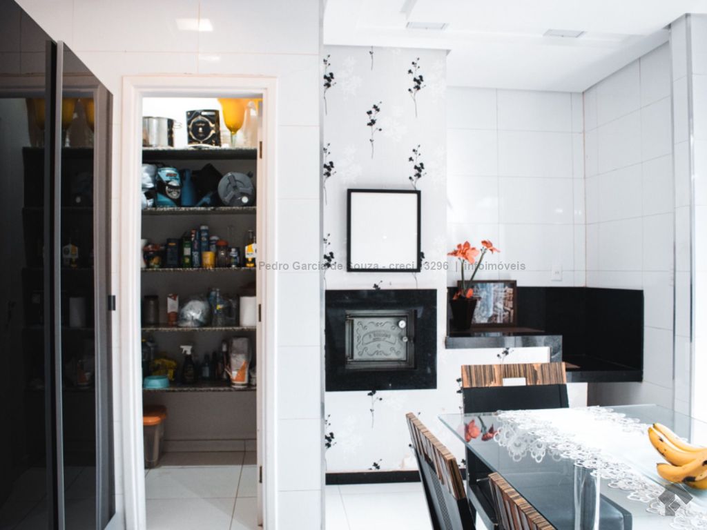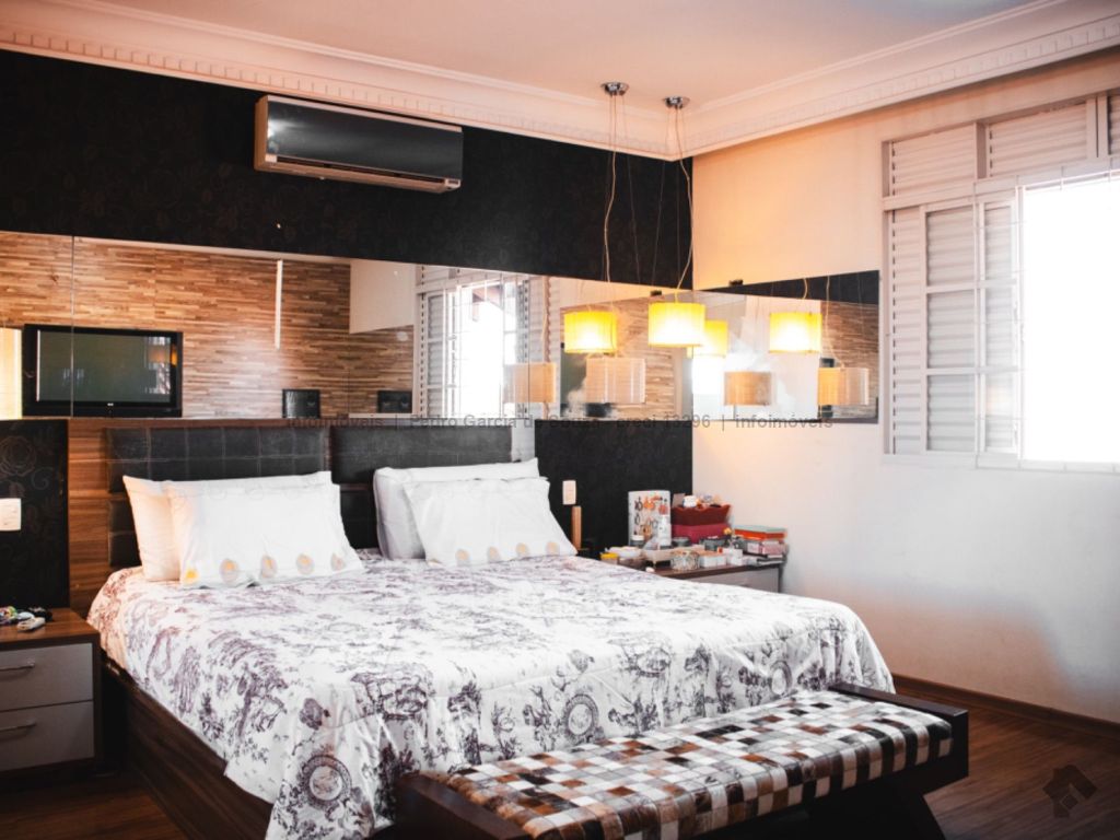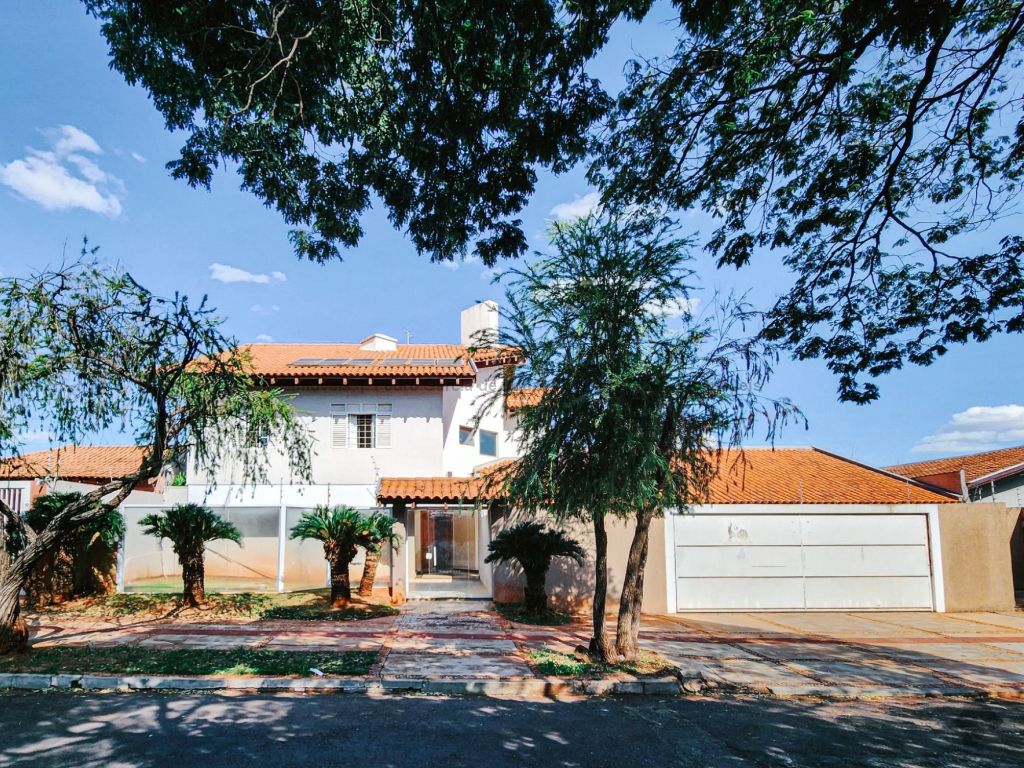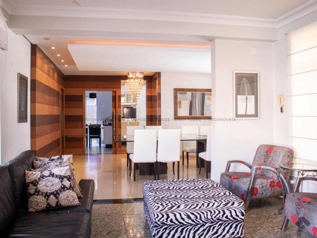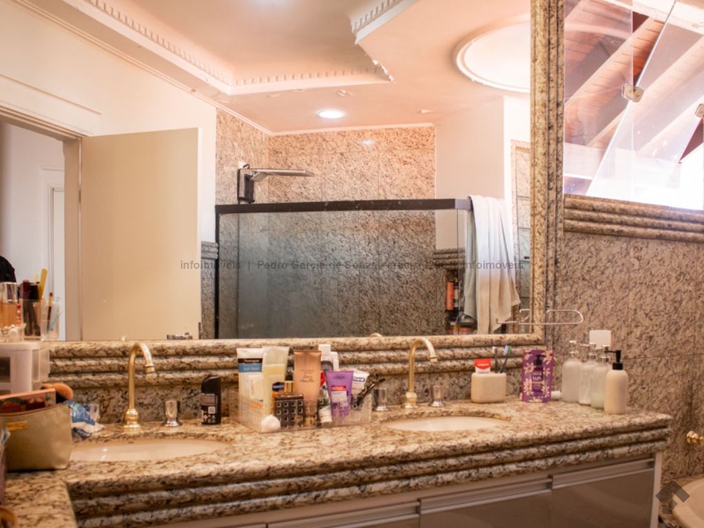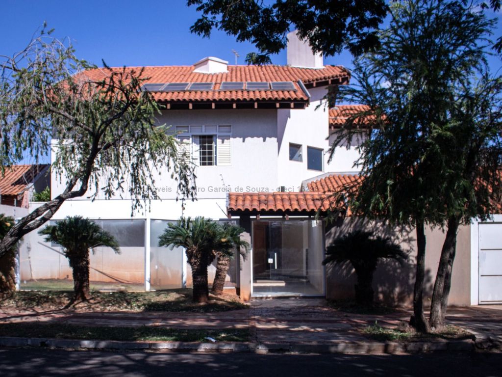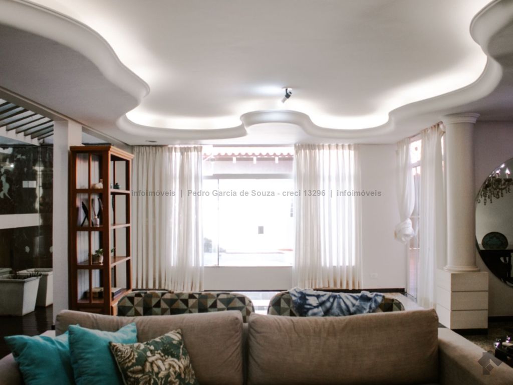 Com 720m² de terreno e 686m² de área construída, o primeiro piso dispõe de jardim, hall de entrada, escritório com jardim de inverno e banheiro, lavabo, sala com três ambientes integrados à área gourmet, ante-sala, sala de jantar, cozinha com despensa, área de serviço, piscina com sala de manutenção e banheiro, área gourmet com edícula, dois quartos com um banheiro social e uma suíte, além de garagem para até 4 carros. O piso superior conta com iluminação natural, sala de televisão, uma suíte master, uma suíte e duas demi-suítes com mezanino.