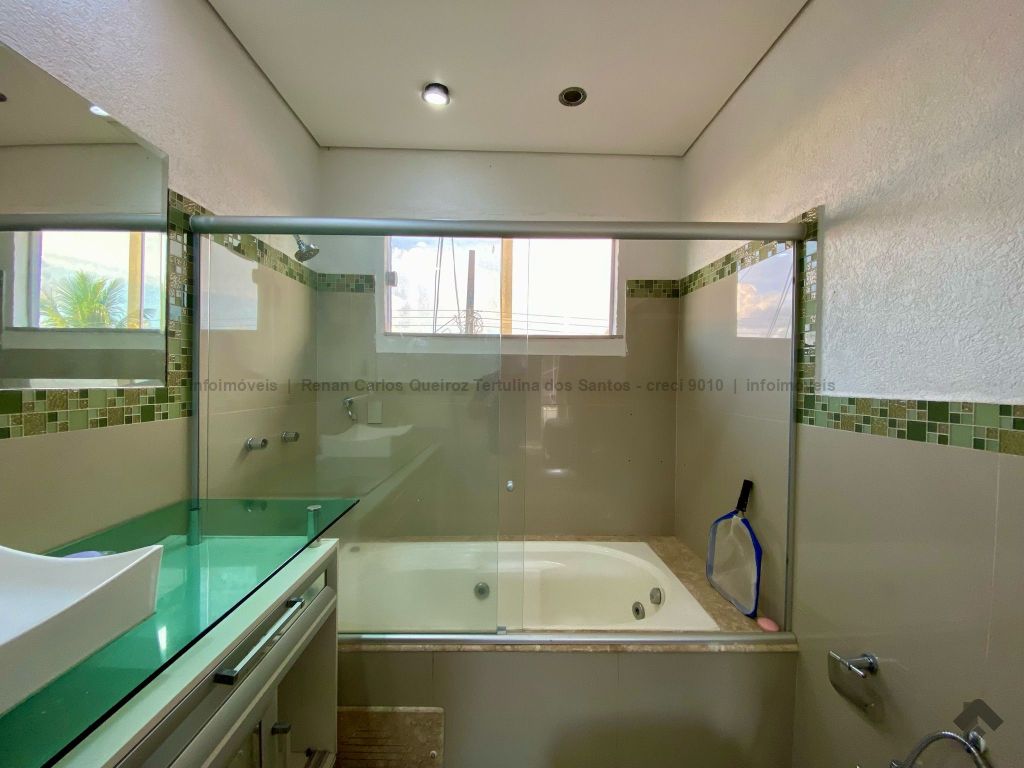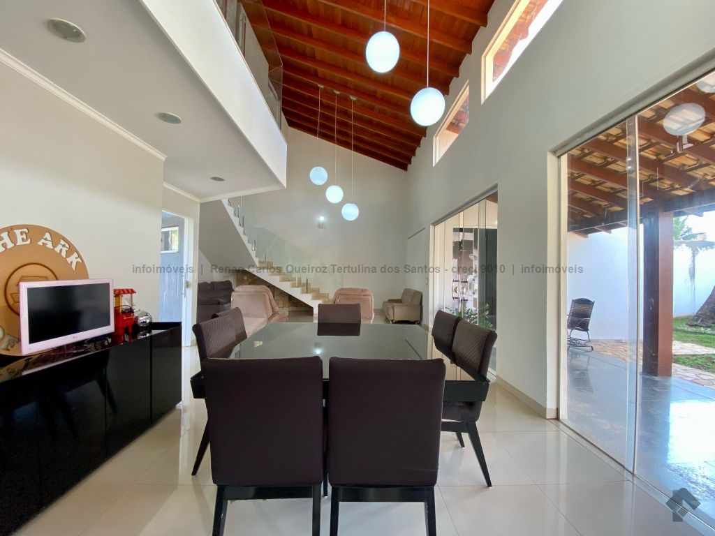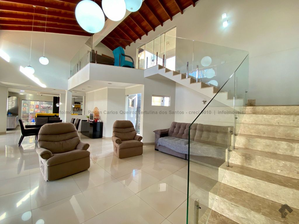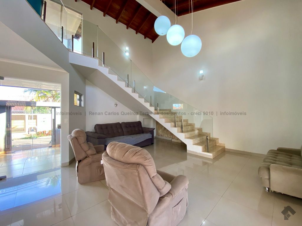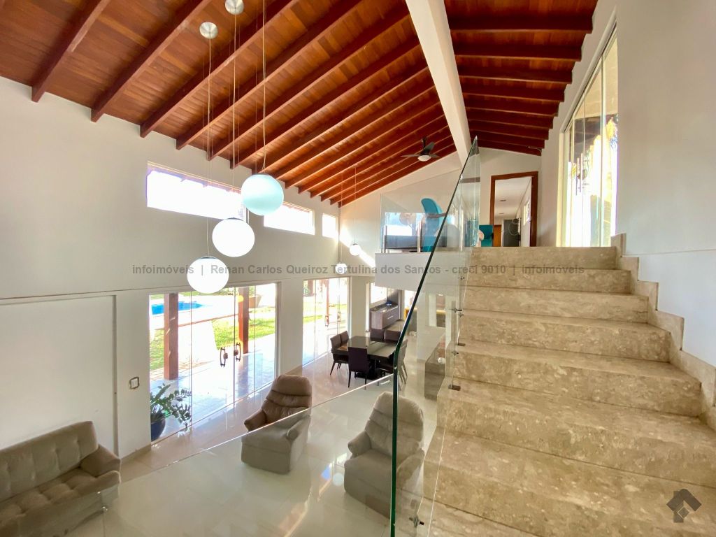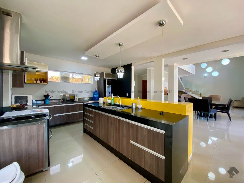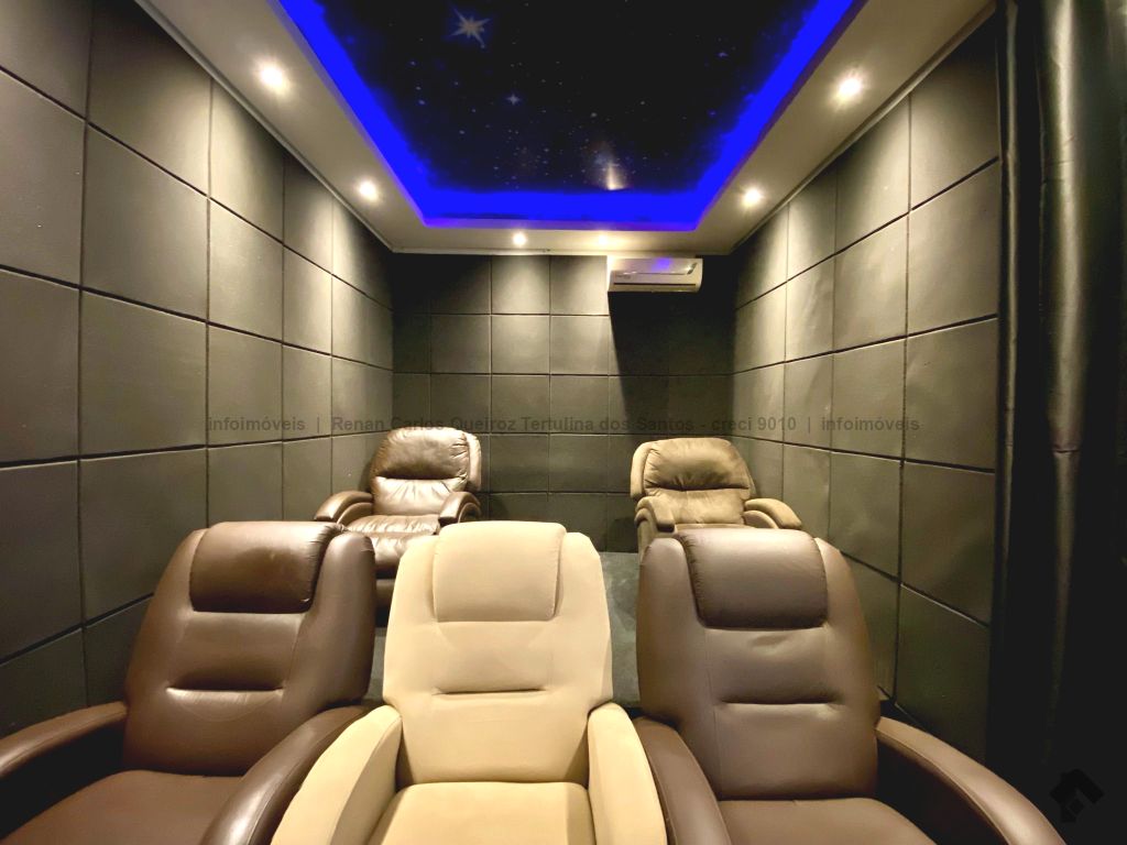 Piso inferior conta com duas suítes uma com banheira. Lavanderia, banheiro. Sala de estar, sala de Tv, sala de jantar, cozinha, lavabo. Espaço gourmet, banheiro, despensa, sala. Piso superior contém: uma sala, 03 suítes com sacada e closet, uma com banheira. Sauna, sala de cinema, piscina, quintal grande, garagem coberta.