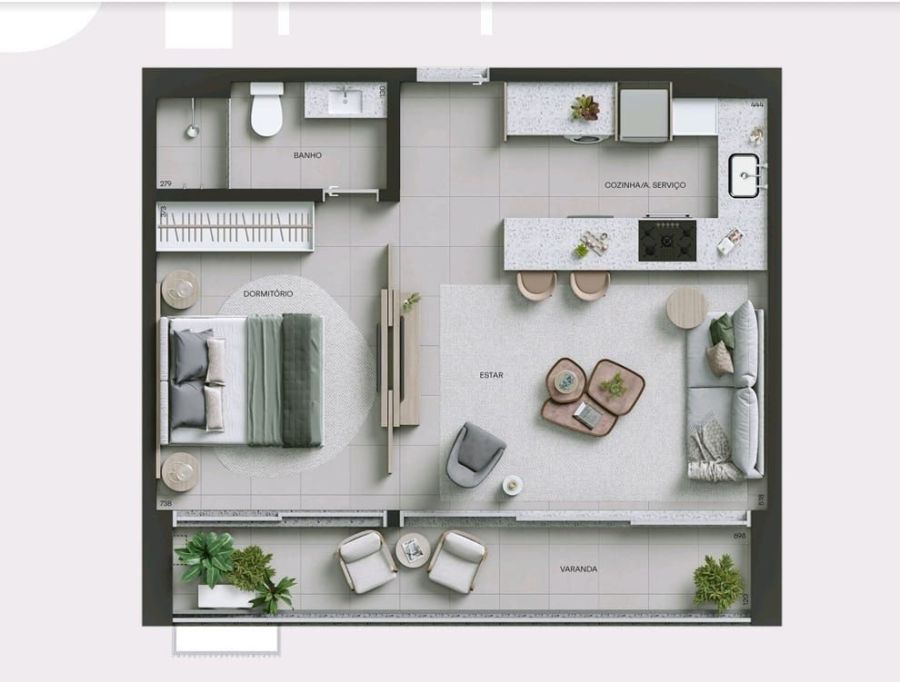 Studio de 51 m² na melhor localização de Campo Grande. O studio possui sacada ampla e vista para a rica área de lazer do empreendimento. O studio fica na torre lâmina que se posiciona na altura da copa das árvores do parque, dando a sensação de proximidade à natureza. A área comum do empreendimento possui delivery box, lavanderia, mini market, work lounge, bike place, academia, quadra de areia, solarium, piscina, playground, kids place, sports bar, chef's table, pomar, horta, lounge, vagas de visitantes, redário e acima da torre lâmina possui também sunset lounge, piscina com borda infinita, terrace gourmet lounge.