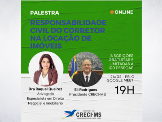 O CRECI-MS promove palestra com o tema “Responsabilidade Civil do Corretor na Locação de Imóveis” nesta quinta-feira, 24 de fevereiro, pelo Google Meet, às 19h (MS). As inscrições são gratuitas e limitadas a 100 pessoas.